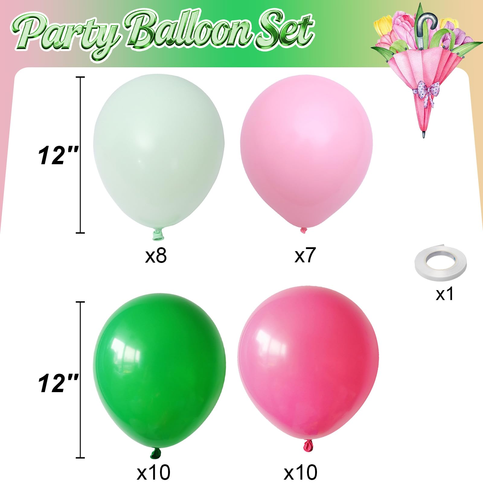 Froova Pink and Green Balloon Set – Fresh Charm for Nature-Inspired Celebrations Add a lively yet elegant touch to your party with this balloon set, featuring a refreshing mix of hot pink and sage green tones. Designed for woodland and safari baby showers, tropical Hawaiian parties, weddings, summer birthdays, and other nature-inspired celebrations. Harmonious Color Mix: Includes 8 macaron light green balloons, 10 matte dark green balloons, 10 matte hot pink balloons, 7 macaron pink balloons, and 1 ribbon. The balanced pink and green palette offers versatile styling options for playful yet refined party decor. Notes: - Balloon colors may vary slightly before and after inflation and under different lighting conditions. - Keep balloons away from sharp objects, high heat, and excessive friction to avoid bursting. Let Froova’s pink and green balloons bring a fresh, joyful, and nature-inspired vibe to your celebration! 🎈🌿 Not suitable for children under 12 years. For use under adult supervision