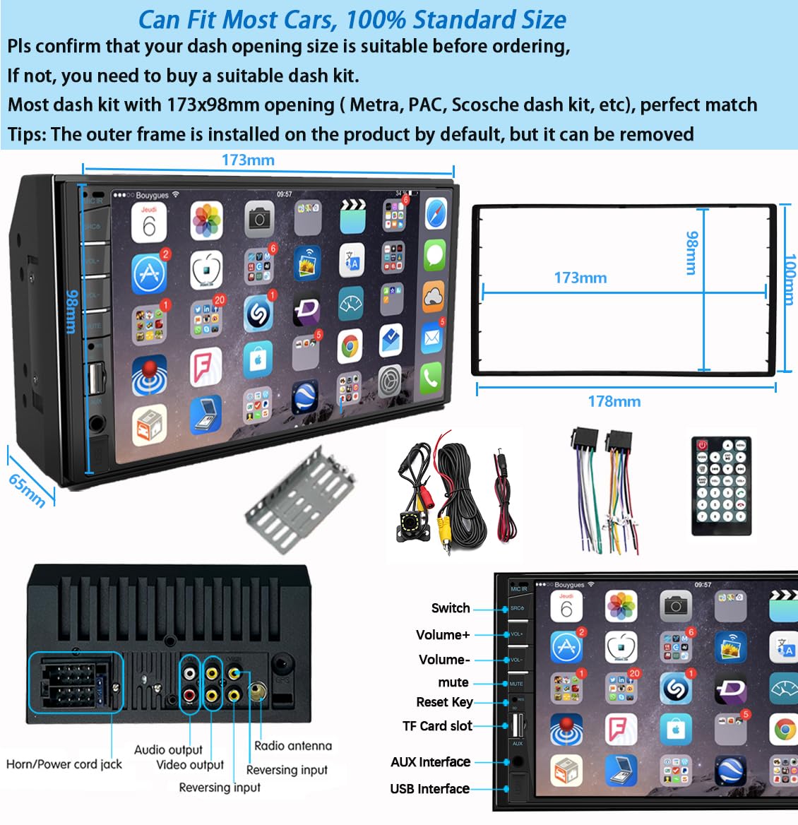 【Car Stereo Size】7-inch in-dash head units with a minimal front panel size of 171(L)*65(W)*97(H)mm/6.73(L)*2.56(W)*3.82(H)in (fitting the mounting frames commonly available). If needed, an extra frame adapter is also included to expand it to 178(L)*65(W)*100(H)mm/7.01(L)*2.56(W)*3.94(H)in.