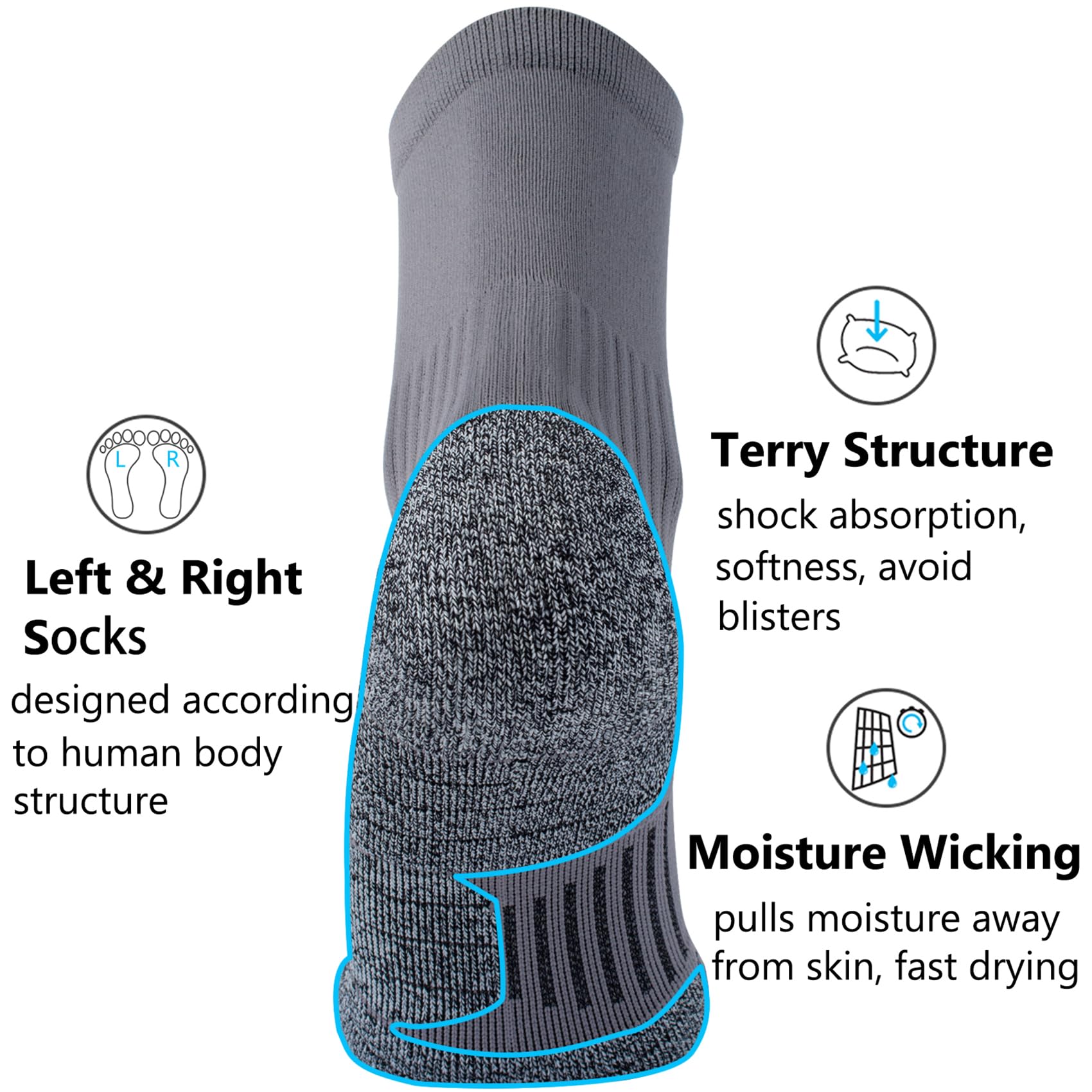 UNIQUE SOLE: Moisture wicking fibers pull moisture away from skin; Cushioned, more soft and comfy, shock absorption; Design LEFT AND RIGHT SOCKS according to the plantar structure
