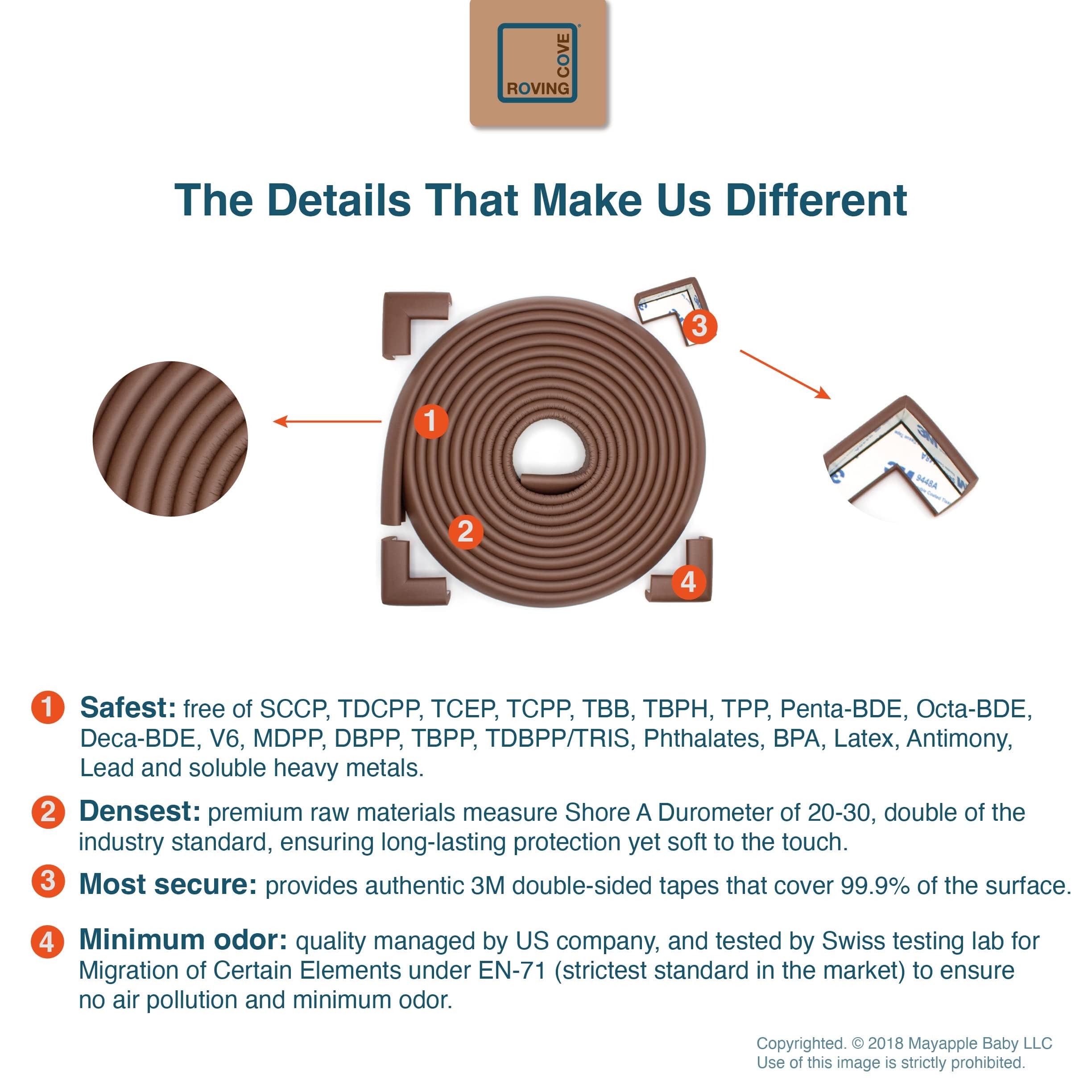 CLEAN SAFETY: Roving Cove uses safe and pure raw material and was the first brand to make foam safety bumpers without the use of toxic flame-retardant chemicals (SCCPs). Our edge corner guards contain no BPA, no phthalates, no heavy metals, no latex, no SCCPs. Inherently flame-resistant; passed flammability tests under US regulations.