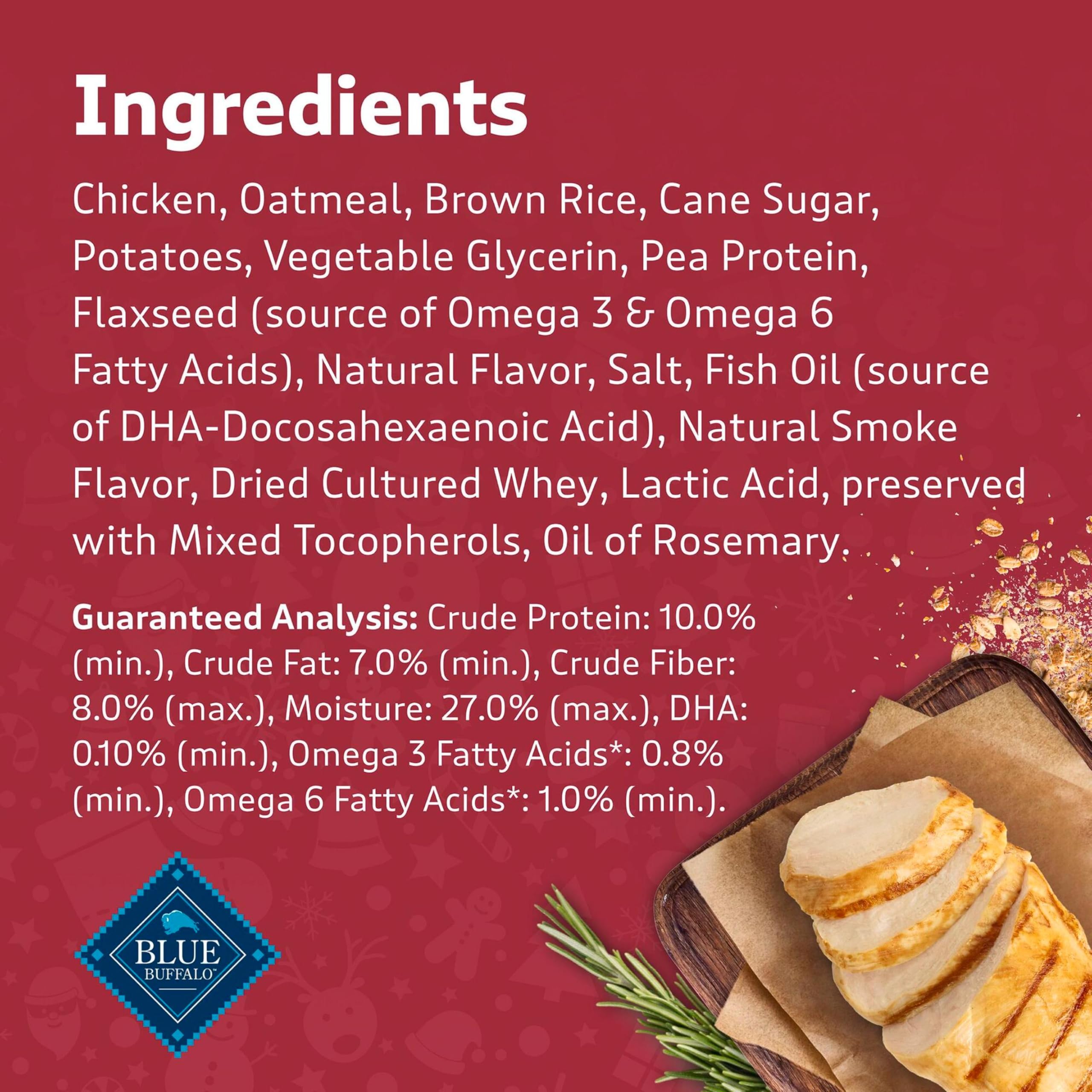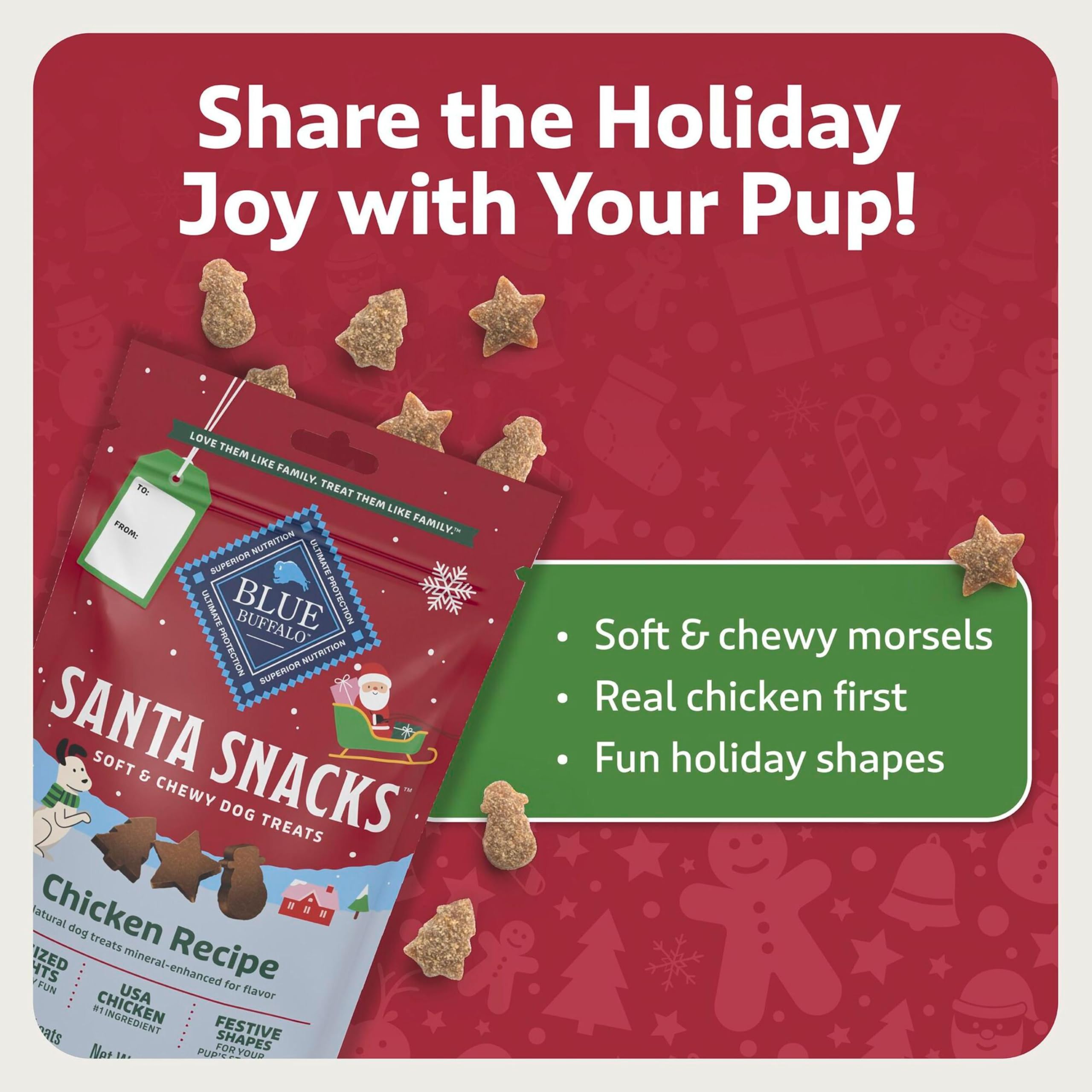REAL CHICKEN FIRST: BLUE Santa Snacks soft dog treats prove that a healthy treat can be tasty, too; Starting with real chicken, these bits feature the ingredients you’ll be proud to feed your furry family members