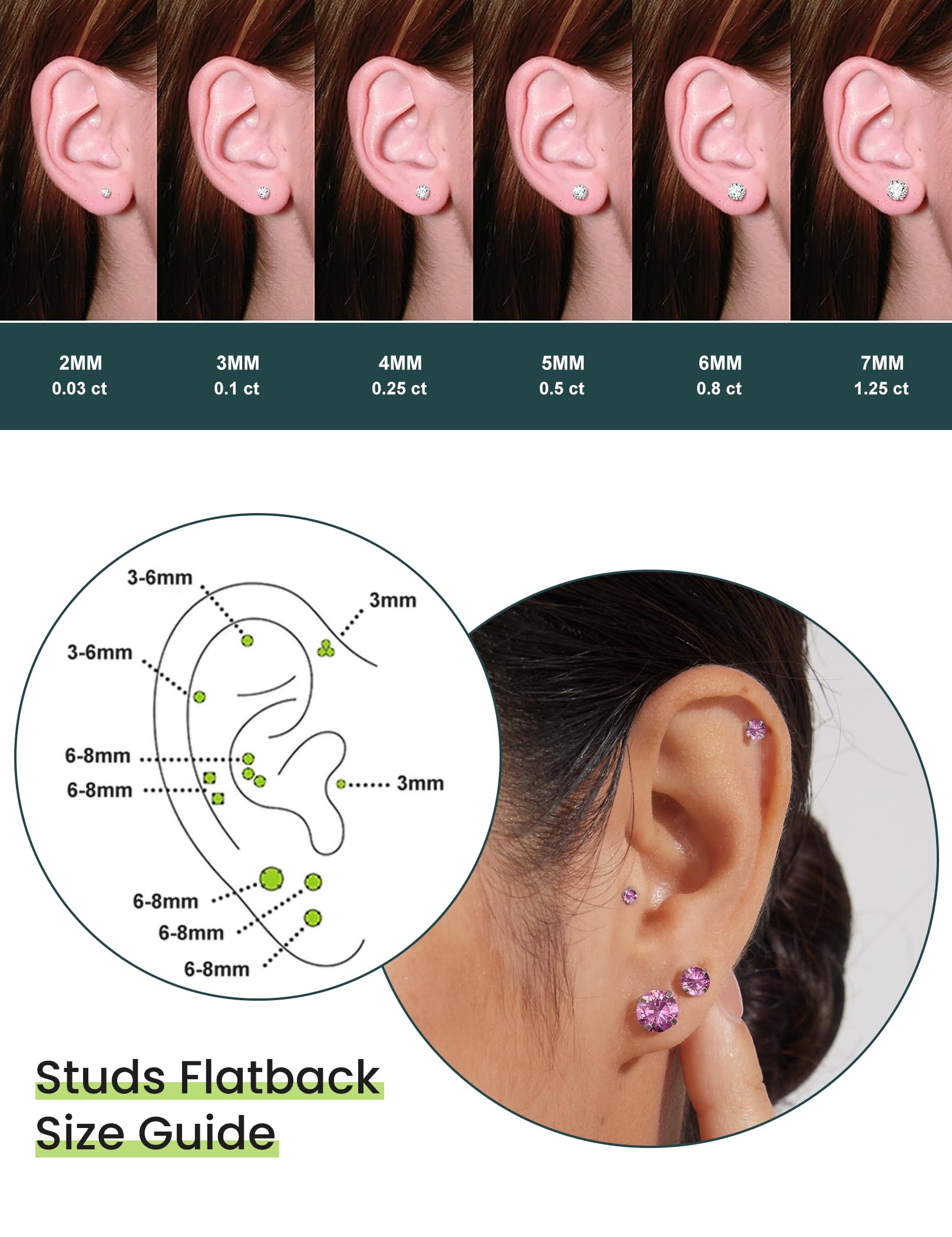 SET OF 6 PAIRS - Package includes 6 pairs of stud earrings in 5 sizes, 2mm/3mm/4mm/5mm/6mm/8mm. Gauge Size: 20G =0.8mm, pin size: 10 mm. The butterfly buckle add extra protection for you.