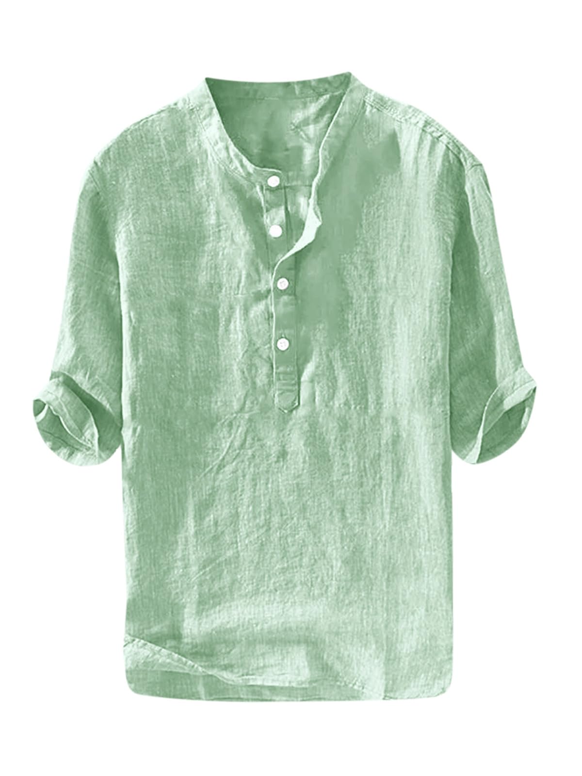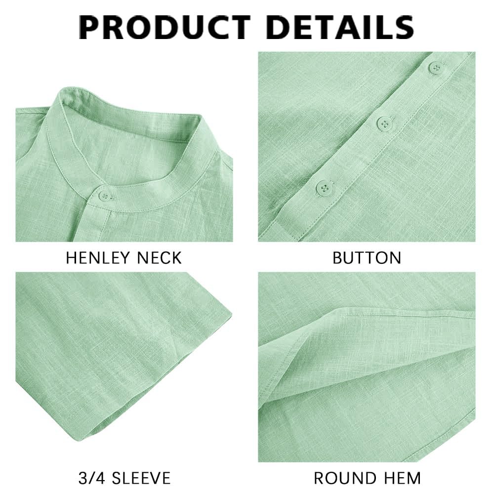 FEATURE -- Regular-Fit style, four-button henley placket, solid color, one chest pocket, 3/4 long sleeve. Simple design will not go out of style.