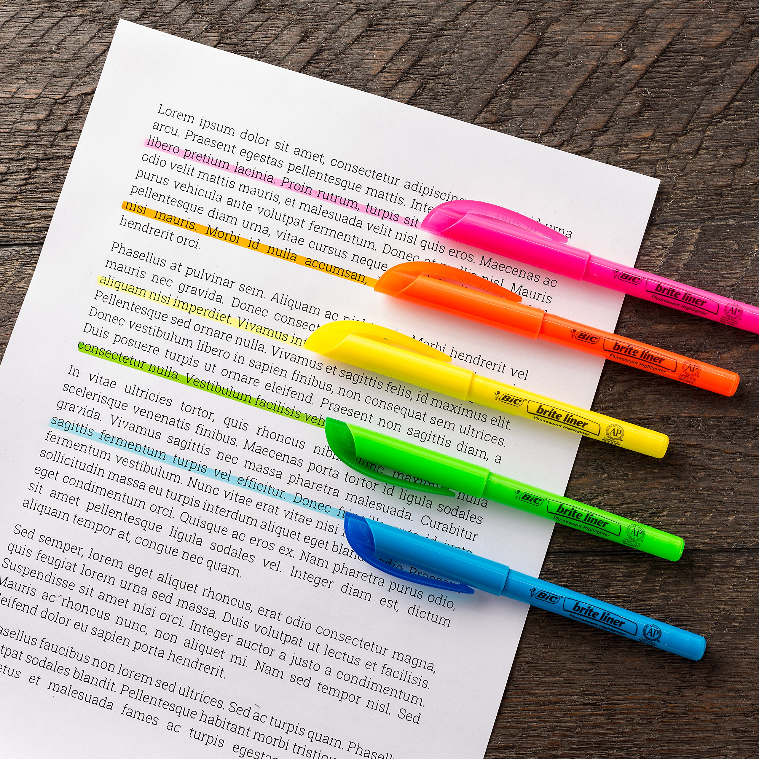 Highlighter set with translucent ink that emphasizes what's important on the page without obscuring the highlighted text