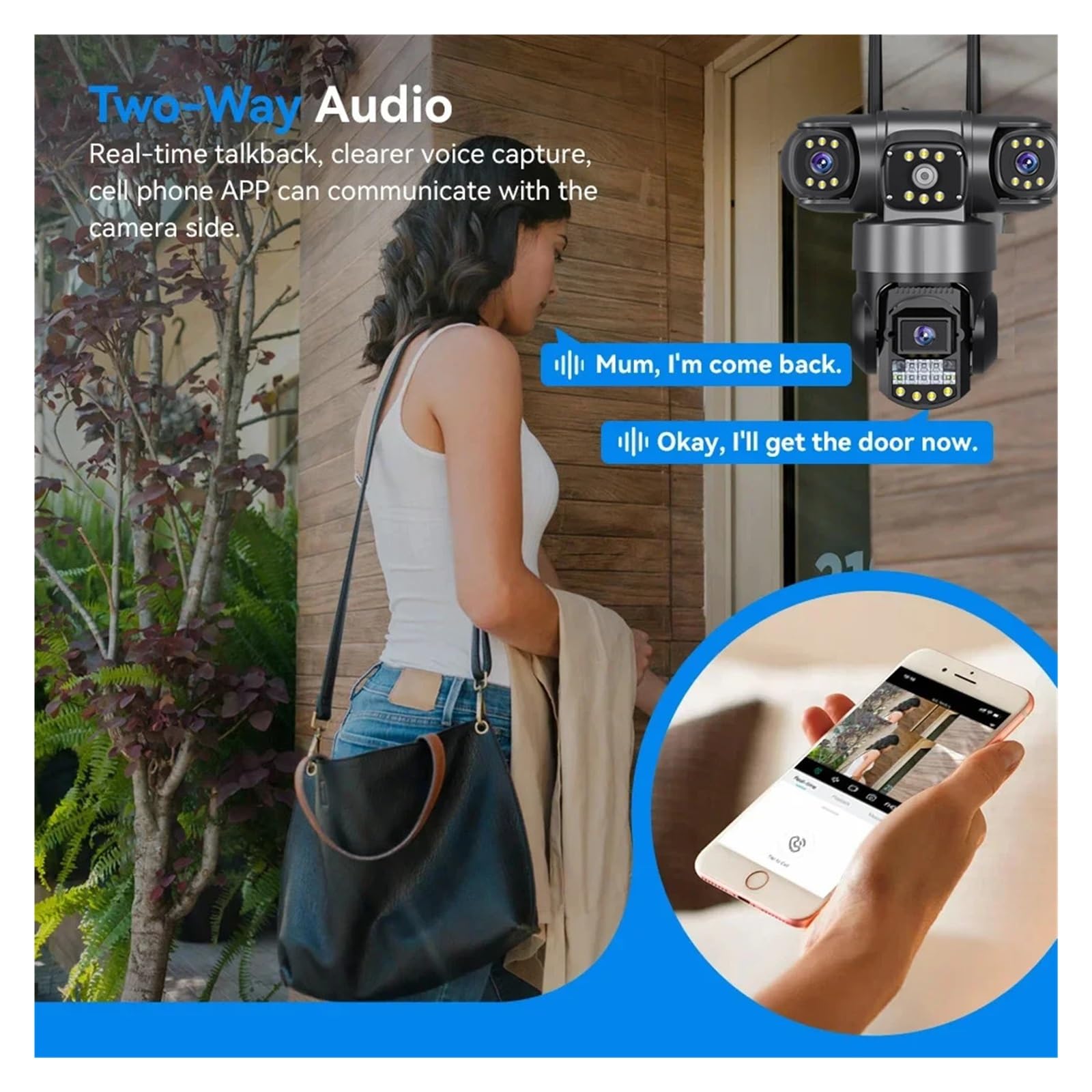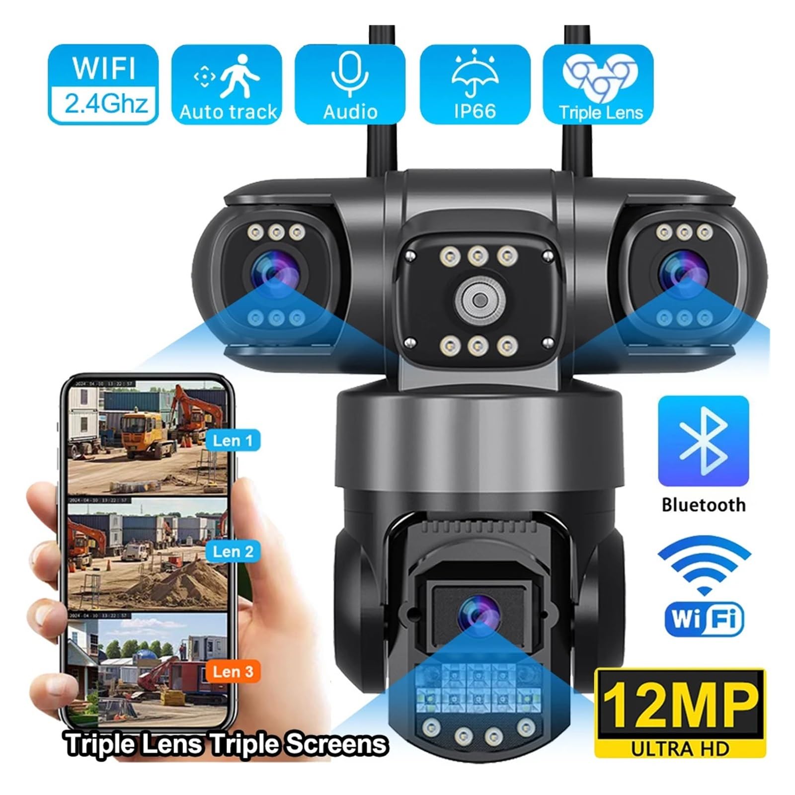 ========== Zoom type: Digital zoom Zoom: 10 times Number of lenses: Three lenses AI function: Motion detection Shell material: Plastic Color night vision: Yes Operating temperature: -10° C to 60° C IP rating: IP66 Power supply mode: Municipal power supply Rechargeable battery: None Scene: Indoor and outdoor Range of movement (tilt) : Others Range of movement (translation) : Others One million pixels: 4 million pixels TF card: None Power supply: Normal Internal storage: 128G Installation methods: wall-mounted, hanging, pole-mounted Colour: Black is_customized: Yes Audio output: Bidirectional audio Minimum illuminance (Lux) : 0.1 Lux Perspective: 80° Video compression format: H.265 Red equidistant (m): 10 meters Dimensions (length × Width × depth) (mm) : WiFi IP camera Power supply (V): 12V Alarm action: Local alarm Features: Waterproof/weatherproof Sensor: CMOS Lens (mm) : 4mm Connection: WIFI (2.4GHz) High definition: 12 million pixels Style: Box camera Smart Home Platform: Others Power supply: Mains electricity APP: V380 Pro Resolution: A total of 12MP for the three lenses The camera in the upper left corner: 4MP resolution Left and right lenses: 4MP resolution Bottom camera: 4MP resolution Pan-tilt: Horizontal rotation: 355°, vertical rotation: 90° Network connection: 2.4Ghz WiFi, AP hotspot, RJ45 network port Night vision: The IR-CUT switch is automatic, approximately 5-10 meters Audio: Supports two-way audio Alarm: Motion detection and image push Feature 1: Outdoor camera wifi waterproof Feature 2: Wi-Fi camera wireless Function 3: V380 Digital Camera Feature Four: Closed-circuit Television security camera Function 5: Night vision video surveillance Feature 6:WIFI Security Protection Function 7: Camera wifi zewnetrzna Function 8:12MP 6K triple-lens c