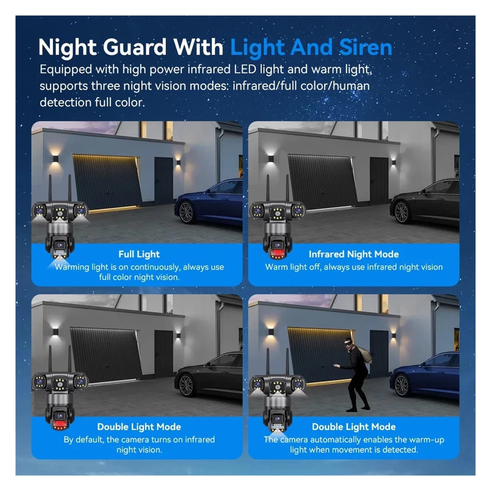 【Three lens 6K ultra clear monitoring】(Dual fixed lens+PTZ pan lens), with a total pixel count of 12MP (single lens 4MP), supporting 6K resolution output. Whether it's long-distance license plate recognition or close-up facial expressions of people, they can be clearly presented. Dual fixed lenses provide 180 ° wide-angle panoramic coverage. The gimbal lens supports 320 ° horizontal rotation and 90 ° vertical rotation, combined with 10x digital zoom, achieving 360 ° blind spot monitoring.