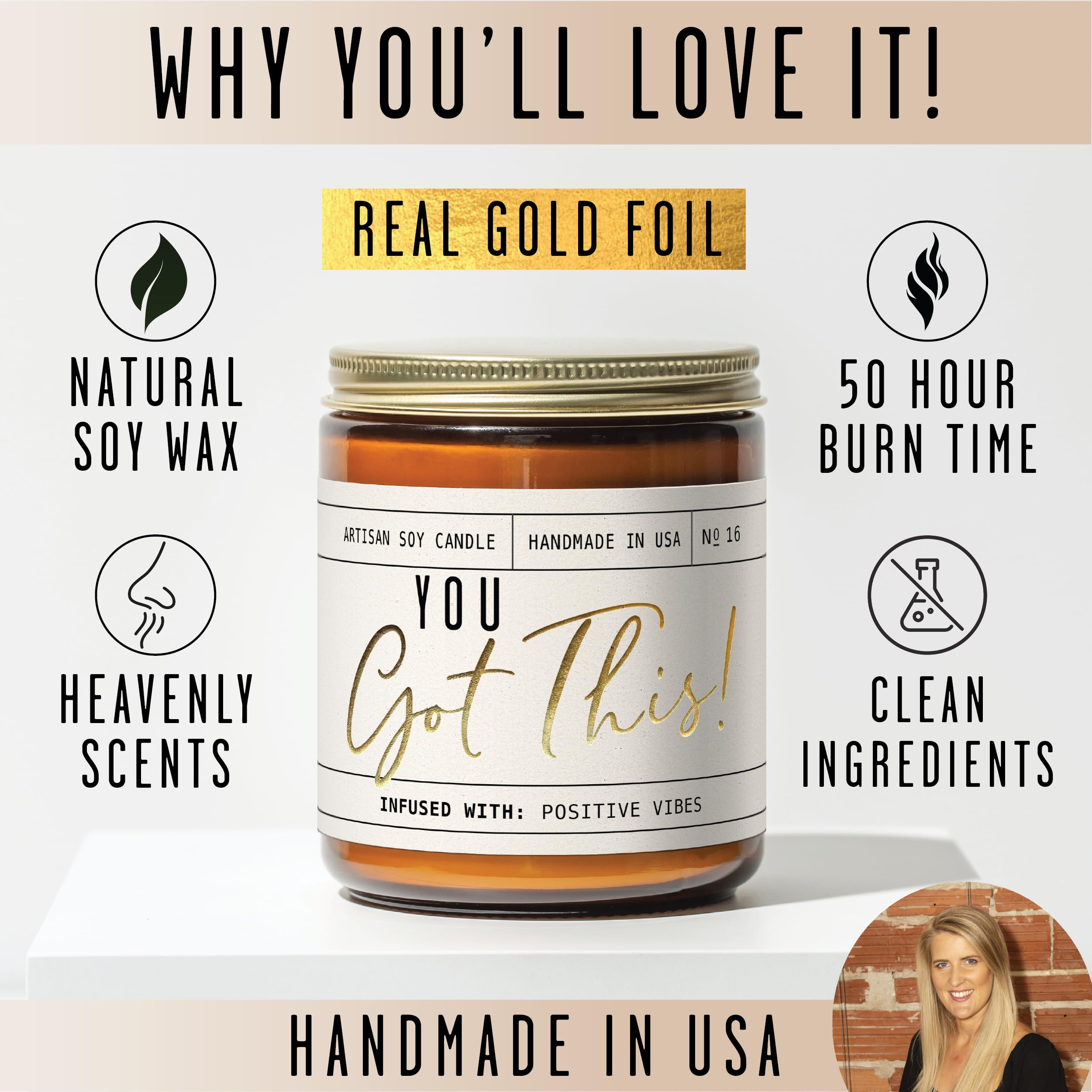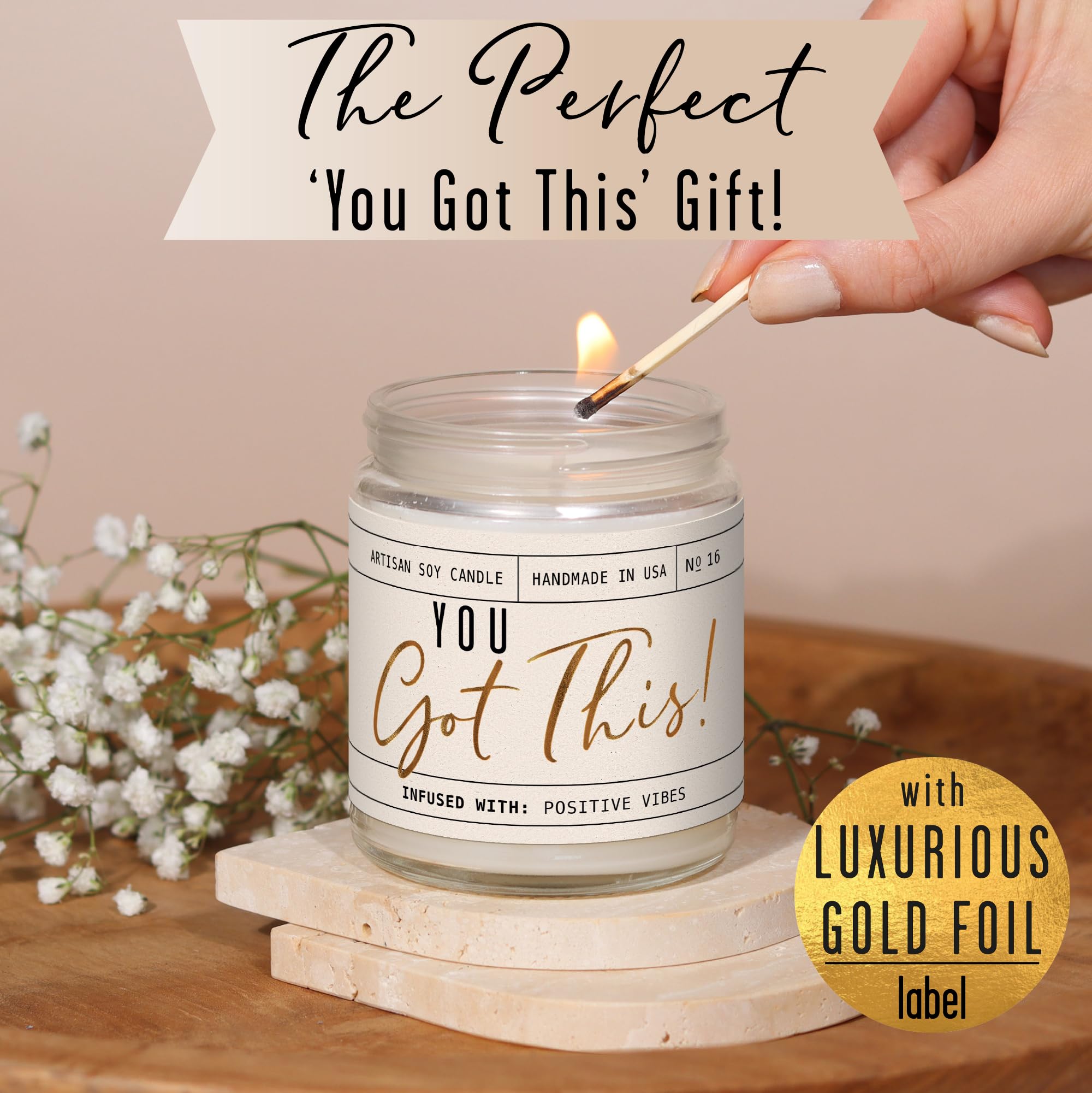 ENCOURAGING GIFT FOR A FRIEND – Treat your BFF to our elegant “You Got This’ candle to give her the support and encouragement she needs. Featuring beautiful gold foil script, it’s sure to cheer her up and take pride of place in her home.