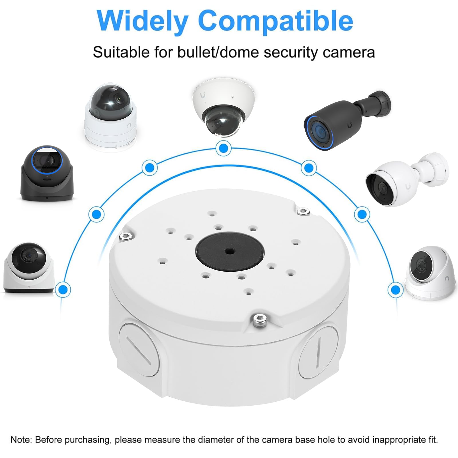 【Junction Box Compatible with Ubi-quiti Camera】Engineered for perfect fit with 18+ popular models:UVC-AI-Bullet , UVC-AI-PRO , UVC-AI-DSLR , UVC-AI-Dome , UVC-AI-Turret ,UVC-G6-Bullet,UVC-G6-Turret,UVC-G6-Pro-Turret,UVC-G6-Dome,UVC-G6-Pro-Dome,UVC-G6-180,UVC-G5-Turret-Ultra,UVC-G5-Pro,UVC-G5-Bullet,UVC-G4-Pro,UVC-G4-Bullet,UVC-G3-Pro,UVC-G3-Bullet. No drilling, adapters, or modifications—just plug and play.