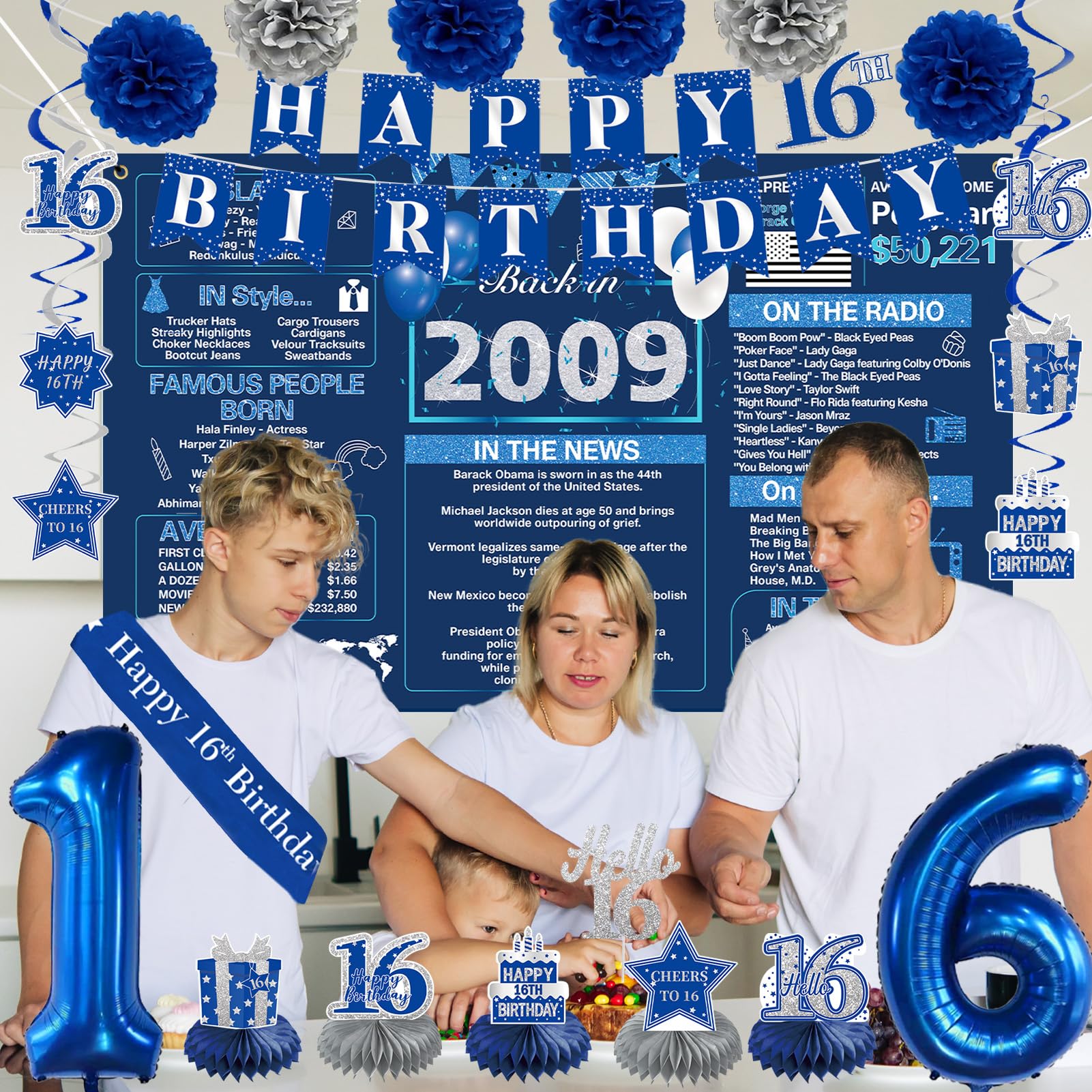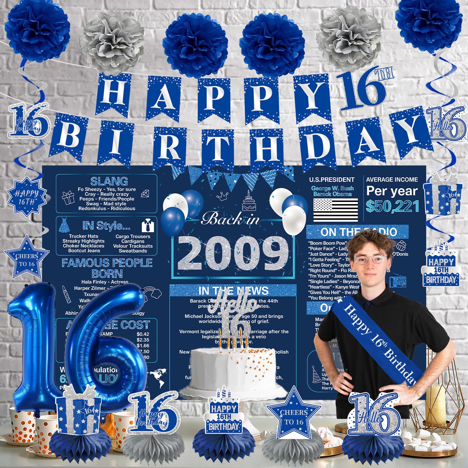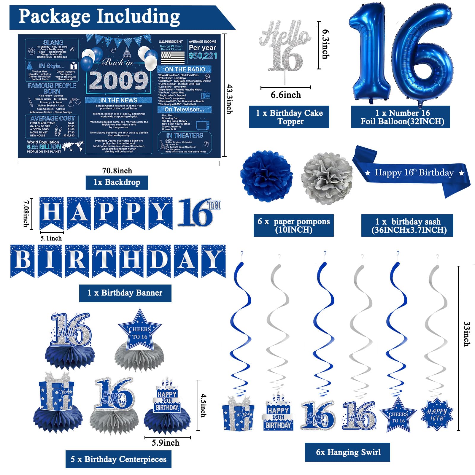 【16th Birthday Decorations】- Use the blue and silver back in 2009 birthday banner as the perfect shooting background, paired with a hanging swirls, paper pom poms, cake topper, sash, and number 16 balloon. Using them to create unforgettable time for your 16th birthday party, creating a pleasant atmosphere for your friends and family, will be the perfect way to take photos at the party.