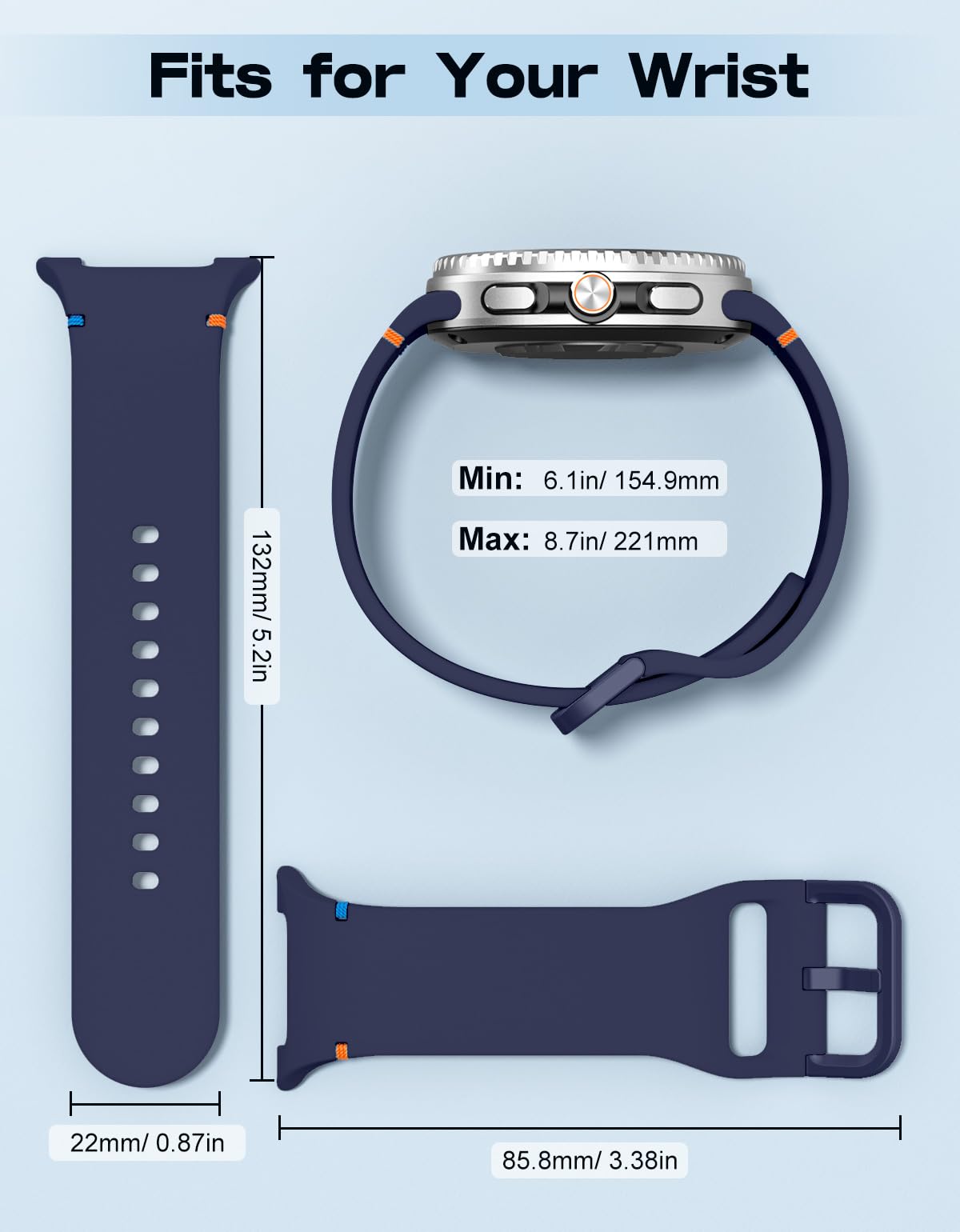 Wrist Size: The Galaxy Watch 8 40mm band is available in a variety of colors to match different outfits and moods. Suitable for women and men. It is adjustable, S/M fits 5.3" - 7.5" (134.6 mm - 190.5 mm) wrists and M/L fits 6.1" - 8.7" (154.9 mm - 221 mm) wrists. The metal buckle holds the watch securely in place, and you can also tuck the band underneath.