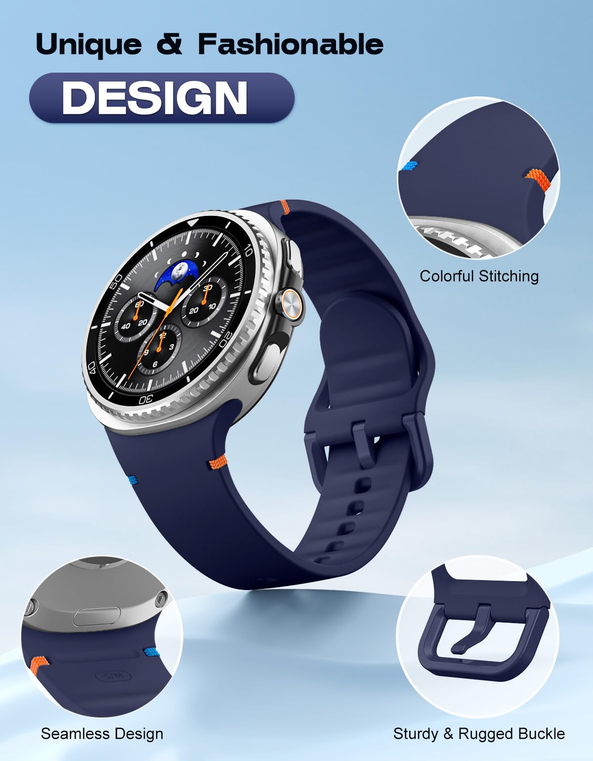 Seamless Design: The Galaxy Watch 8 band is accented with colorful stitching, adding a touch of elegance to your wrist, and the rippled design inside the band allows for easy drainage and quick drying of sweat. It has a lugless design that blends seamlessly into the body of the watch, ensuring a sleek look and comfortable fit, especially during intense exercise.