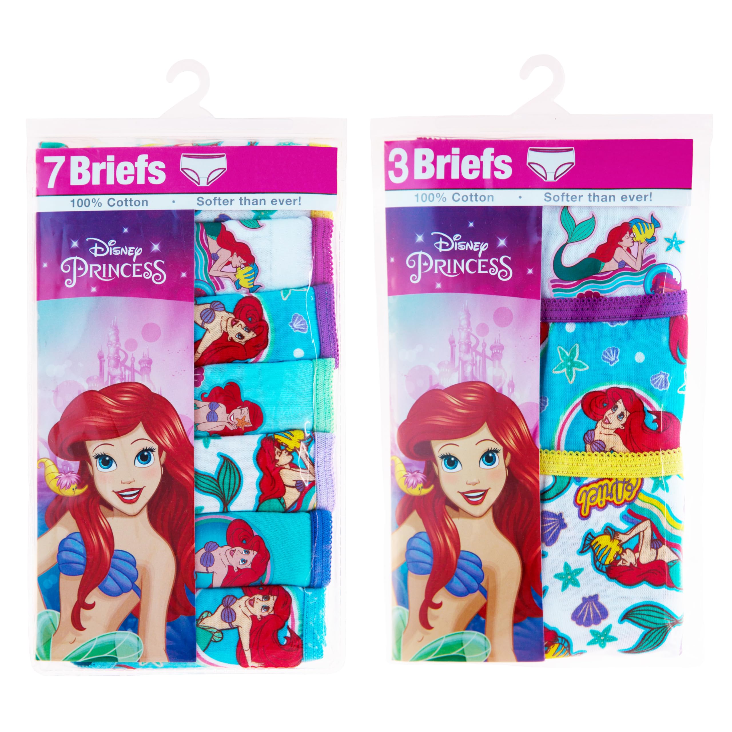 Description All packs available are fun and adds a unique beginning to every day. With plenty of pack sizes to choose from you can have Disney Princess Ariel from The Little Mermaid underwear everyday! Perfect for potty training, birthdays and holidays - or just everyday! The Disney Princess 7pk & 10pk underwear have Unique prints per panty, 100% combed cotton.