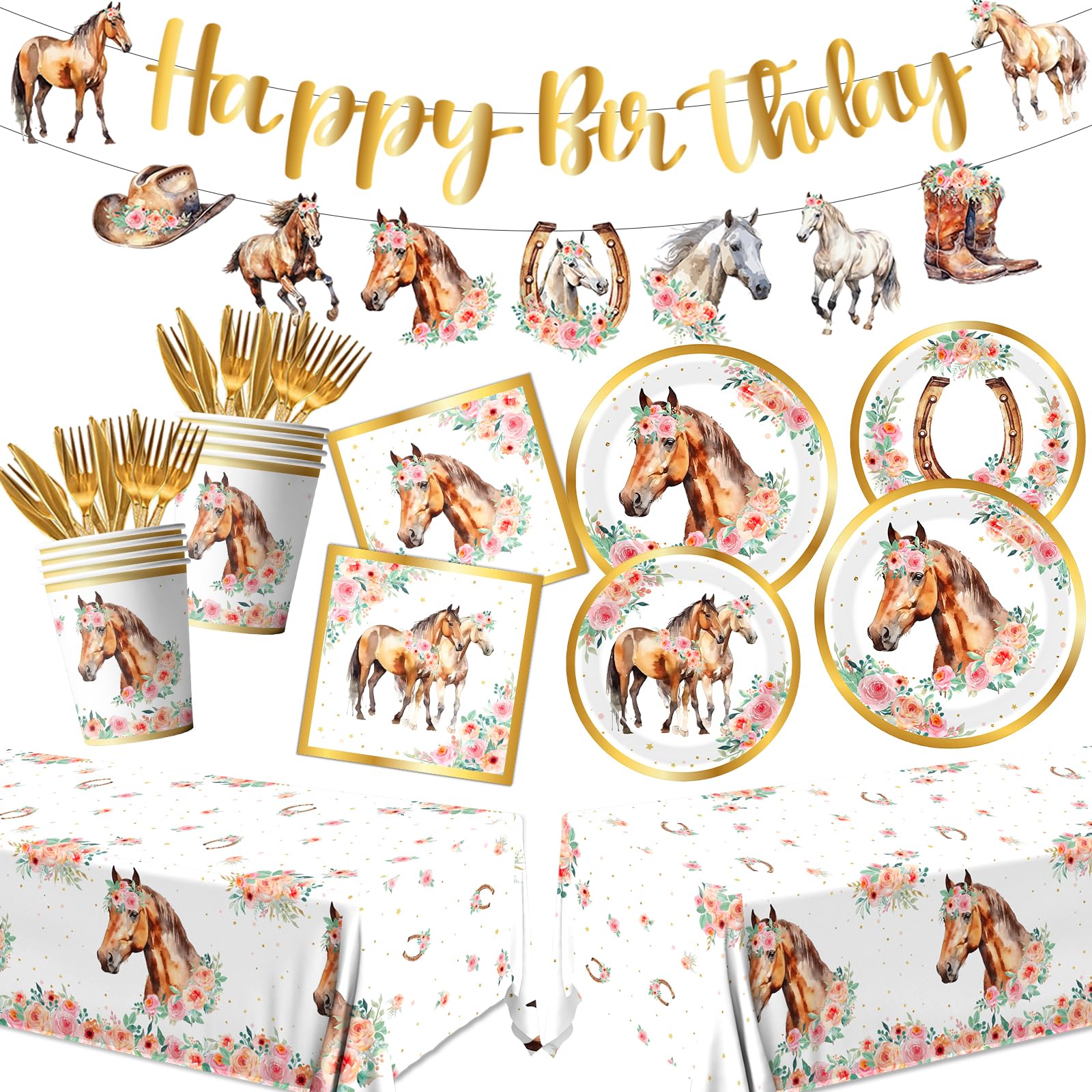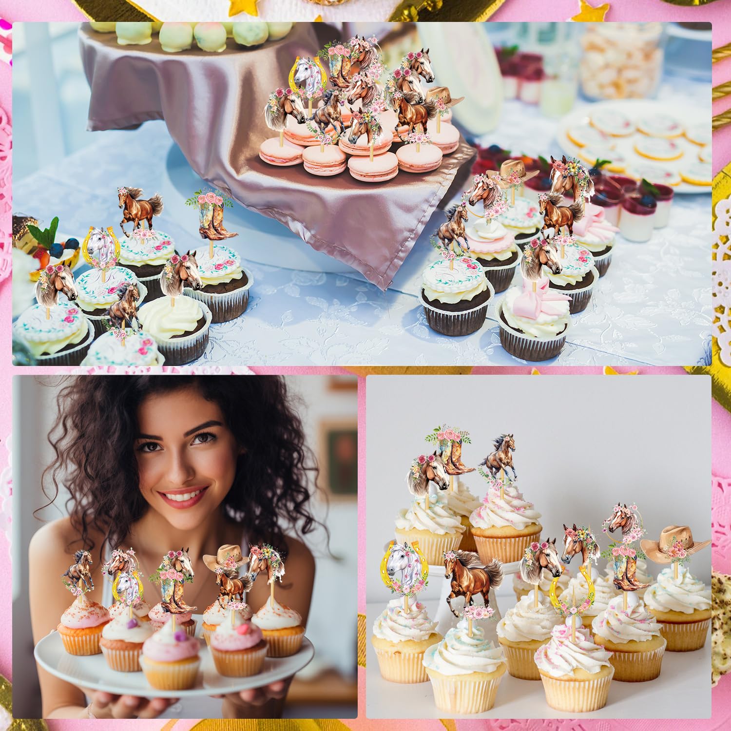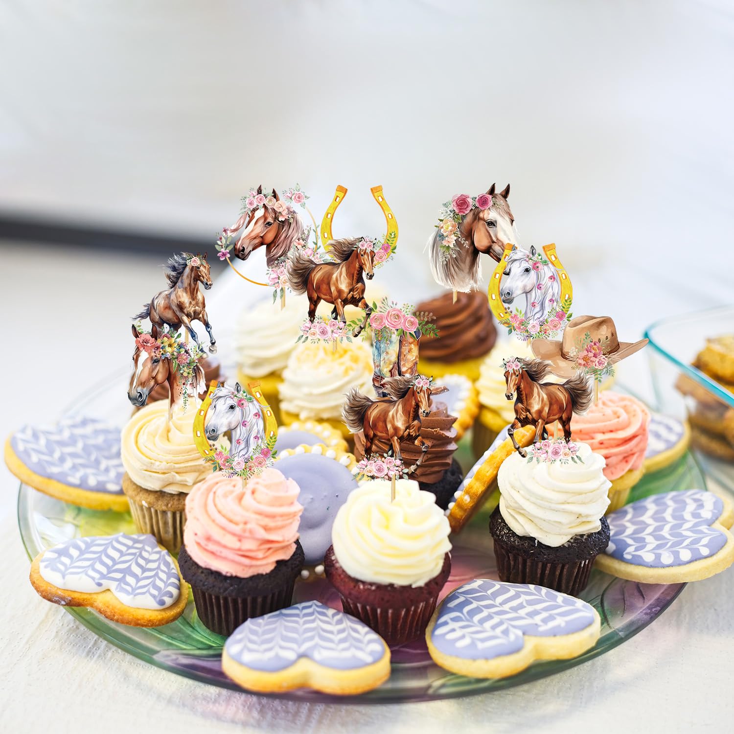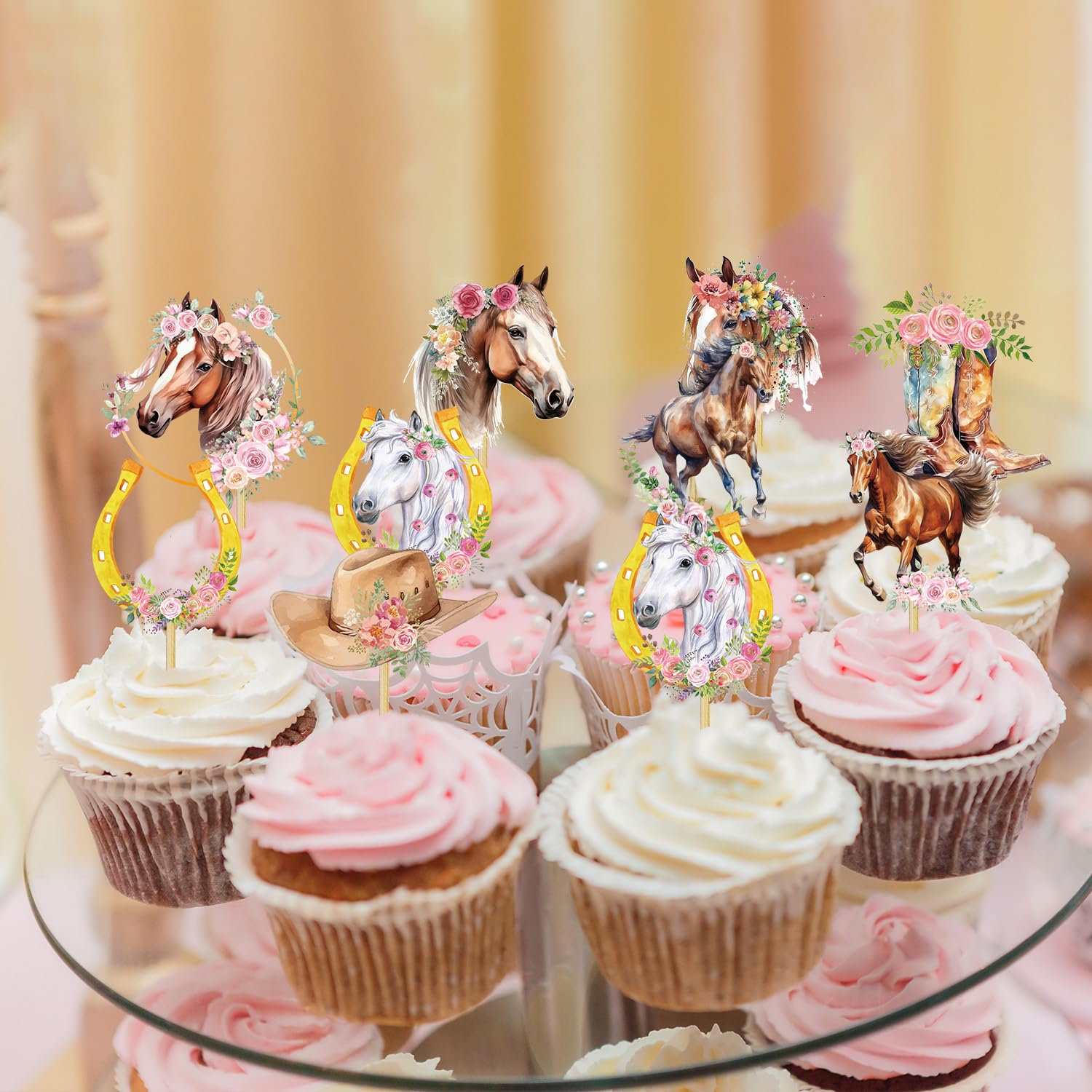 Horse Party Decorations for Girls: Horse-themed party cupcake decorations, specially made for girls' parties. The design features cowgirl elements such as horses, cowboy boots, and cowboy hats to create a unique party.