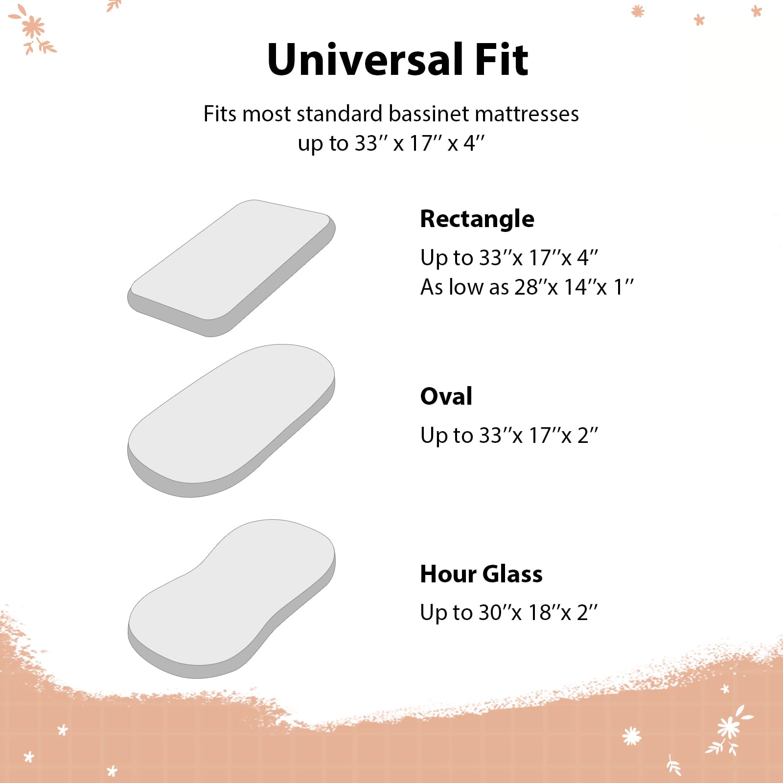 Snug Fit: Measuring 32” x 16”, the 3 pack bassinet fitted sheets fit most oval, round, rectangle, hourglass shaped bassinet mattresses. With full elastic edges of the bassinet sheets, a 5-inch deep pocket, and stretchy fabric, they ensure a snug, wrinkle-free fit that stays securely in place, even during your baby’s most active nights.