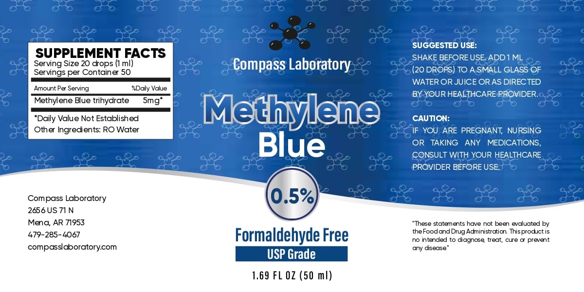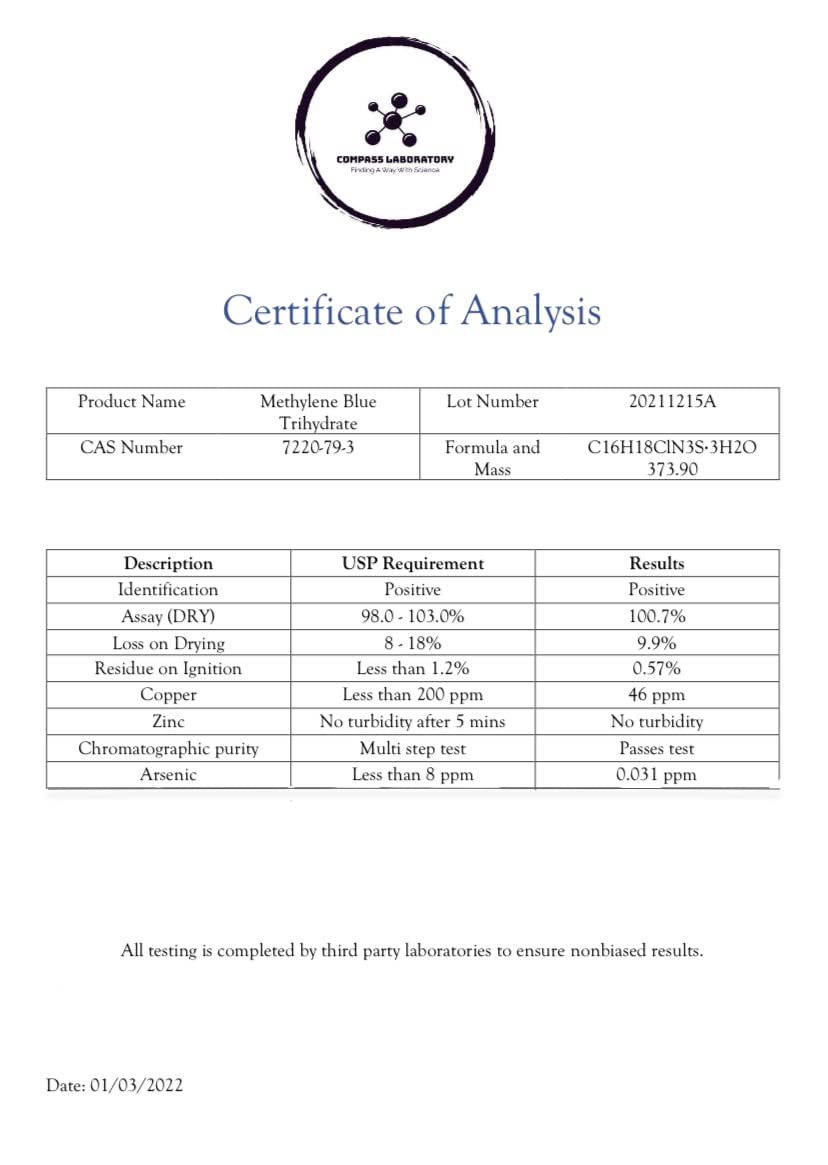 PURITY & POTENCY IN EVERY DROP - Our supplement contains only high purity, USP-grade methylene blue and is independently tested. It has no formaldehyde and meets the standards of the United States Pharmacopeia.