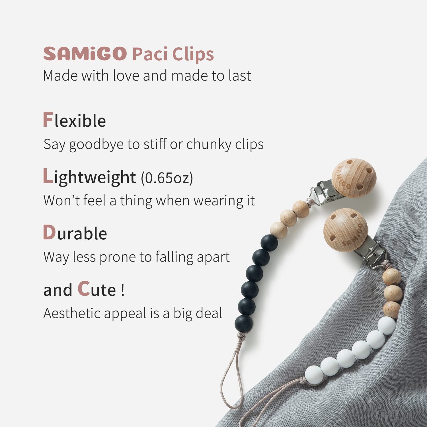SAMiGO pacifier clips are designed to keep your baby's pacifiers or binkies neatly within reach wherever you are. Available in 6 color combos, these paci holders are ready to add a pinch of cuteness to whatever your baby wears with a unique aesthetic appeal. Featuring a premium clasp, our paci clips stay more firmly secured to clothing without ruing any fabric while withstanding curious tugs from little hands. No more dropped or lost pacifiers!
