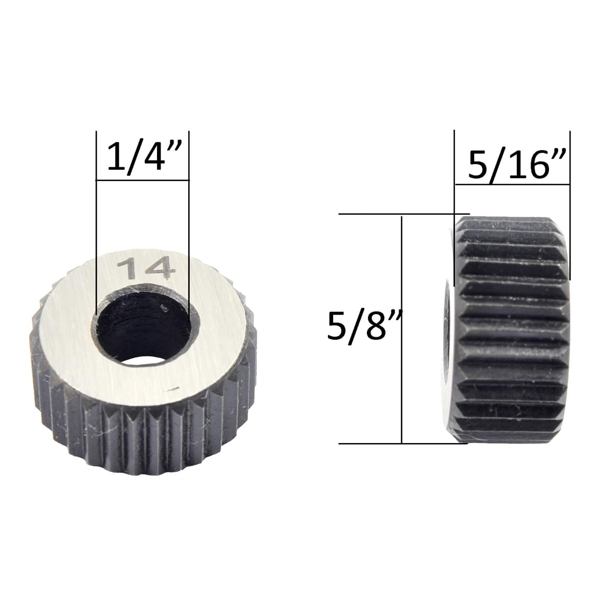 HHIP 2 Piece 5/8" Straight Pattern Medium Pitch Knurling Wheel Set Versatile and easy-to-use, these knurling wheel sets offer different patterns for diverse applications, enhancing the functionality and appearance of machined surfaces. Thickness is 5/16" wide. Sold in pairs. Available in coarse, medium, or fine pitch with diamond or straight pattern. Ideal for adding textured patterns to workpieces for improved grip or aesthetic appeal. The knurling wheels engage with the work piece surface and as pressure is applied, the wheels create the selected pattern through a rolling process. Patterns vary in aggressiveness, providing options for different applications. Coarse, Medium, and Fine for varying degrees of texture. Use the diamond pattern for a unique surface finish or the straight pattern for linear knurling effects.