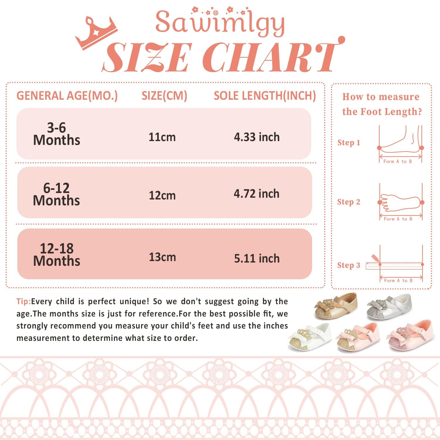 Size Tips: We provide general age recommendations for each of our sizes, but every baby is the unique. So we don't suggest you just going by the age. Please measure baby's actual foot length to choose the best fit shoe. If your little girl have a wider feet, please buy it size larger. Thanks