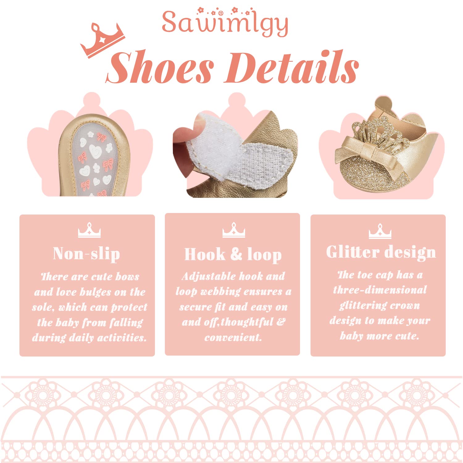 Glitter Design: The cute sequin on the toe cap and the crown design make your little kid shine in the crowd. It would draw much attention and compliment. These first walkers shoes suit for any occasions like crawling, walking and playing or photography