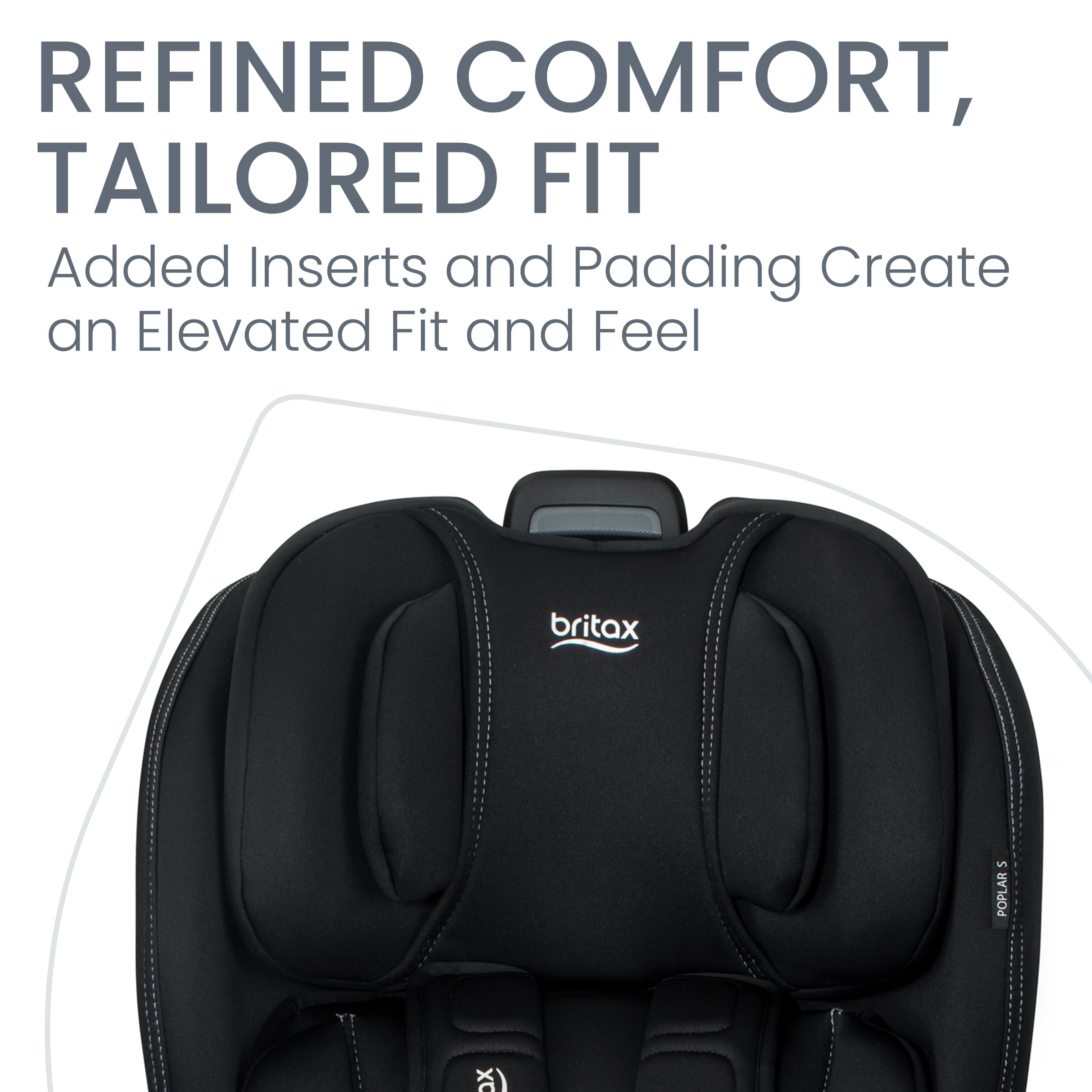 Ready to go with room to grow! The Britax Poplar™ S convertible car seat takes the stress out of moving to the next car seat stage thanks to the patented ClickTight® installation and slim SpaceSaver™ design. This convertible car seat accommodates up to 50 lbs when installed rear-facing, allowing your child to ride rear-facing longer. It easily switches to a forward-facing car seat as your child grows, accommodating up to 65 lbs. ClickTight technology provides fully open seat belt paths that are clearly labeled and easy to access, and the automatic tensioner takes care of the tightening. The baby car seat lets you easily adjust the 14-position no-rethread harness and headrest to help create the perfect fit, and the removable infant insert provides extra comfort on the go. The car seat features 17-inch SpaceSaver technology designed to fit 3-across* without compromising on Britax safety and premium comfort. The car seat boasts a patented SafeCell® crumple zone and V-shaped top tether to help manage crash energy. Carbon steel frame and belt paths provide strength and stability. Car seat cover fabrics are naturally flame-retardant with no added FR chemicals, and they’re safe to machine wash and dry time and again. *Britax cannot guarantee 3-across installation fitment in all vehicles