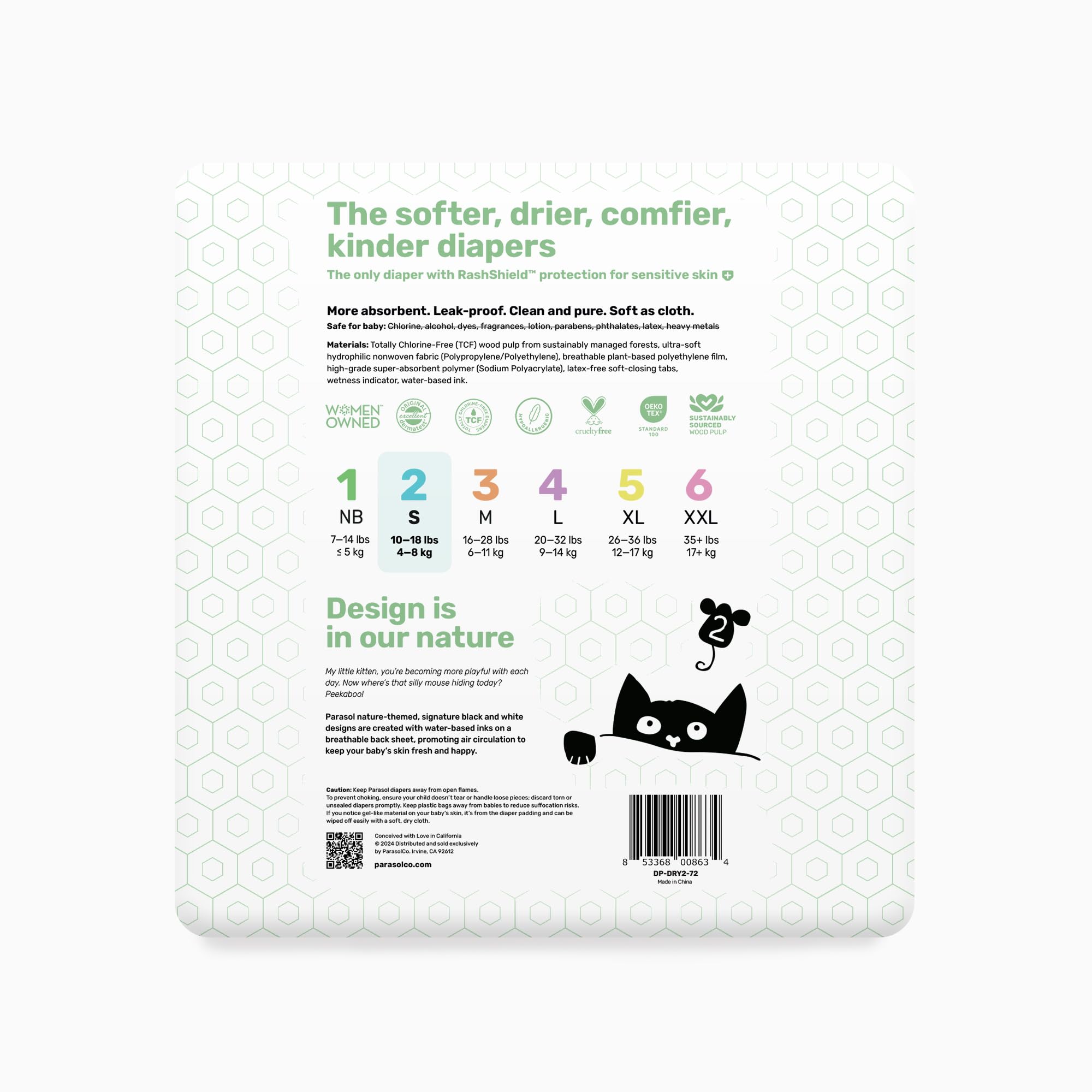 Keep baby's skin clear and dry with the first and only diapers with RashShield protection for sensitive skin. Super absorbent, soft, and lightweight fabric instantly wicks moisture and humidity away from skin to prevent irritating rashes. Breathable fabrics keep baby feeling fresh and airy, day and night. High waistband with soft 8-strand stretch contours to all body types for a comfy but secure, leak-control fit that moves with baby without pinching or leaving red marks. Non-toxic diapers are 100% chlorine free and free from alcohol, dyes, chemicals, fragrances, lotion, parabens, phthalates, latex, heavy metals and more. Enjoy premium care without the luxury price. Parasol’s got you covered.