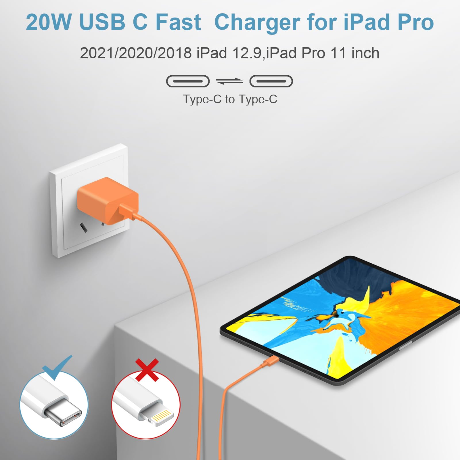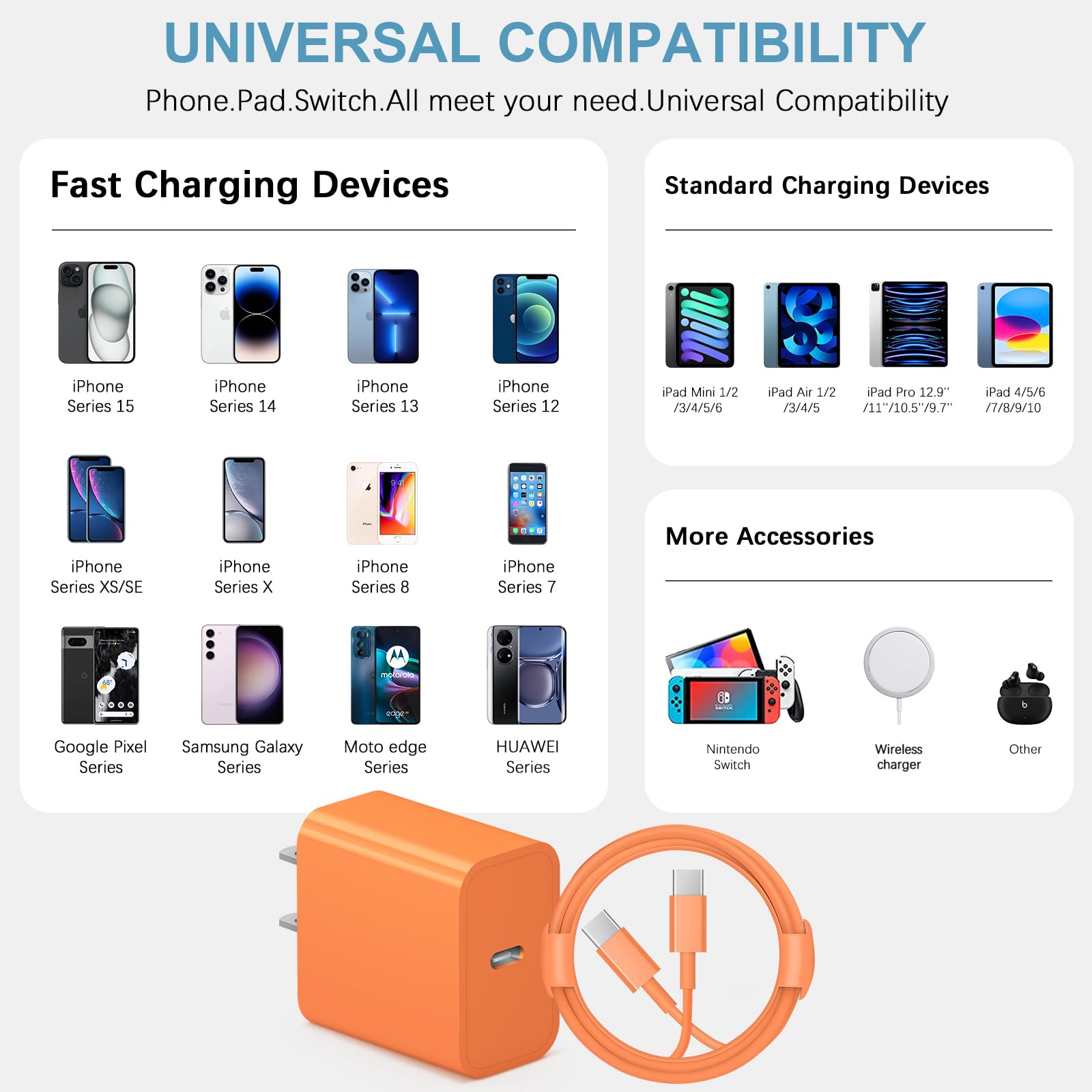 【iPhone Charger】Use the official USB-C type cable 20W USB C wall charger to access fast-charging iPhone 17/17 Plus/17 Pro/17 Pro Max/iPhone Air/ iPhone 16/16 Plus/16 Pro/16 Pro Max/iPhone 15/15 Plus/15 Pro/15 Pro Max/ 2021/2020/2018 iPad Pro 12.9/11 inch,iPad Air 4, Mac Book Air 13 inch, Mac Book 12 inch, Gen 4/3, iPad Pro 11 Gen 2/1, iPad Air 4, Google Pixel 4/ 4 XL / 3a XL / 3 / XL / 2, Samsung Galaxy S8 S9 S10 S20 Plus, Note 10, LG and more.(Old iPad models are not compatible)
