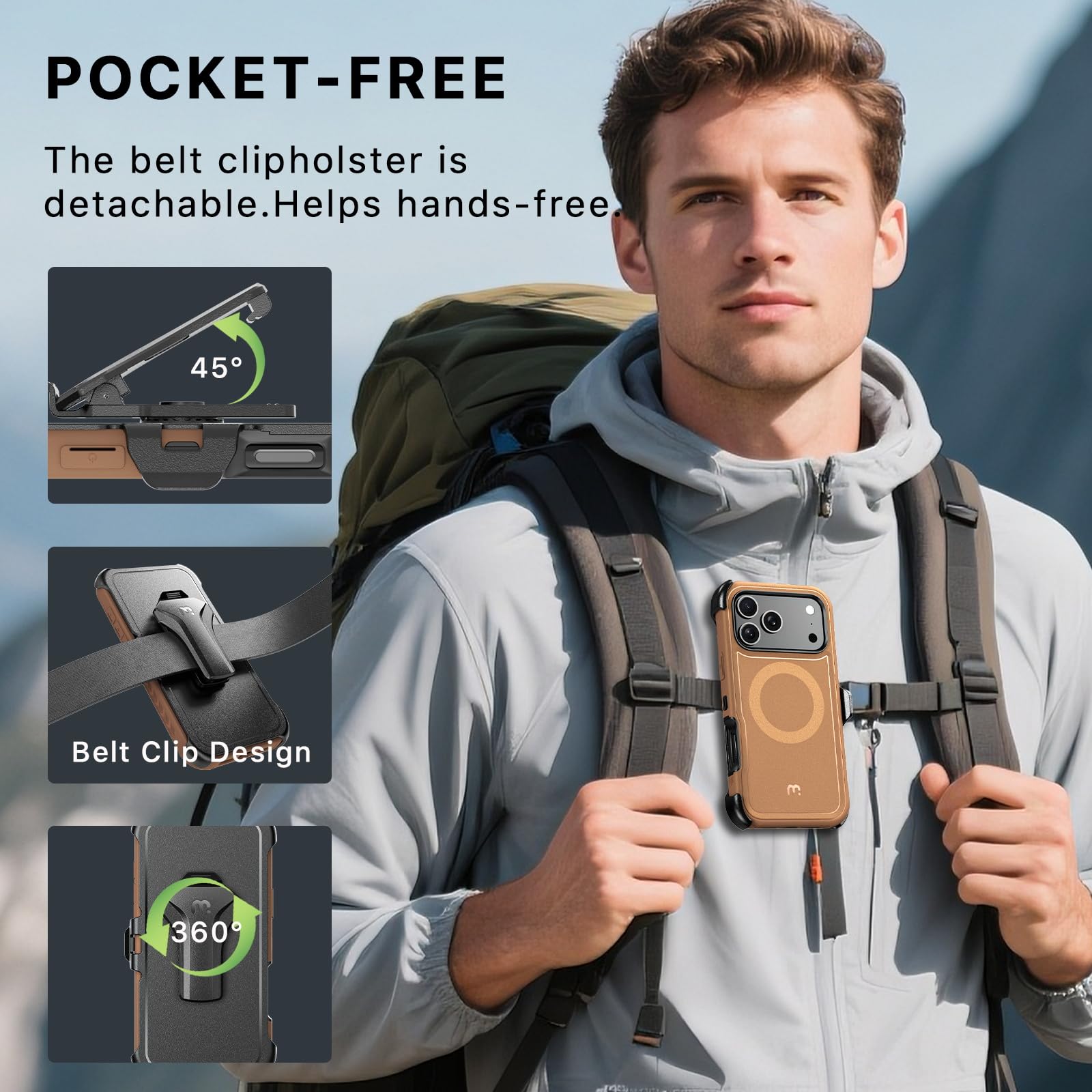 Versatile Holster Clip For iPhone 17 Pro Max: Attach the Detachable Holster Clip to Your Belt or Bag for Secure and Easy Device Access. It Also Functions as a Convenient Kickstand, Allowing Hands-Free Video Viewing in Any Orientation.