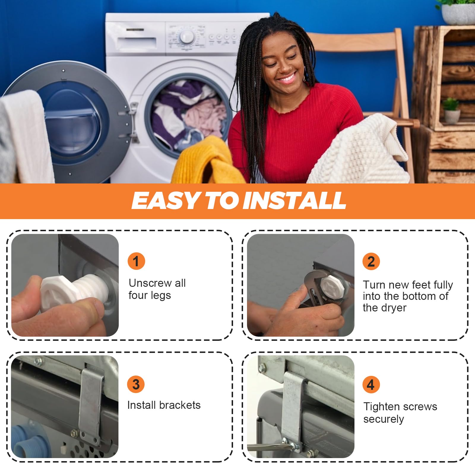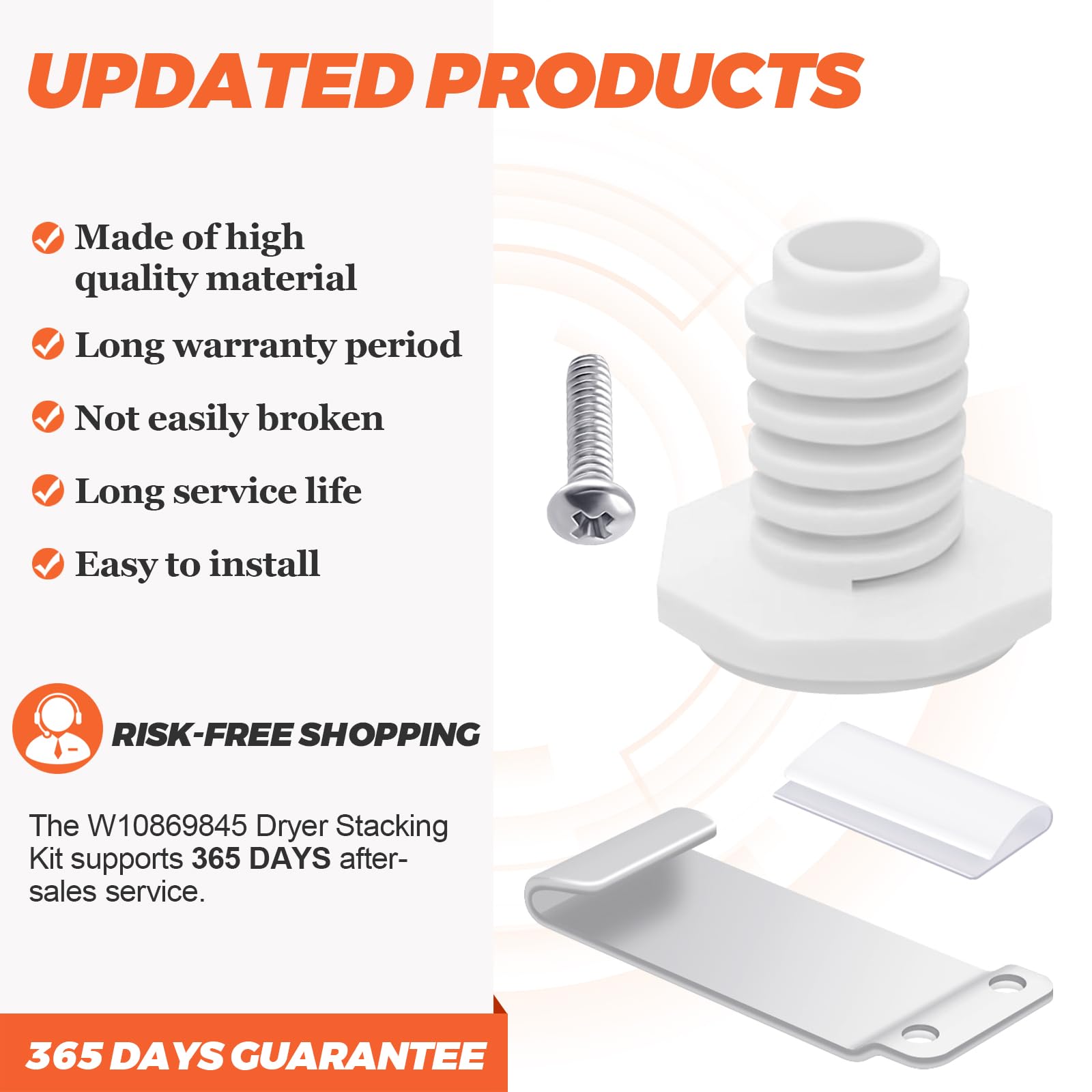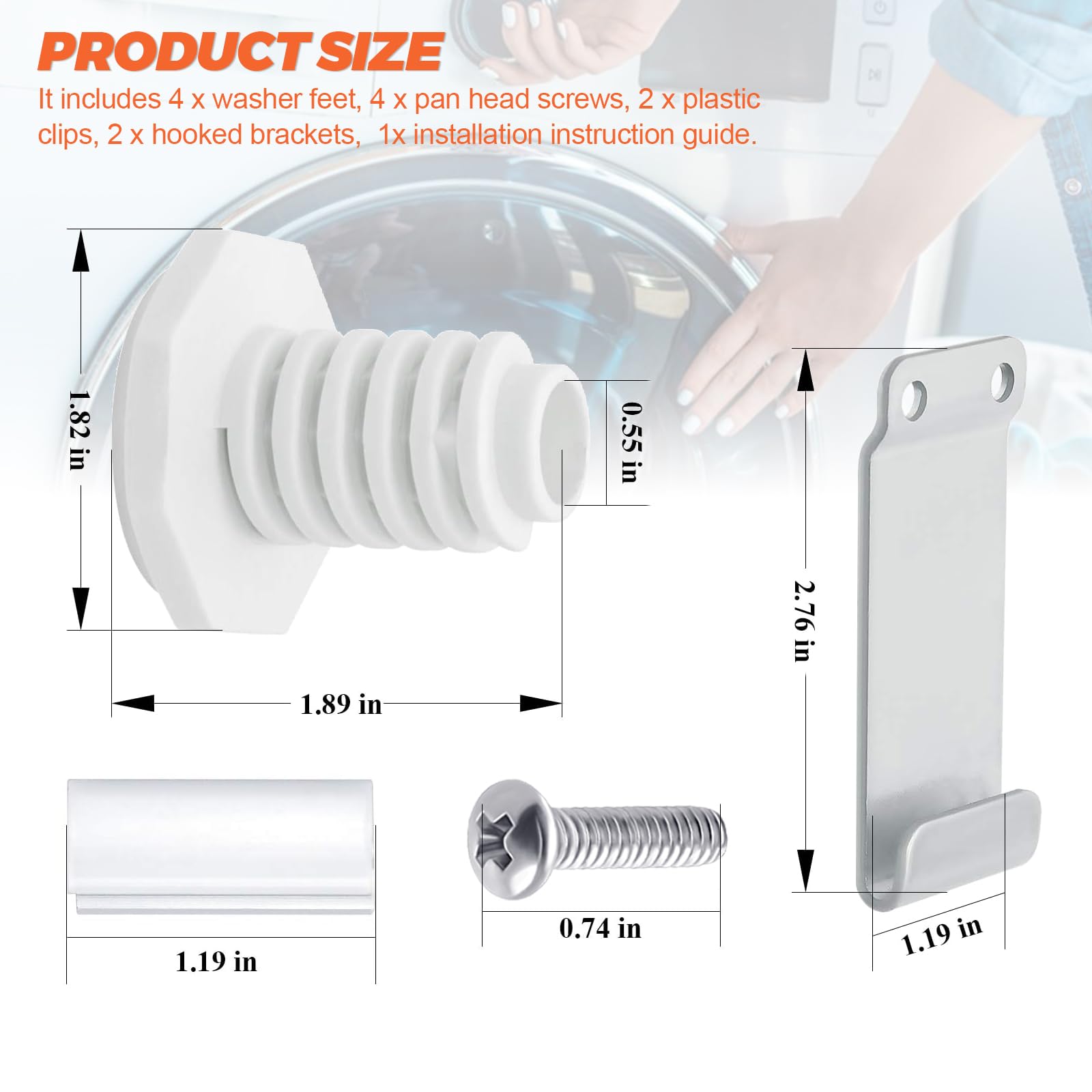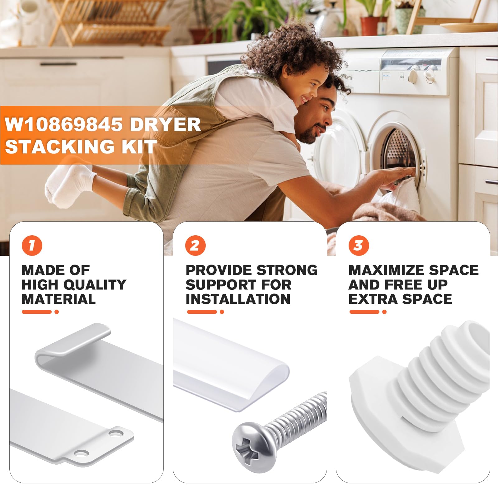 γπππππ πππππππππππγ- W10869845 washer dryer stacking kit includes 4 x washer feet, 4 x pan head screws, 2 x plastic clips, 2 x hooked brackets, 1 x installation instruction guide. Washer feets and plastic clips are made of high quality ABS material, washer feets are easy to install with tool-spanner. Pan head screws and hooked brackets are made of zinc plated carbon steel, no harmful chemicals. The sturdy and durable construction allows you to secure the laundry appliances and provides a long-lasting performance