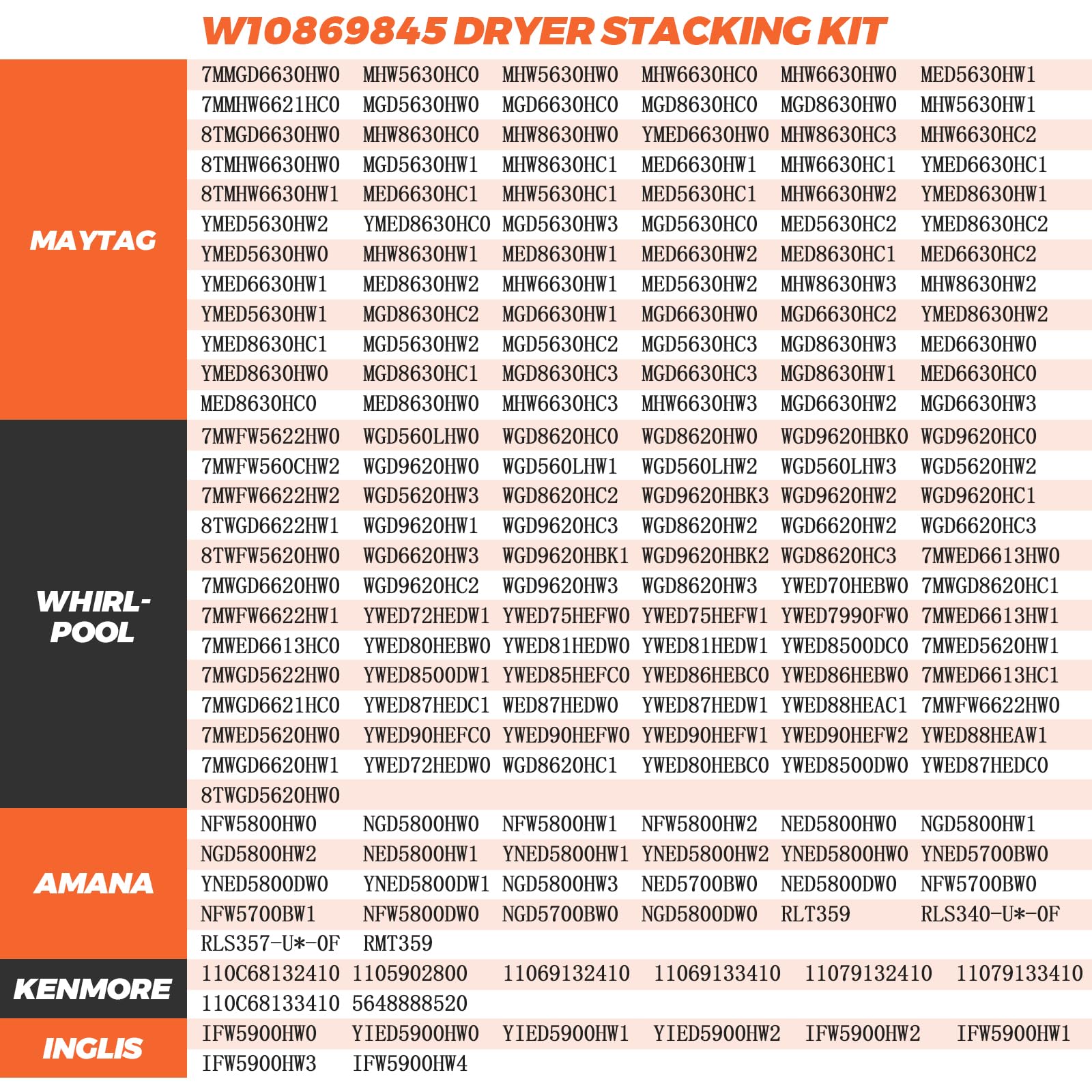 γππππ πππππ ππππππππππγ- The W10869845 Dryer Stacking Kit fits for Whirlpool, Kenmore, Amana, Maytag, Inglis, Crosley washer and dryer. βReplaces part numbers 4502692, AP6047938, PS12069913, EAP12069913. W10869845 Stacking kit fit MED5630HW0, MHW5630HC0, MHW5630HW0, MHW6630HC0, MHW6630HW0, NFW5800HW0, WED8620HC0, WED8620HW0, WED9620HBK0, 1105902800, 110C68132410, 110C68133410, 7MMHW5500FC0, 7MMHW5500FC1, IFW5900HW2, IFW5900HW1, CED7464GW0, CED7464GW1, etc. If you are not sure whether this lint filter can be used in your dryer, please contact us and we will help you to confirm