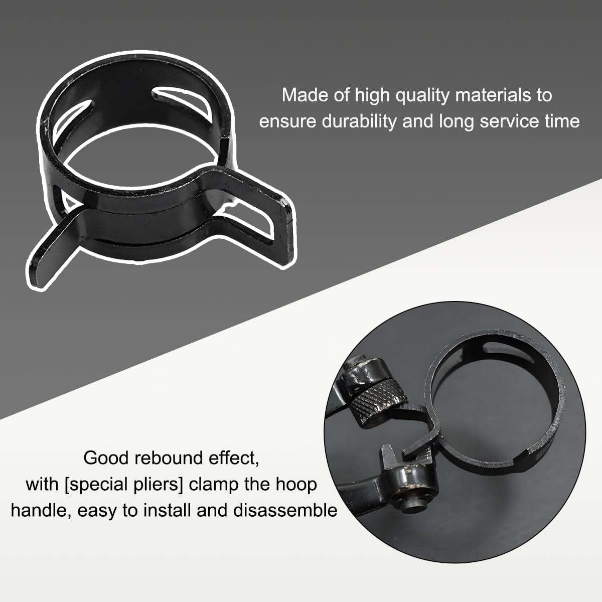 【Easy to Use】: First, position the clamp around the hose or pipe you want to secure. Second, use pliers or your hands to squeeze the ends together, allowing the clamp to expand and wrap around the hose snugly. Third, release the clamp and check for a tight fit without gaps.