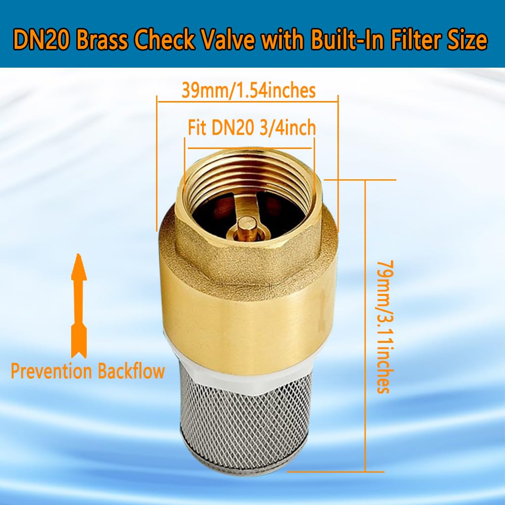 【Easy to install】DN20 3/4 Inch Brass check Valve Built-In stainless steel filter for DN20 Inch threaded joint connection.