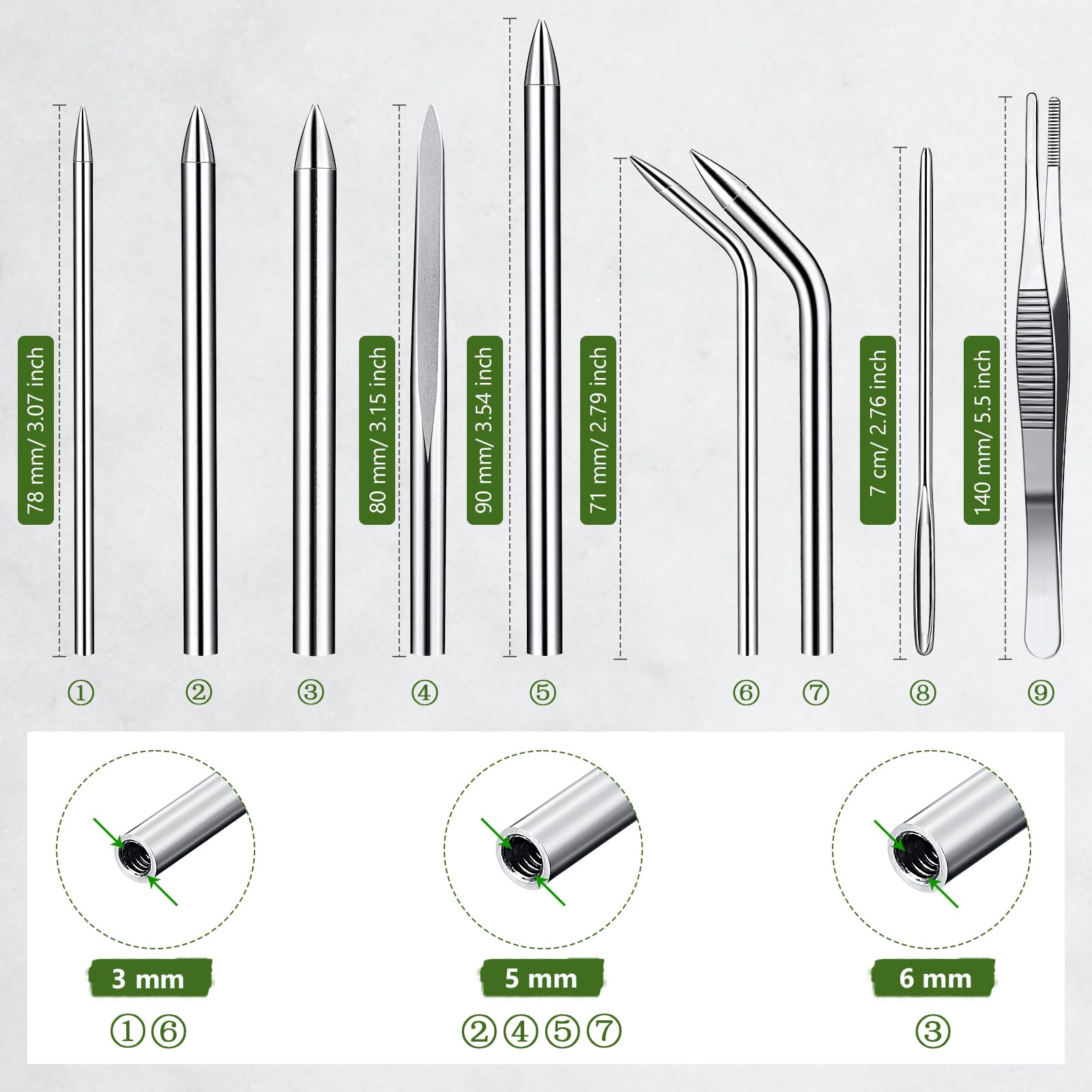 Proper Size to Use: paracord lacing needle is about 78 mm/ 3.07 inch long, about 3 mm, 5 mm, 6 mm in diameter; Straight paracord needle is about 90 mm/ 3.54 inch long, 5 mm in diameter; Flat head needle is about 80 mm/ 3.15 inch long, about 5 mm in diameter; Curved paracord needle is about 71 mm/ 2.79 inch long, about 3 mm, 5 mm in diameter; Big eye needle is about 7 cm/ 2.76 inch long, about 2 mm in inner diameter; Smooth tool is about 172 mm/ 6.77 inch, marlinspike is about 170 mm/ 6.69 inch