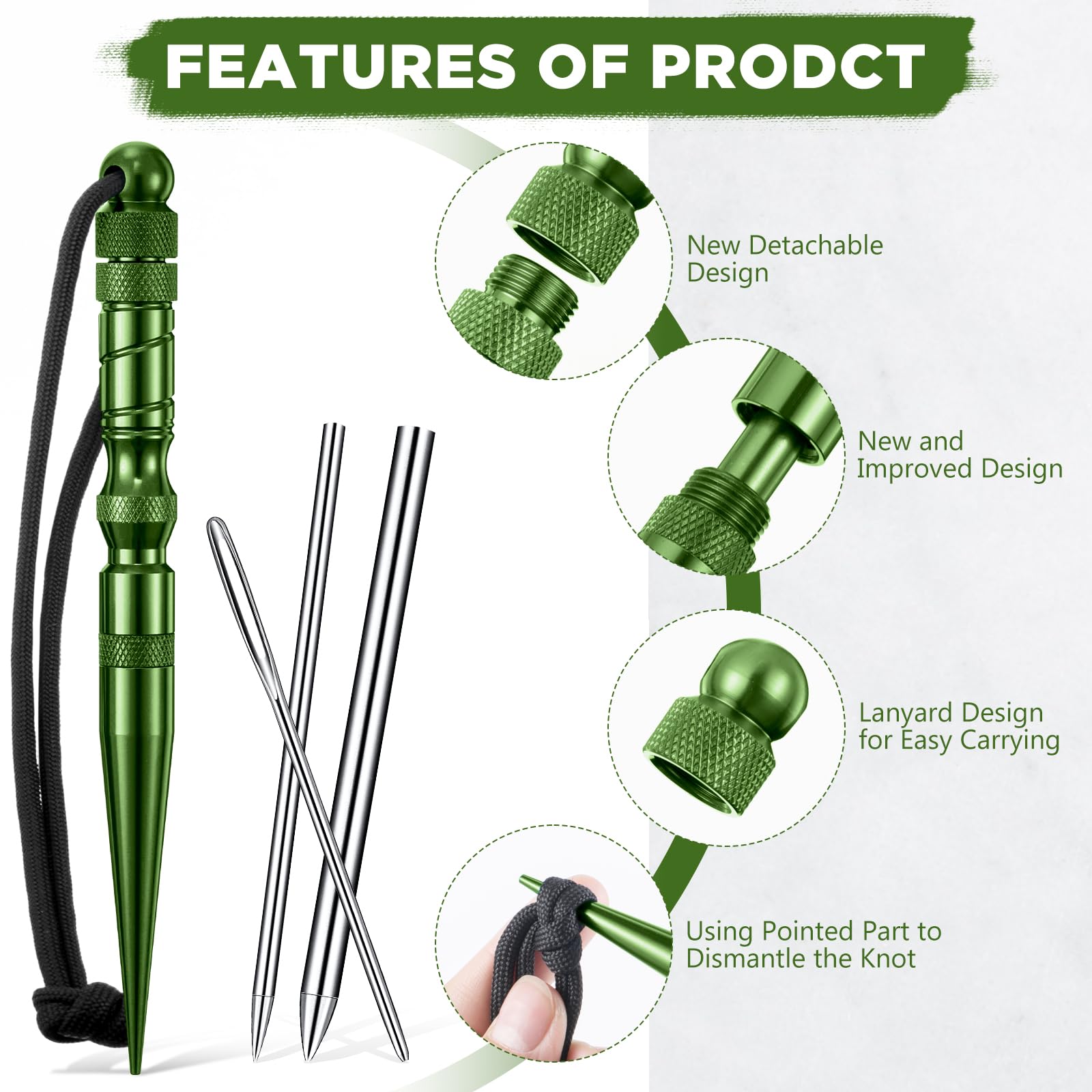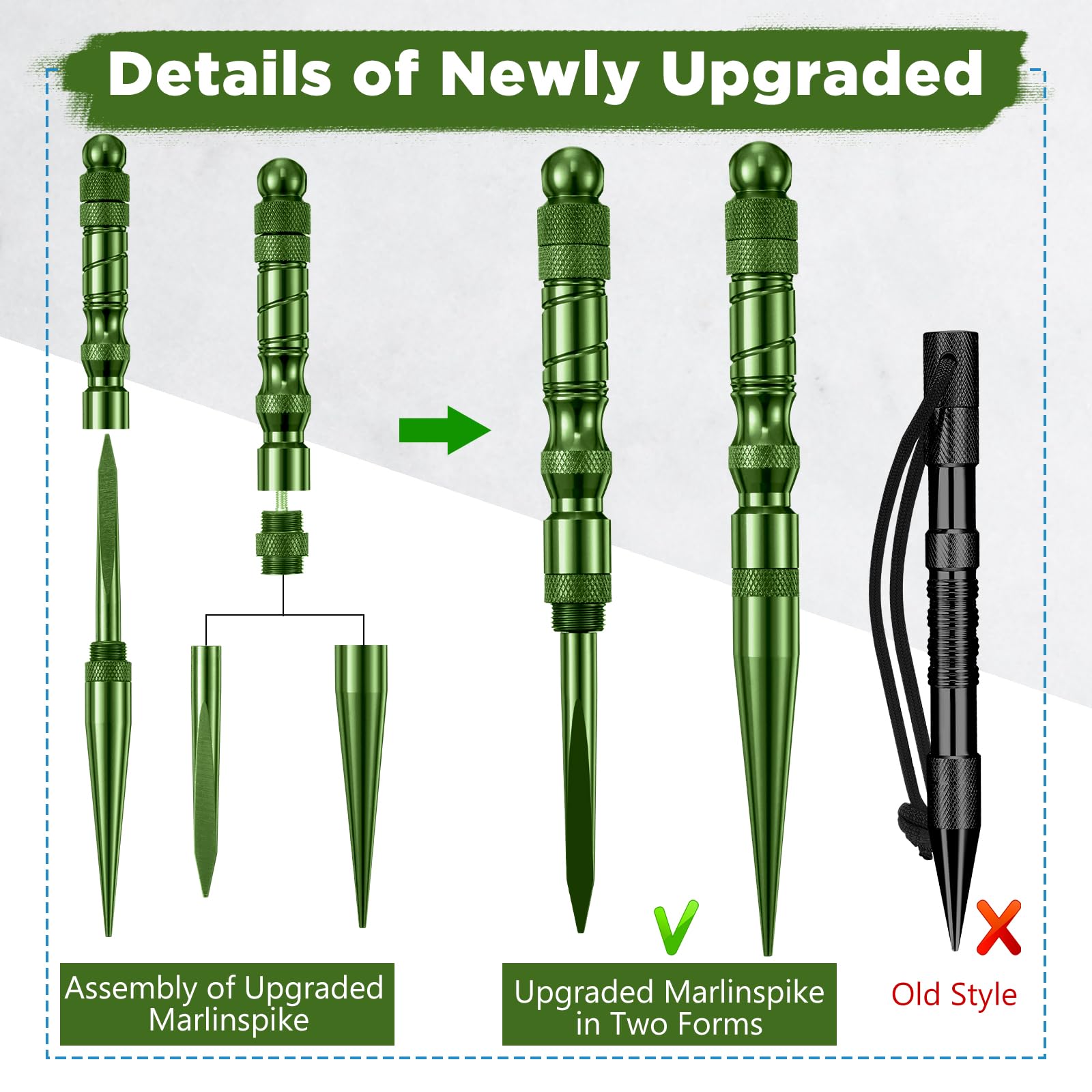 Brand New Upgraded Marlinspike: we have upgraded the new shape of the Marlinspike's head, increasing the length of its pointed slope, which has greatly improved the efficiency of use; The head can be unscrewed to replace the pillow design, it is a more practical knotting tool, very suitable for untying knots, the upper and lower heads are detachable, can store paracord needles, waterproof and lightweight, easy to carry