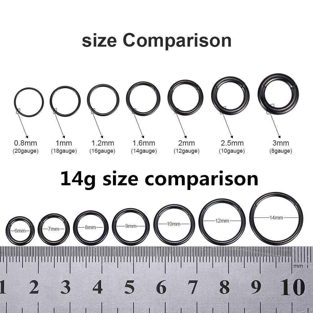 Quantity:2pcs,Nose Hoop Ring/Earring Hoop Size: 14 gauge (thickness: 1.6mm), inner diameter 23/64 inches(9mm ),Please choose your gauge and diameter hoop for your nose piercing needs.It has a smooth closure that doesn't slipped or opened. It's still tight after long-term use.