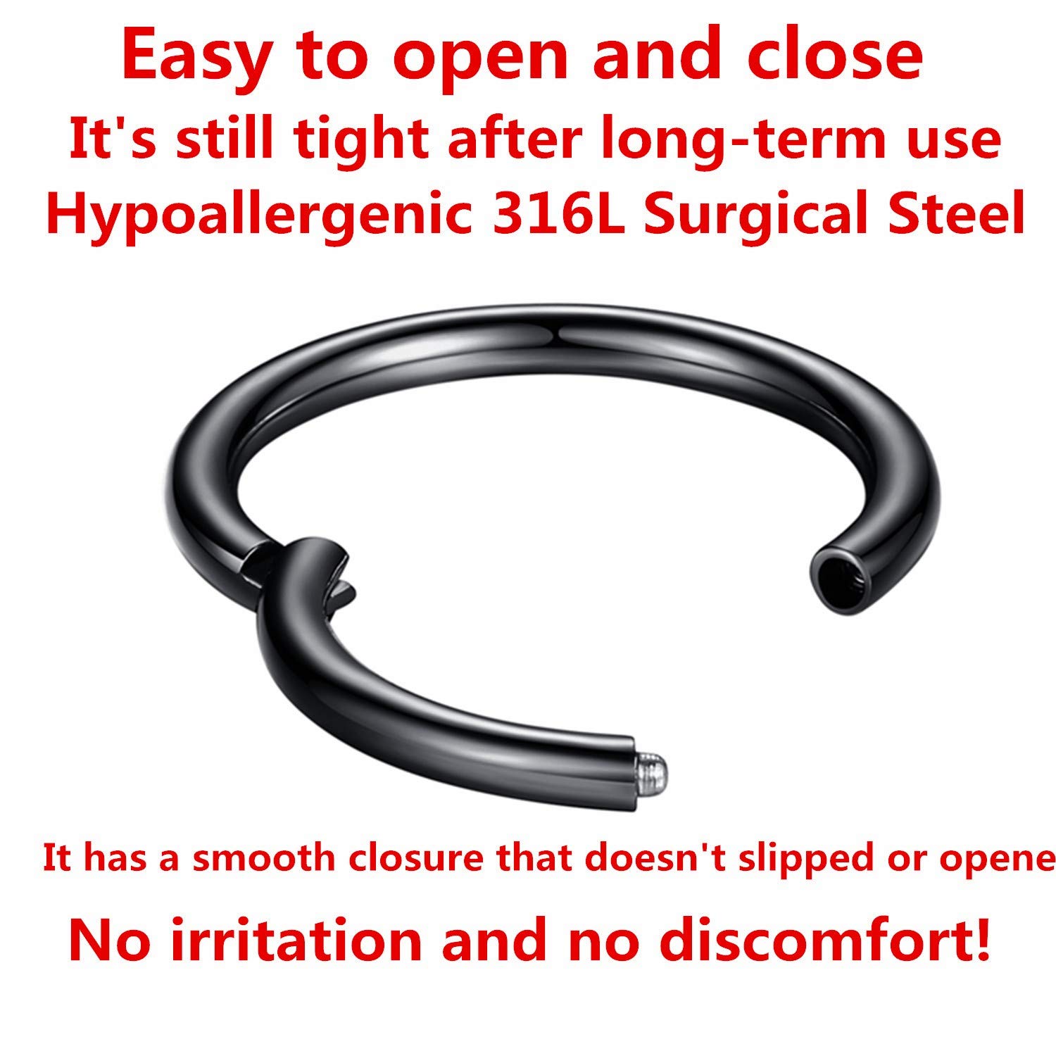 Perfect for Nose, Cartilage, Septum, Tragus Piercings,Helix Earring, Daith,Conch,Rook Ear Piercing, Lip Rings, Belly Ring,Nipple Piercing and more. Very easy to open/close a click closure by hand. Not require a tool.Smooth surface, comfortable to wear without sharp edge. Match with suitable apparel for different occasion. Smooth Surface and easy to use.