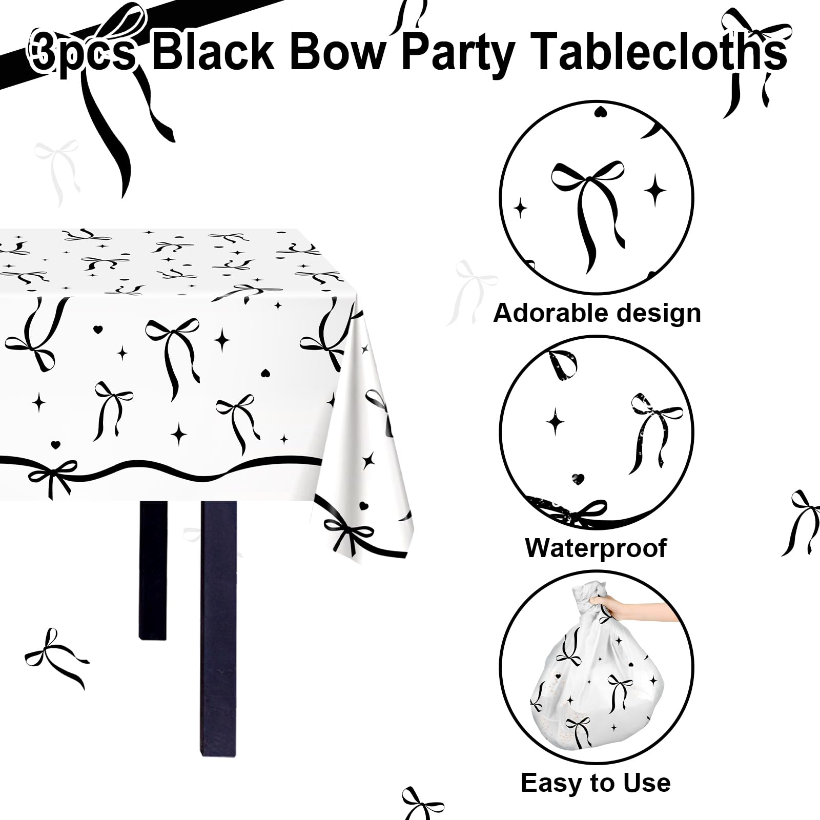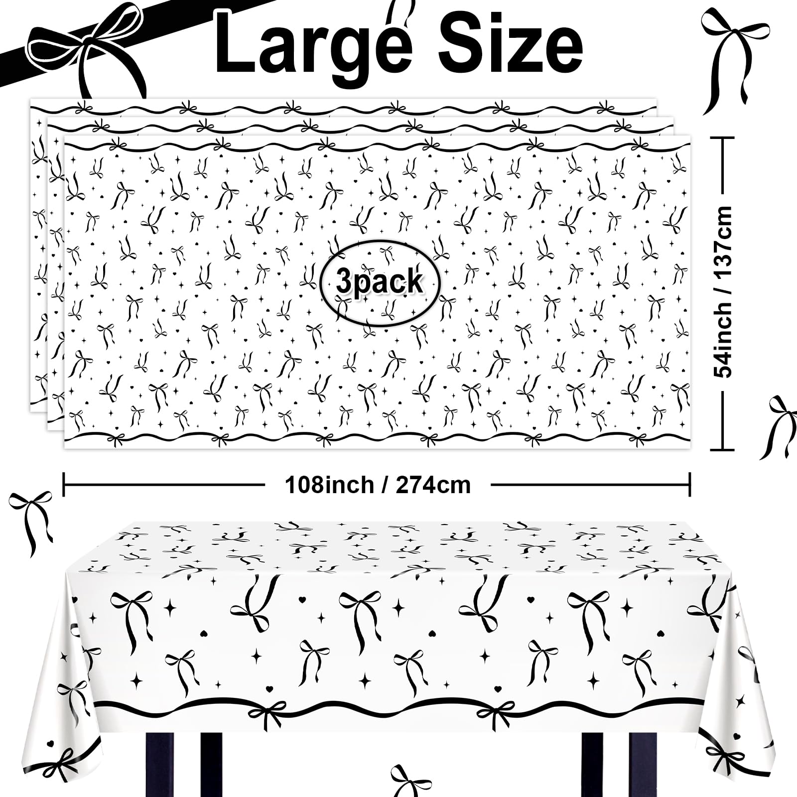 Large Size for Your Event: The package includes 3 pcs black bow theme party tablecloths, each size is 108x54 inch ( L x W ), suitable for most dining tables, they can be applied for both indoor and outdoor table decorations