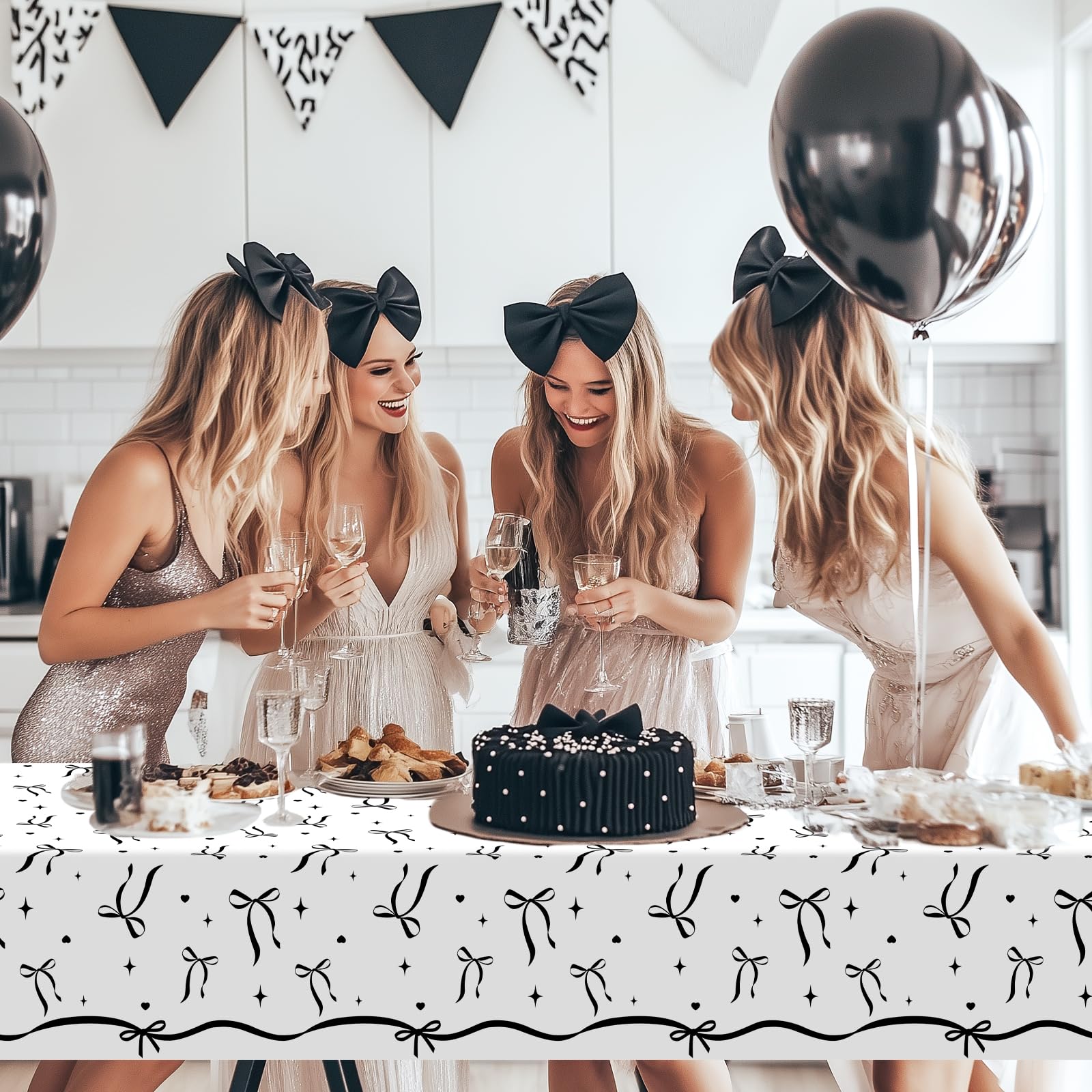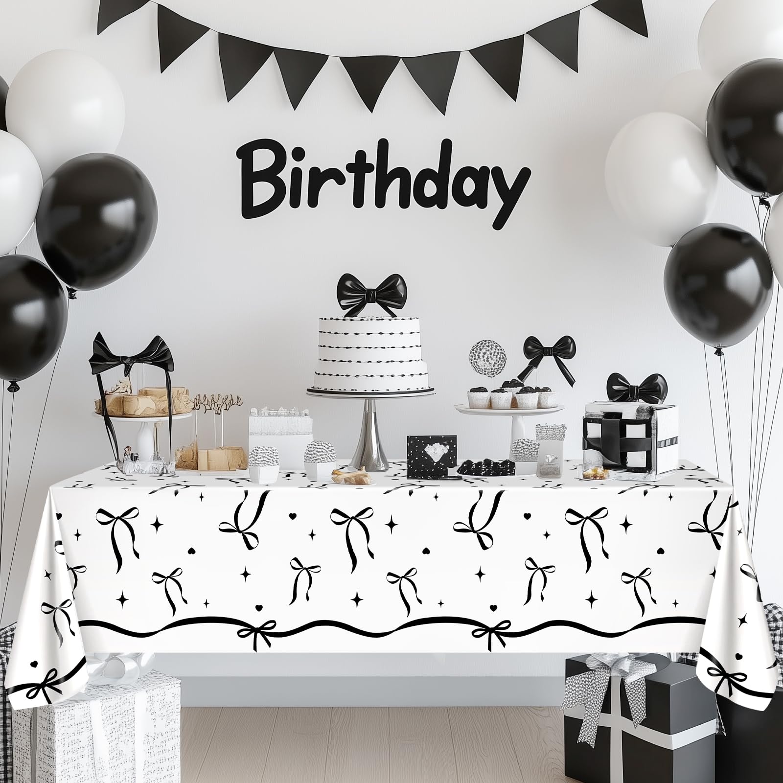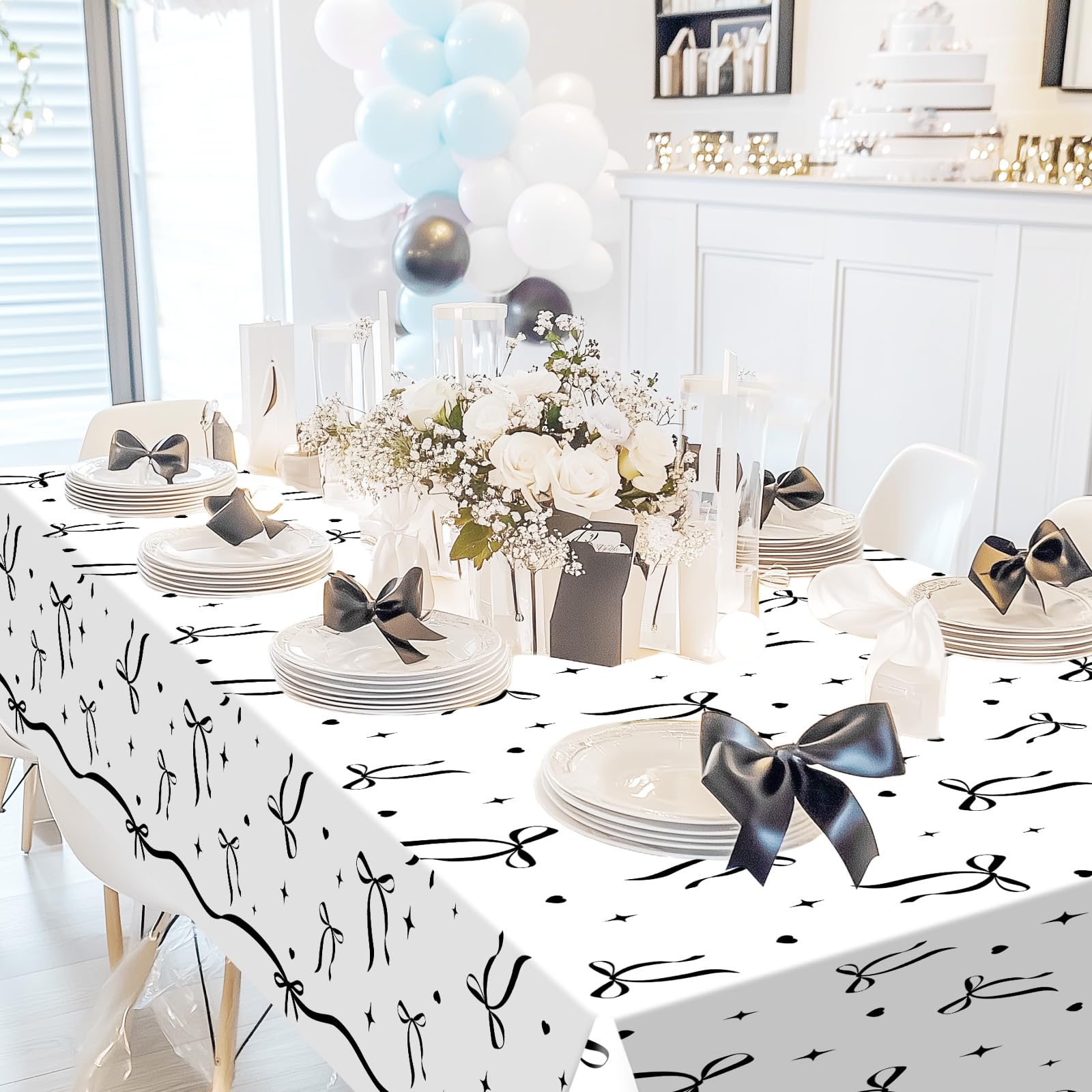 Exquisite Design: The black and white tablecloth has bow patterns is evenly printed on the tablecloth; It is very fashion and elegant, adding a party atmosphere to your event