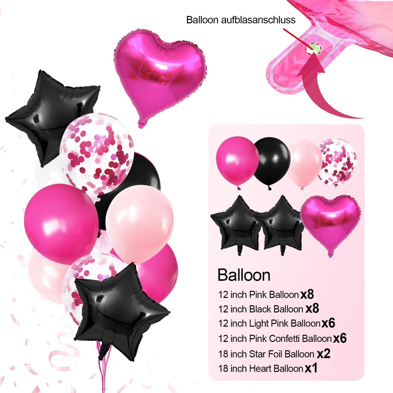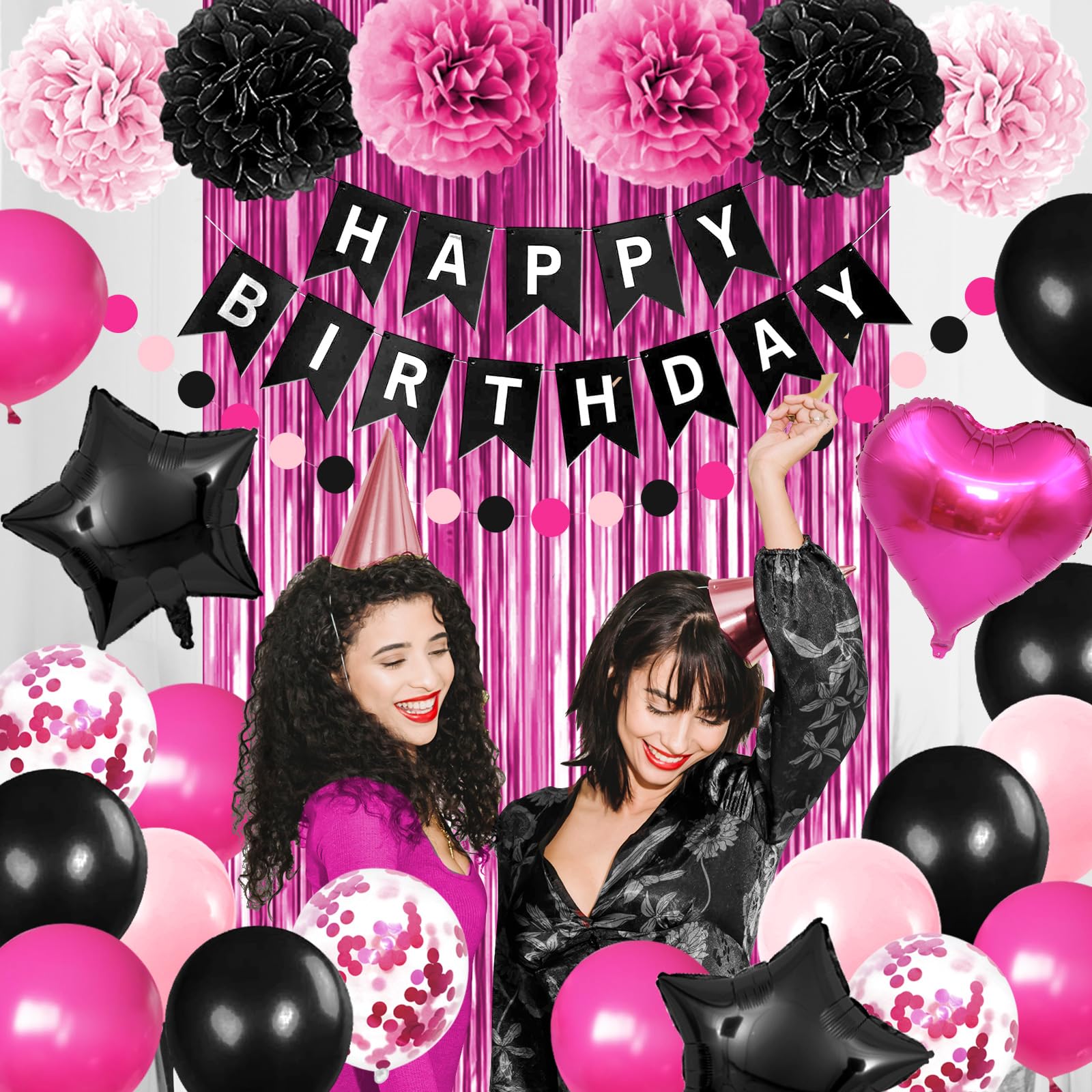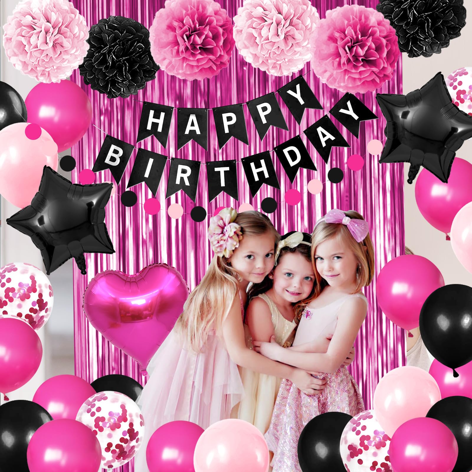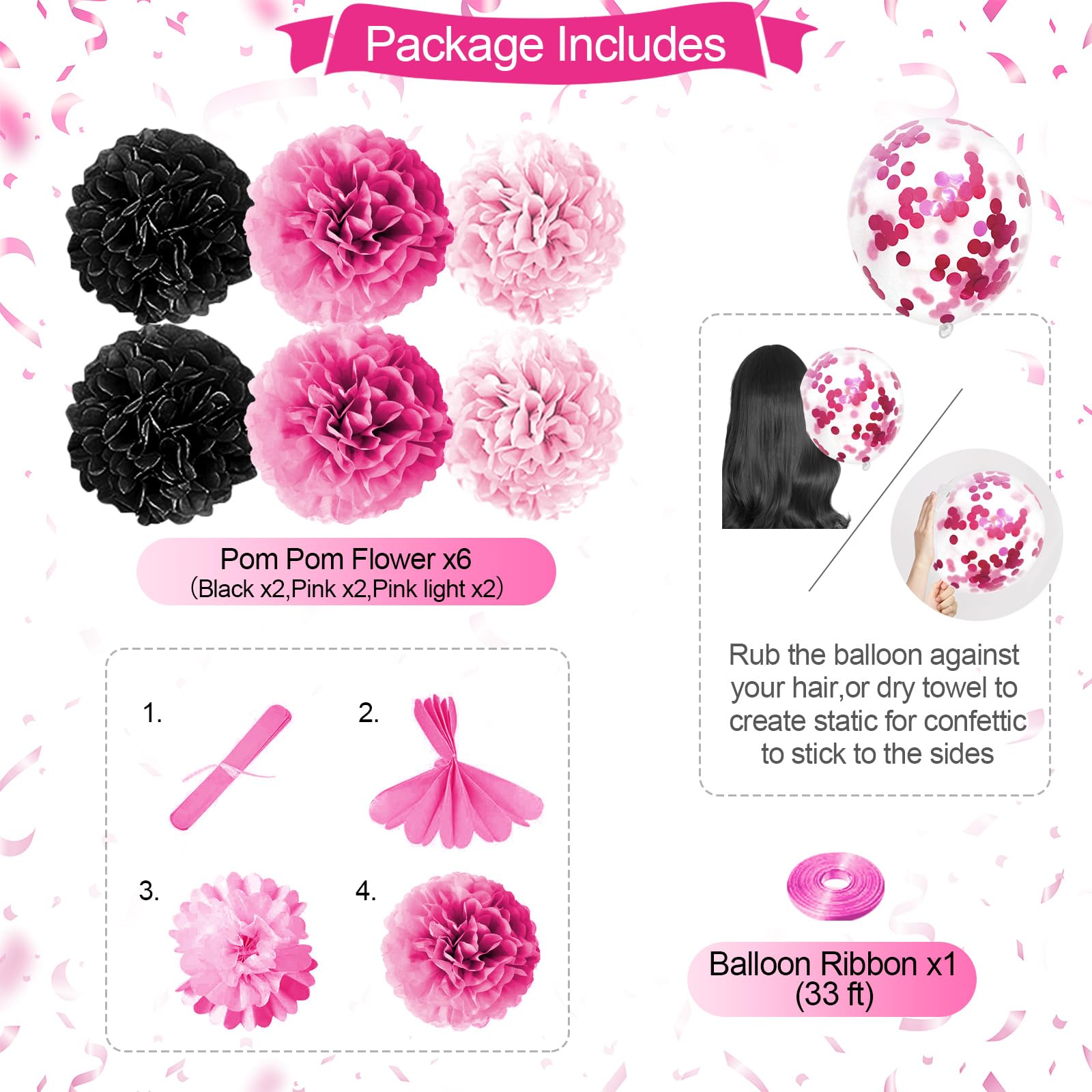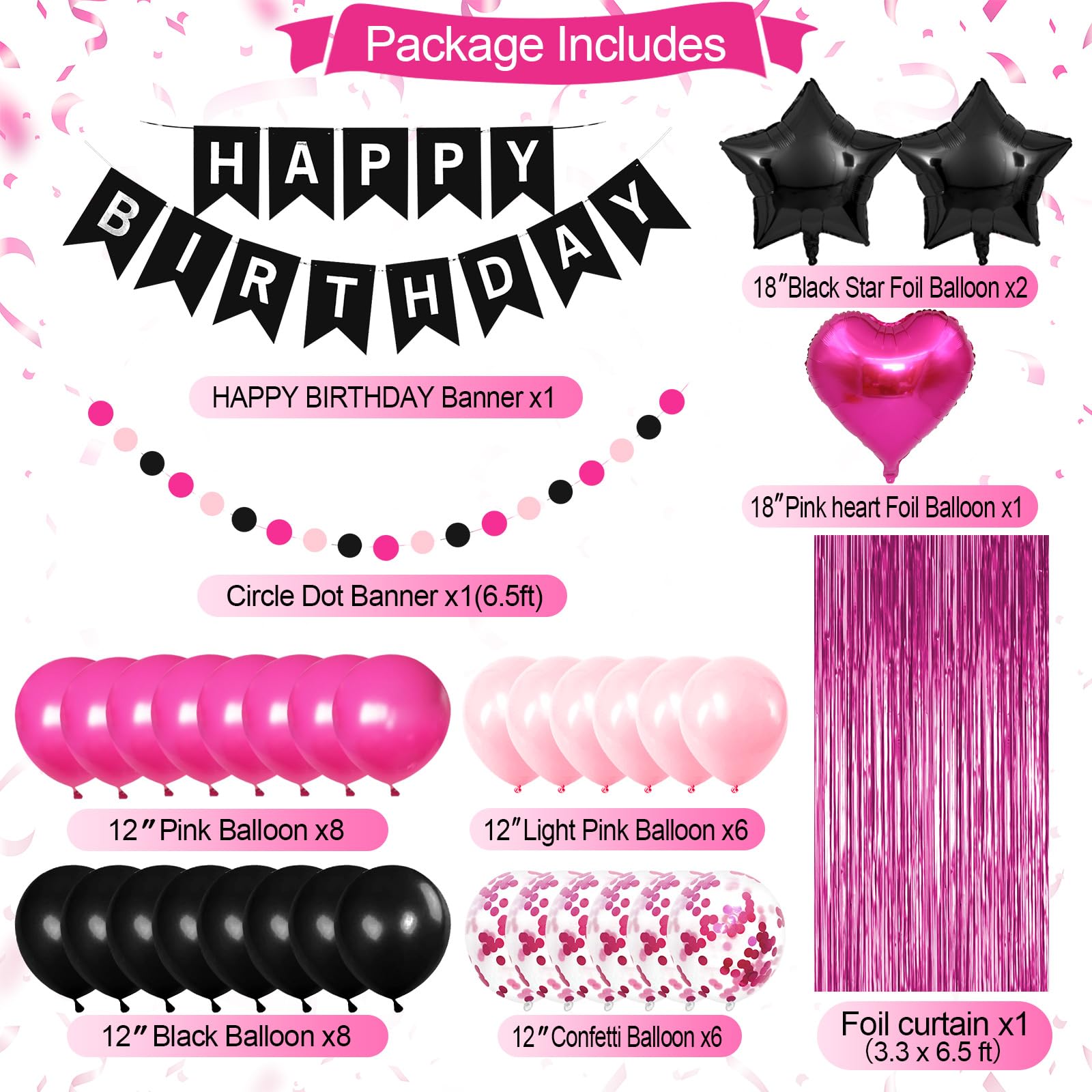 【Pink and Black Birthday Decorations】- 1 set "Happy Birthday" paper banner,1pcs pink and light pink black polka dot garland(6.5 feet),1pcs pink foil fringe curtain,6 pcs pompom flower in hot pink/light pink/black (2pcs each color),8 pcs 12 inch hot pink balloons, 8 pcs 12 inch black balloons,6 pcs 12 inch light pink balloons,6 pcs 12 inch pink confetti balloons,2pcs 18 inch black star-shaped foil balloons,1pcs 18 inch pink heart foil balloons,1pcs ribbon.