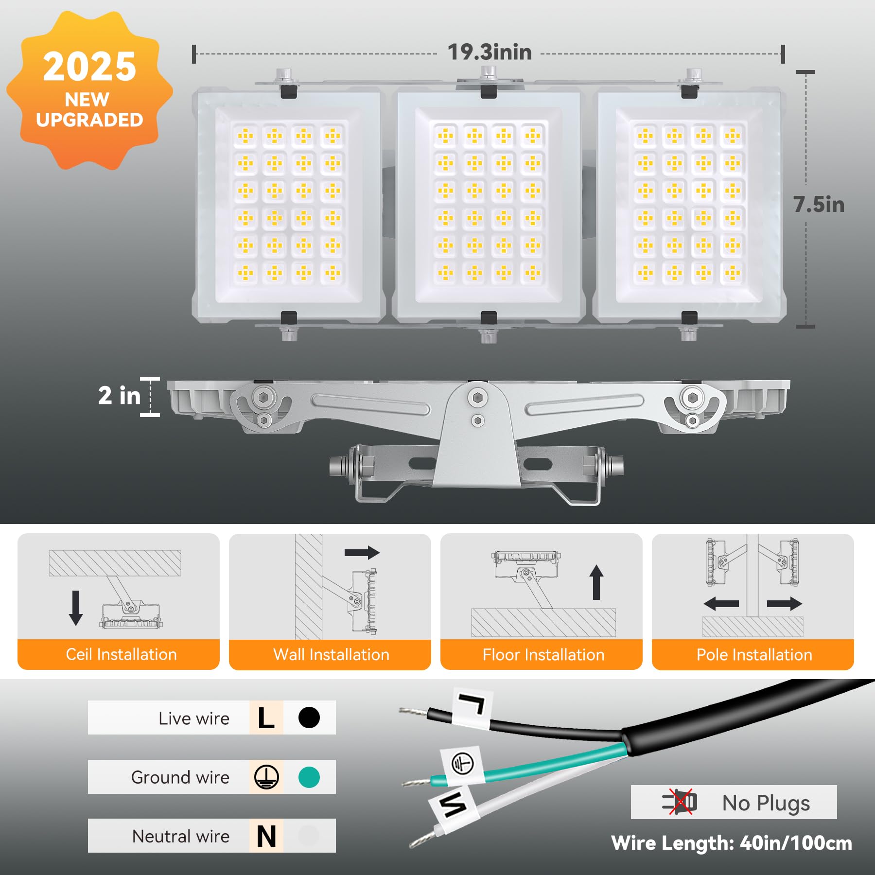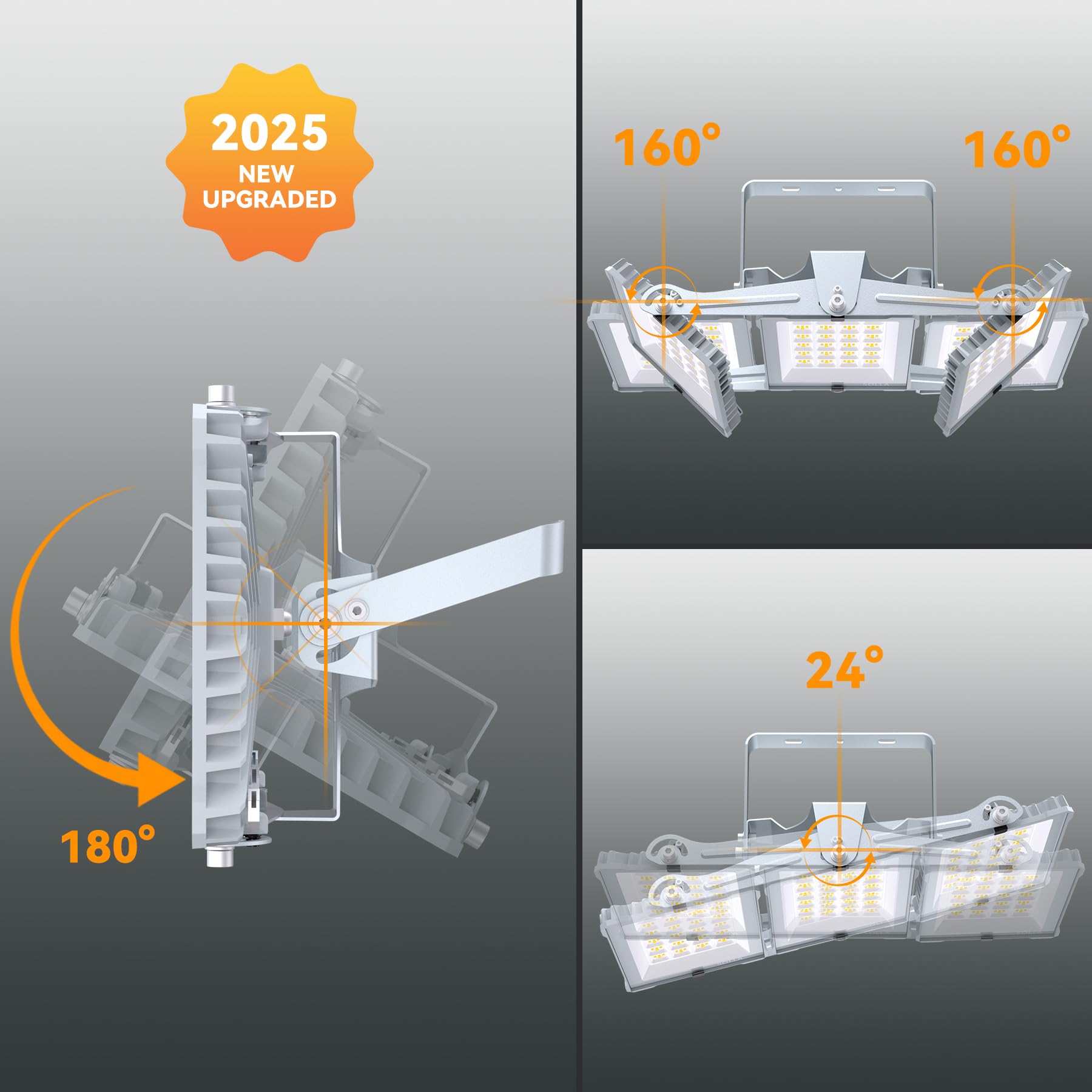 Wide Application:This 300W three-head floodlight is hard-wired and ideal for use in garages, basketball courts, stadiums, warehouses, workshops, parking lots, basements, and more. It provides bright, comfortable lighting that meets a wide range of outdoor lighting needs, ensuring that every corner is well-lit