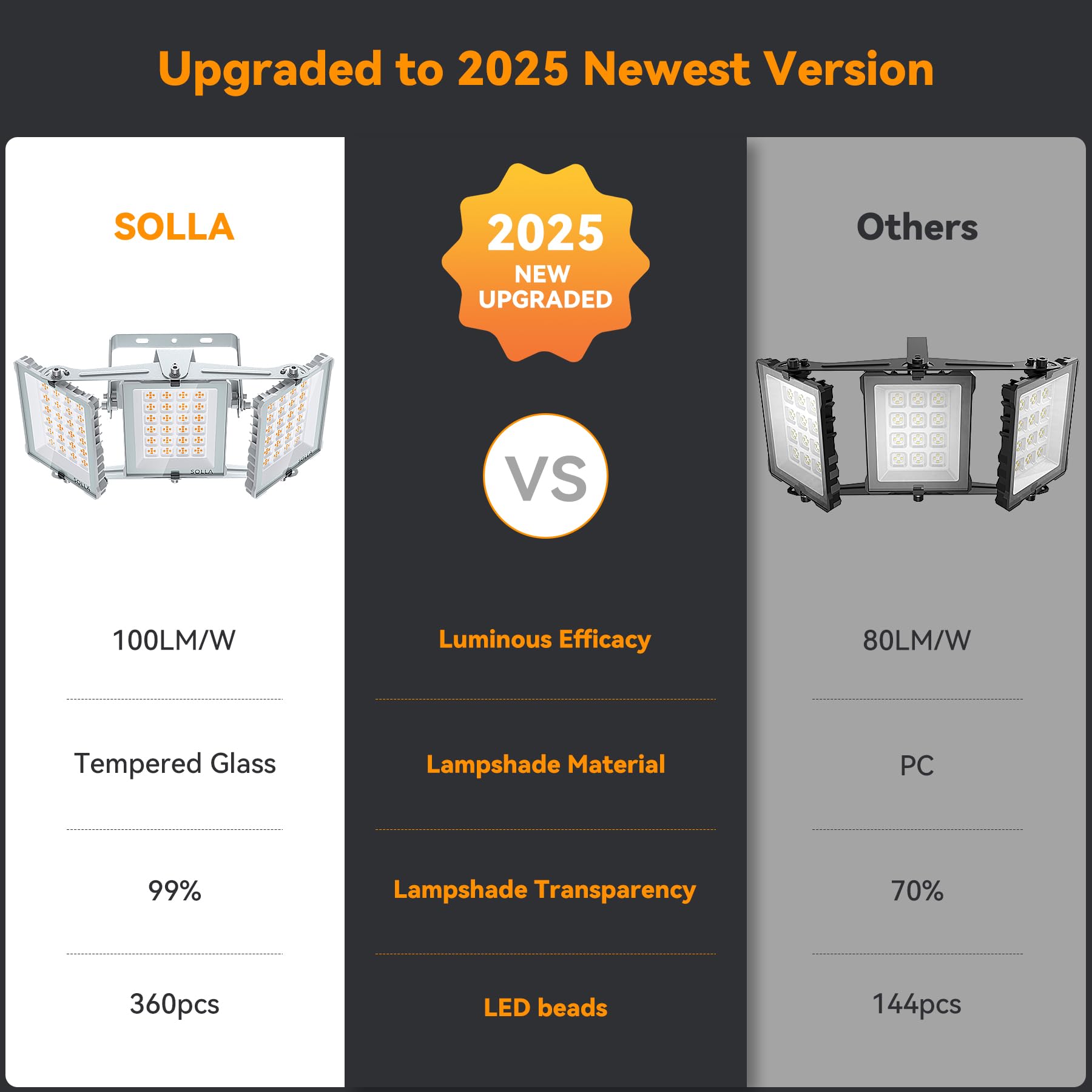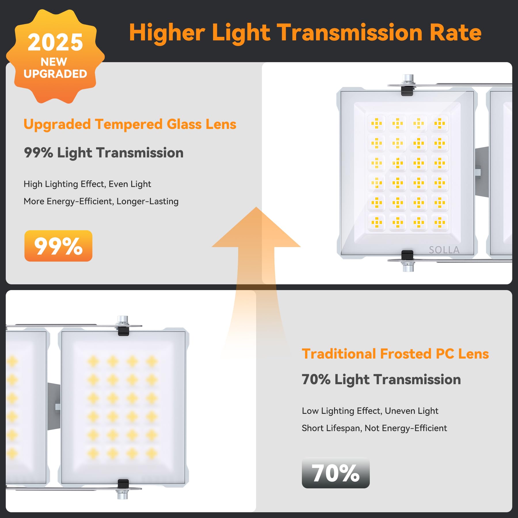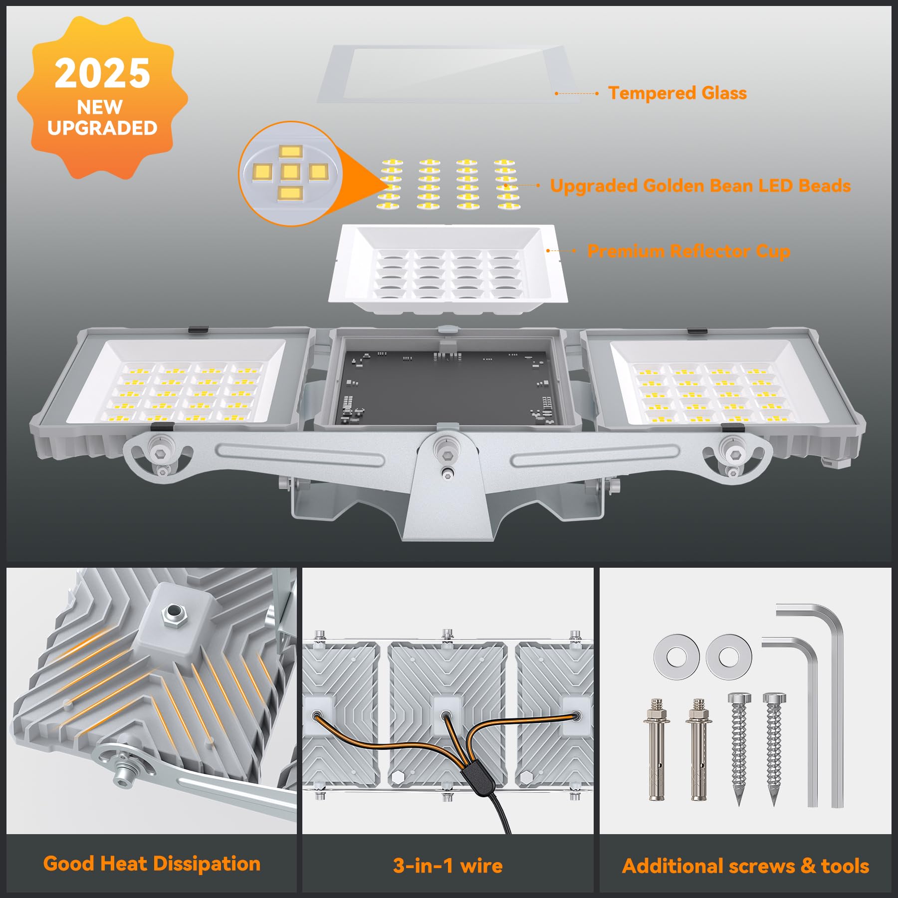 Superior Build and Efficiency: This floodlight features a robust cast aluminum housing and high-strength tempered glass lens for long-lasting durability.It provides 99% light transmittance for clear, bright light. Thick cooling fins improve heat dissipation, ensuring a long lifespan and reliable performance
