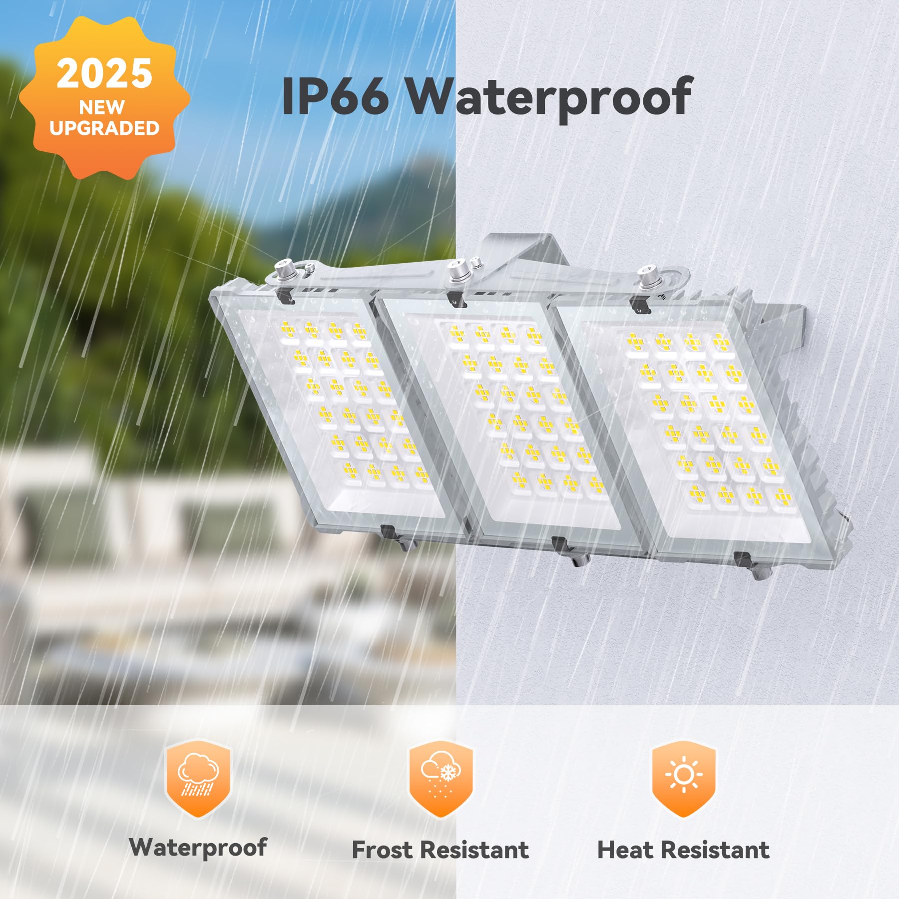 IP66 Waterproof: This floodlight is IP66-rated for waterproof and dustproof protection, performing reliably in harsh weather like rain, snow, heat, or cold. It’s perfect for indoor or outdoor use, lighting up garages, basketball courts, driveways, or entrances with dependable, weather-resistant illumination for added security