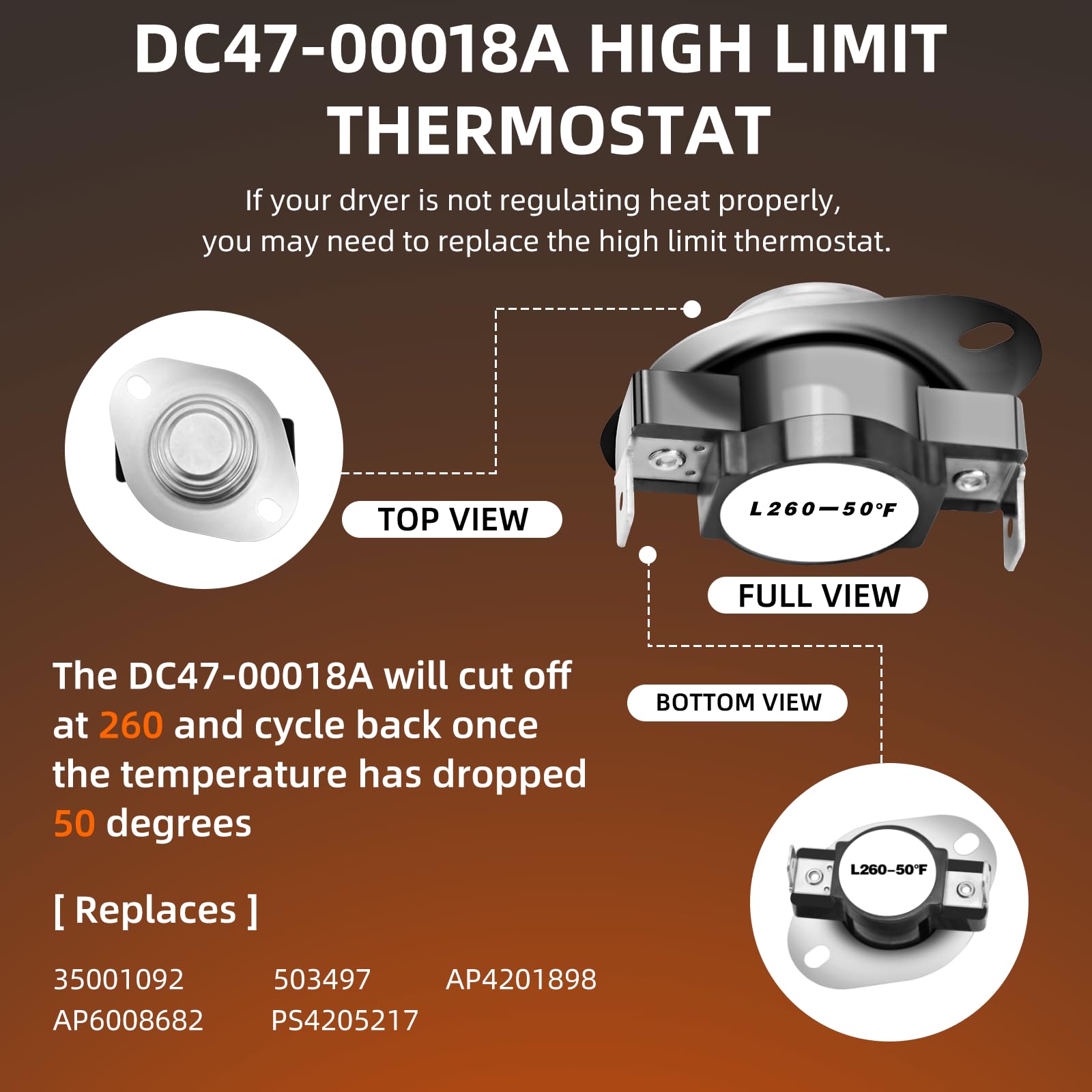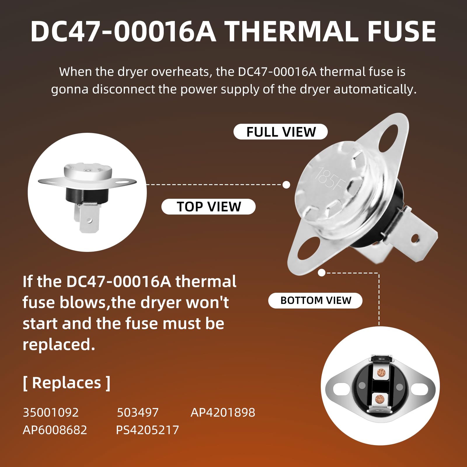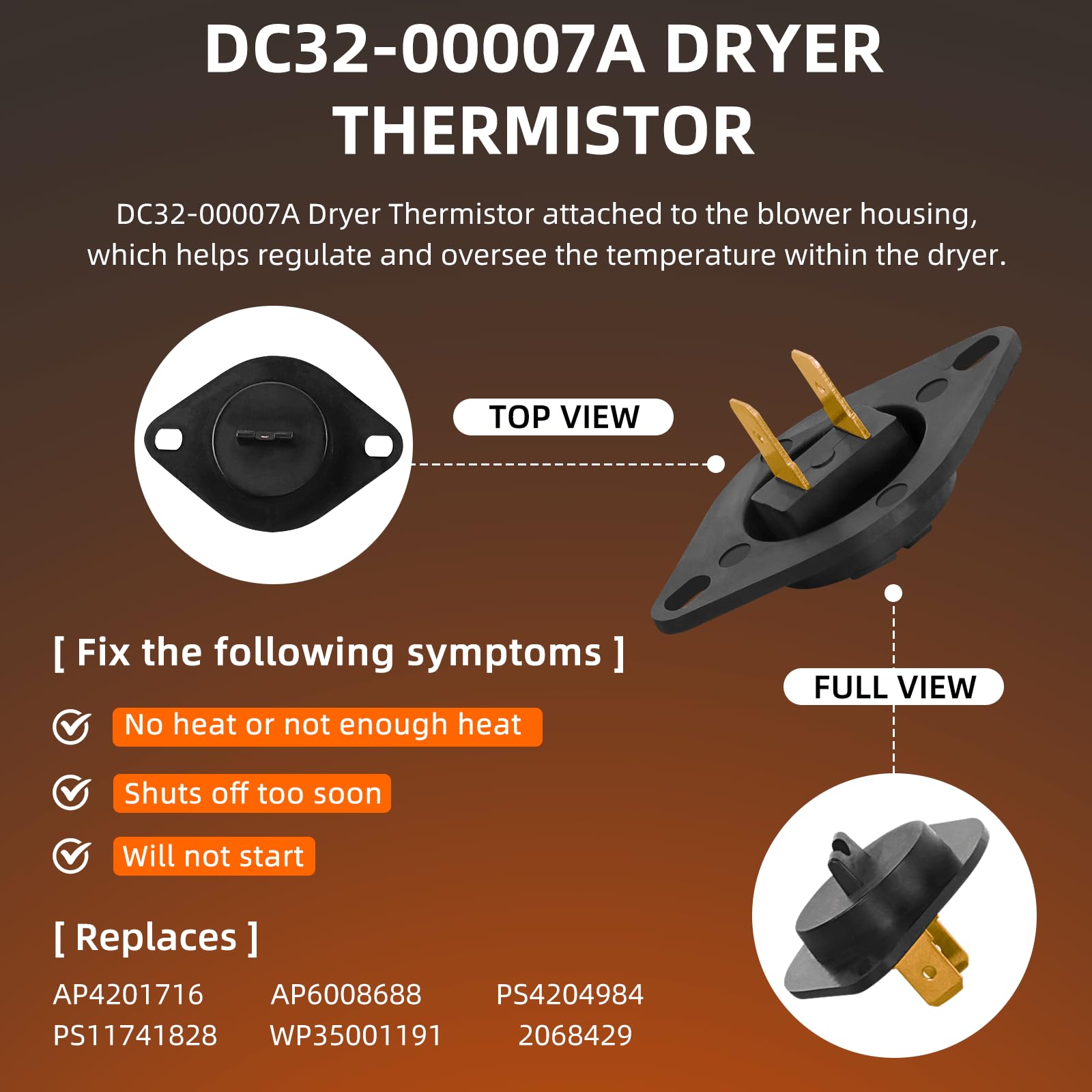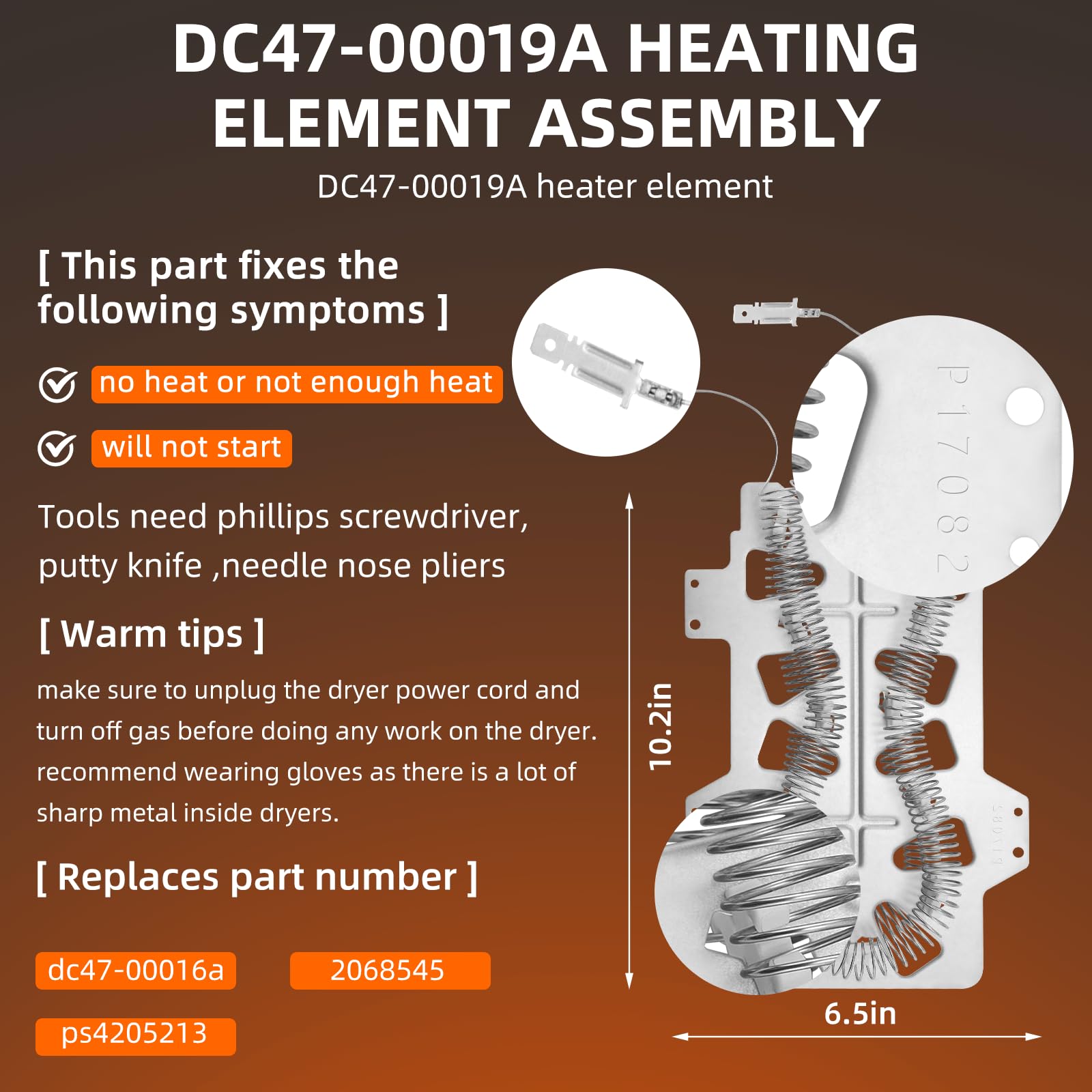 Package Includes: 1x DC47-00019A dryer heating element, 1 x DC47-00018A thermostat, 1 x DC96-00887A thermal fuse, 1 x DC47-00016A thermal fuse, 1 x DC32-00007A thermistor.Pulluty DC47-00019A heating elements have excellent heat and abrasion resistance with up to 95% nickel-chromium content. Heats more evenly. Meets OEM manufacturing standards.