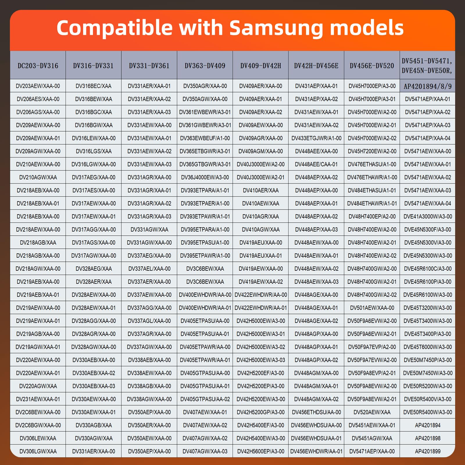Replace Models:DV42H5200EW/A3 DV42H5400EF/A3 DV42H5400EW/A3 DV42H5600EP/A3 DV431AEP/XAA DV431AEW/XAA DV433ETGJWR/A1 DV431AEW/XAA DV433ETGJWR/A1 DV448AEE/XAA DV448AEP/XAA DV501AEW/XAA DV50F9A6EVW/A2 DV50F9A7EVP/A2 DV50F9A7EVW/A2 DV50F9A8EVP/A2 DV50F9A8EVW/A2 DV520AEW/XAA DV5451AEW/XAA DV5451AEW/XAC DV5471AEP/XAA DV5471AEW/XAA DVE45N5300F/A3 DVE45N5300V/A3 DVE45R6100C/A3 DVE45R6100P/A3 DVE45R6100V/A3 DVE45R6100W/A3 DVE45T3200W/A3 DVE45T3400P/A3 DVE45T3400V/A3 DVE45T3400W/A3 DVE45T6000P/A3