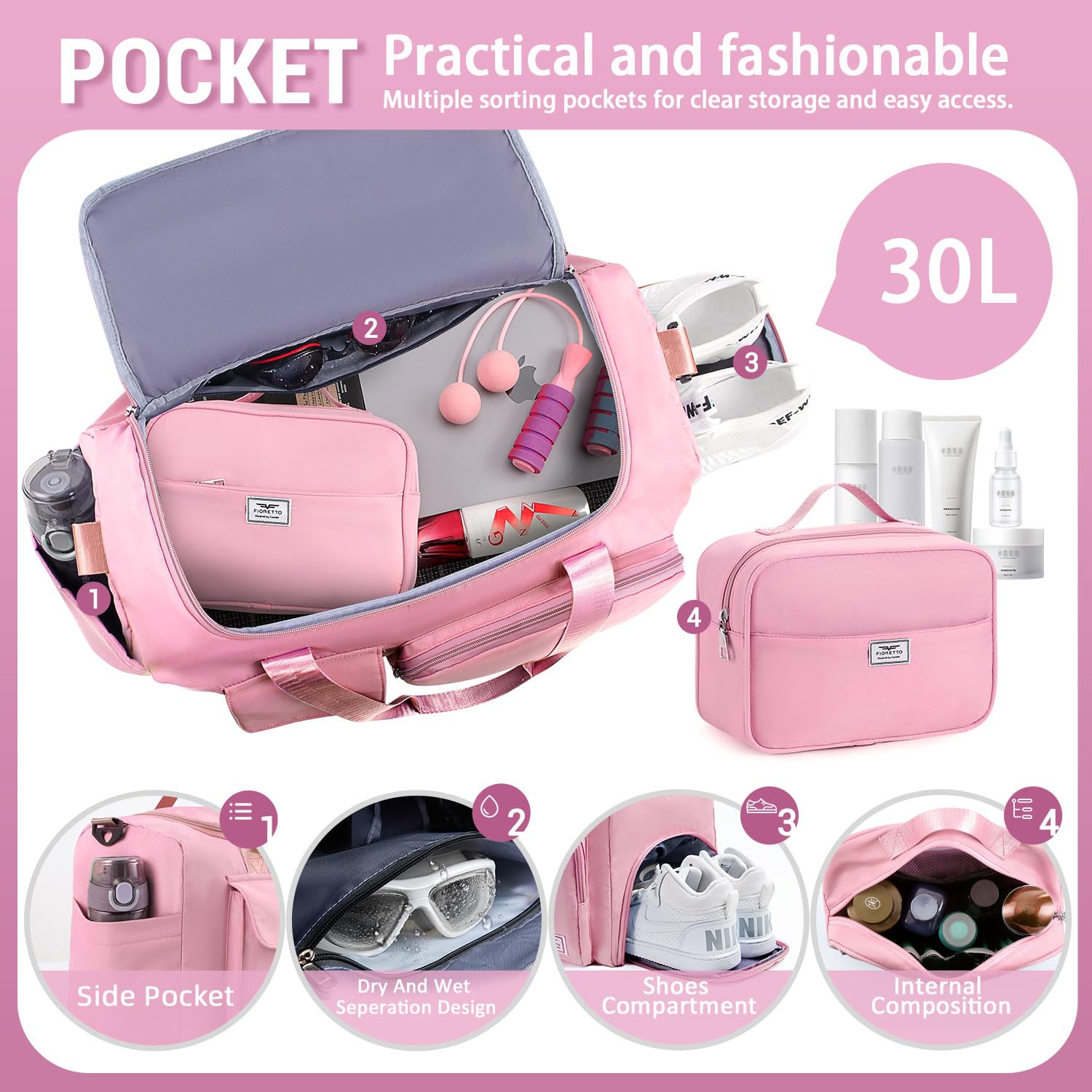 Wet Pocket & Shoe Compartment: The wet pocket is perfect for storing sweaty clothes or towels after your workout; The shoe compartment allows you to easily store and access your gym shoes without dirtying the main compartment