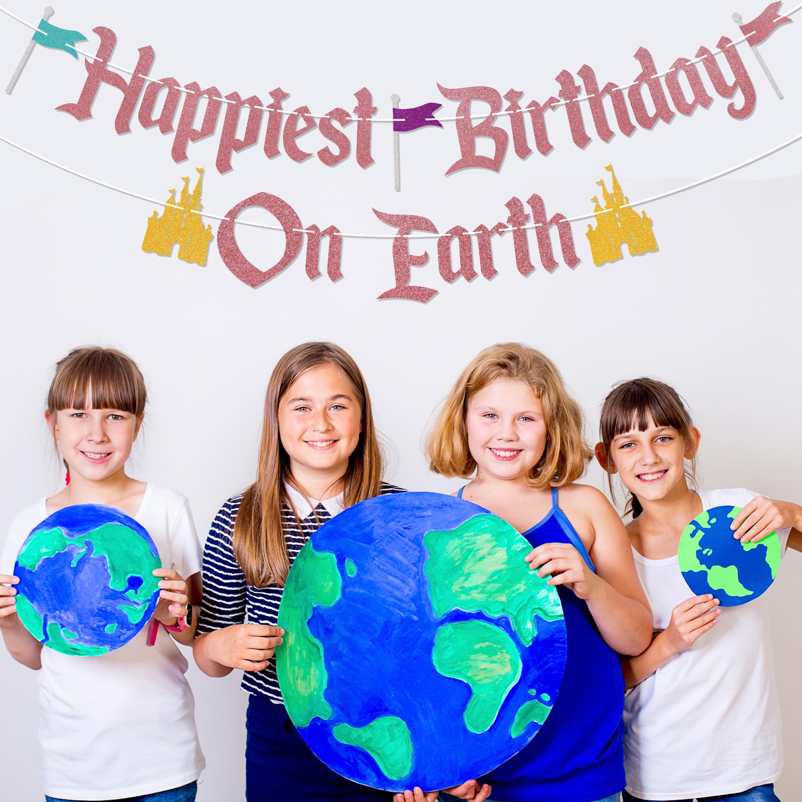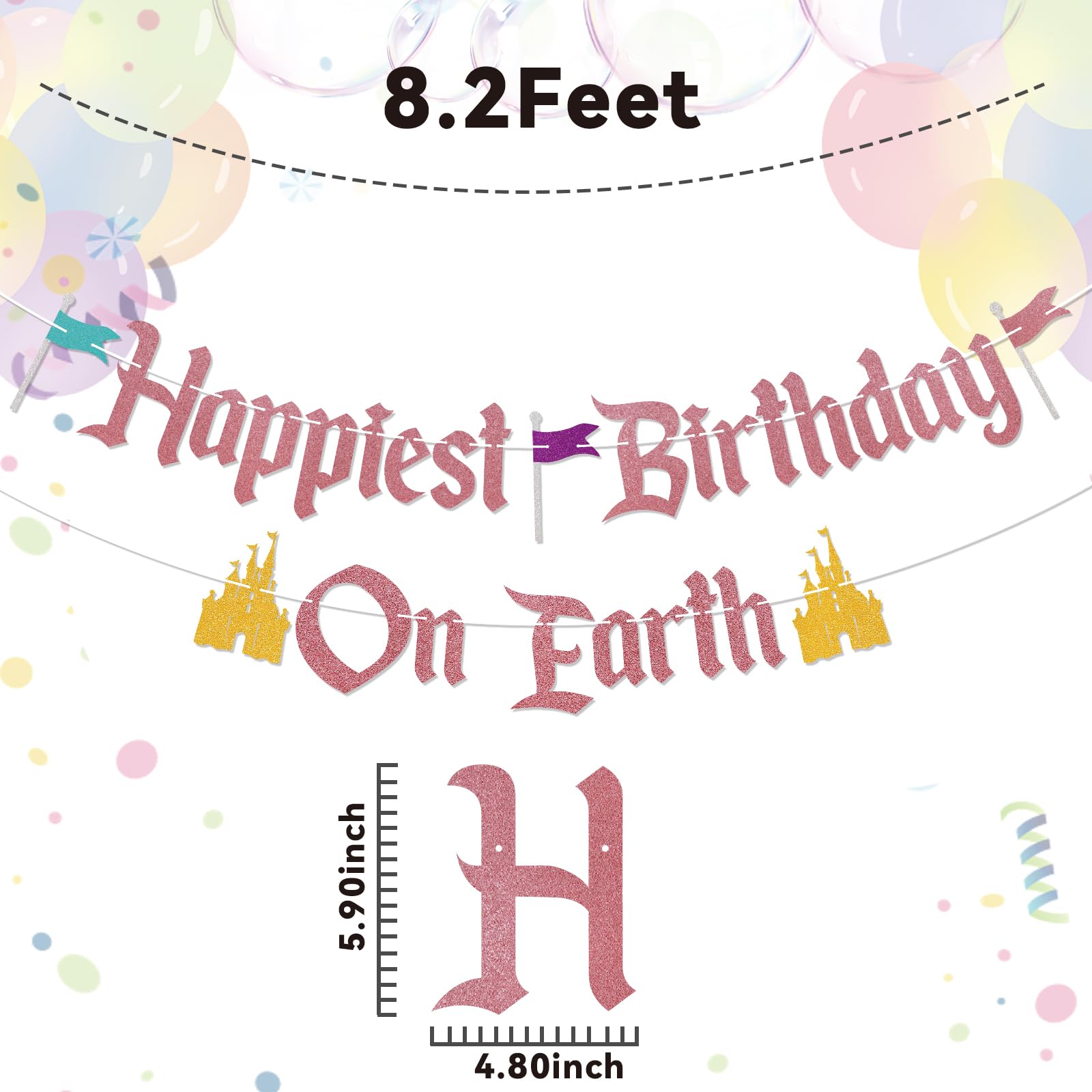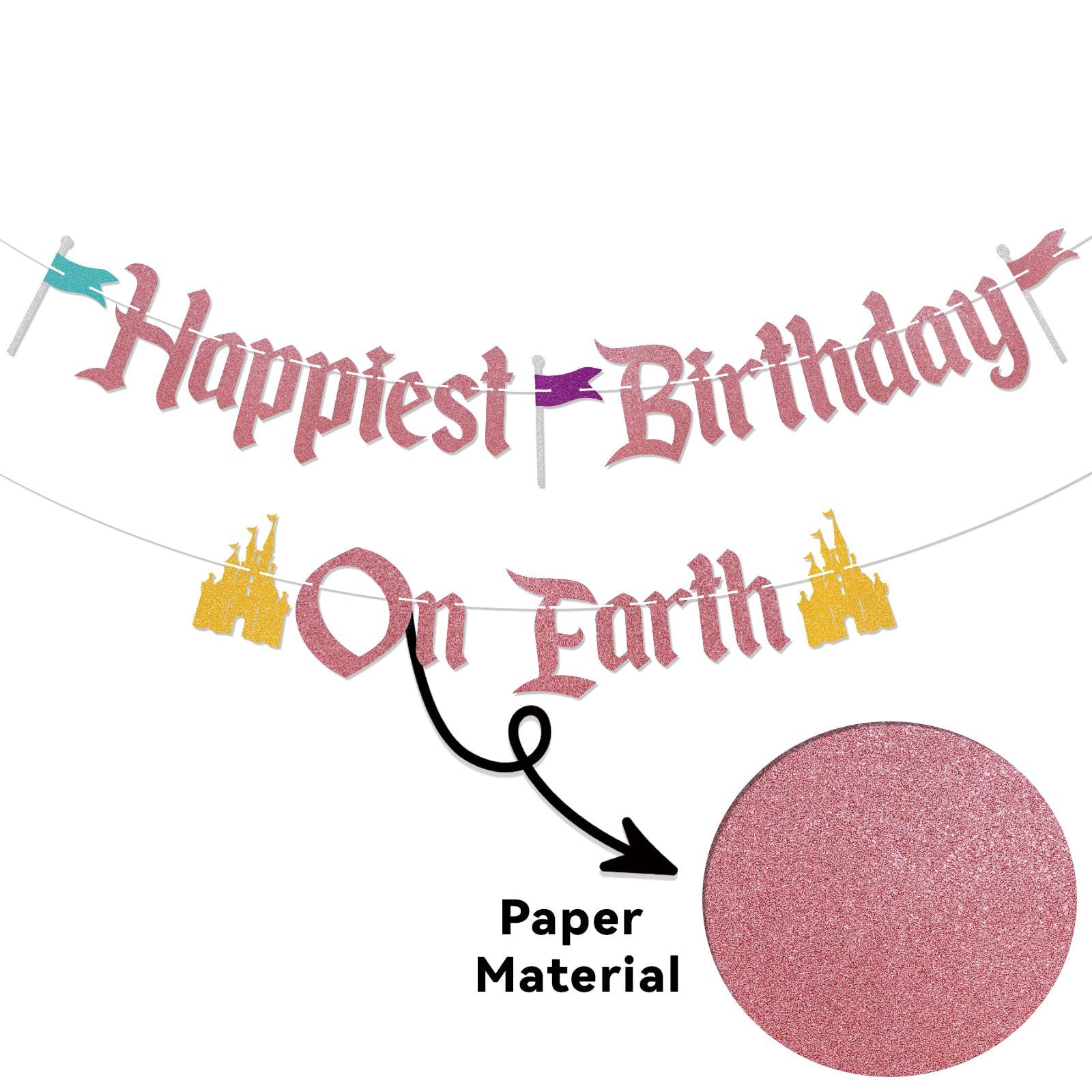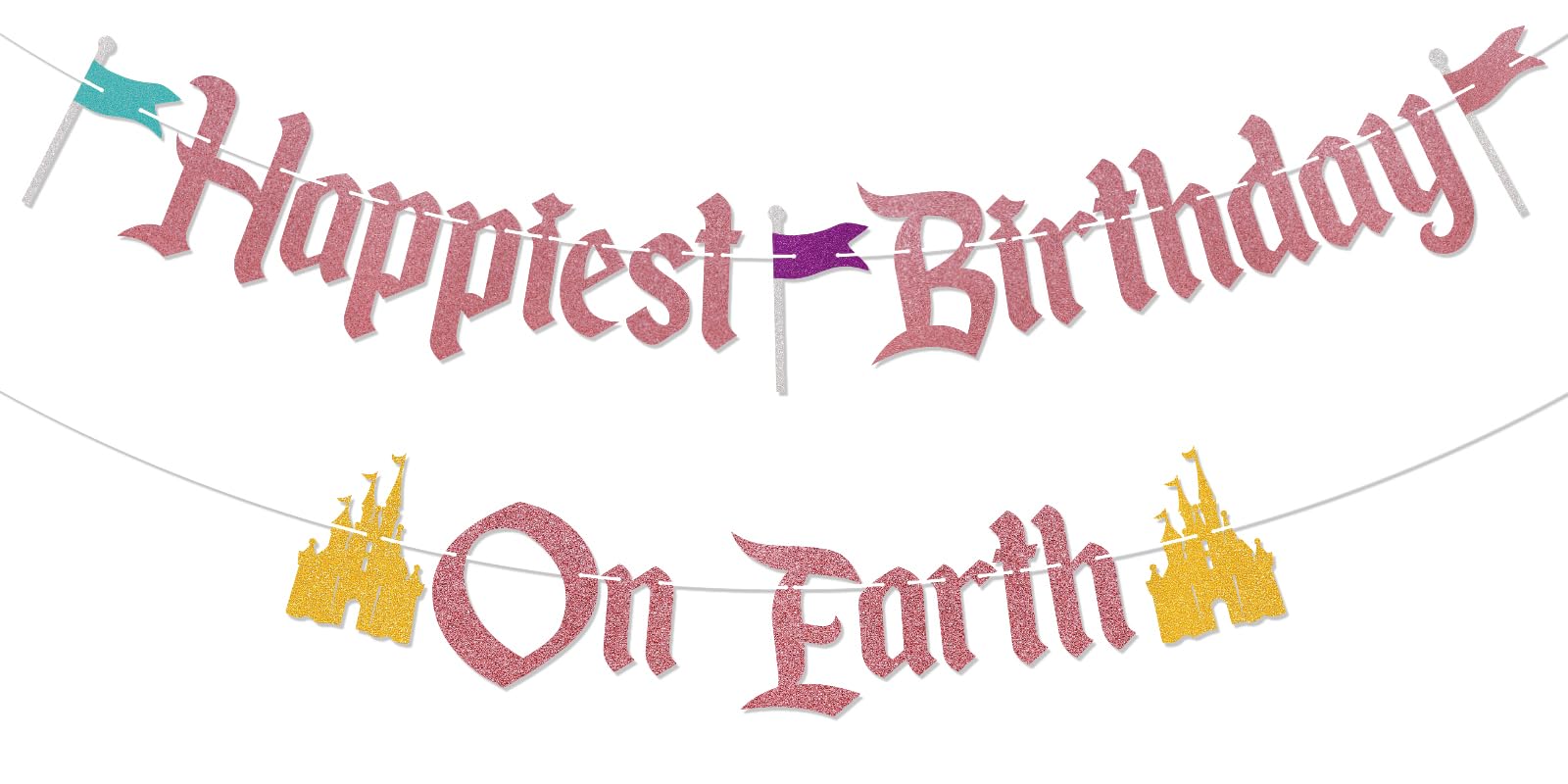 ASSEMBLED - Unlike other banners, the Happiest Birthday On Earth banner you receive is assembled, so you don't need to waste time assembling it, you can use it directly! UNIQUE DESIGN - our banners are made from beautiful glitter paper, ensuring that our Happiest Birthday On Earth banners are of the highest quality and stand out, and will also make your Castle Them Baby Shower/Birthday Party unique, which will be a great addition to your Birthday Party! SPECIAL DESIGN & PREMIUM QUALITY - Thick, high quality cardstock for durability, each letter measures 5''-7'' and is made from 300 gram glitter paper stock. You can use them to decorate walls, mantels, banisters, windows, dessert tables, doorways, or even as a photo backdrop. A BIG HIT - This glittery Happiest Birthday On Earth banner is designed for Princess Theme Birthday Party. It's a way for people to say Happy Birthday.This year, birthday party will be even more cheerful with this Happiest Birthday On Earth banner. PACKAGE INCLUDES - 1 piece of glittery banner that spells out Happiest Birthday On Earth.