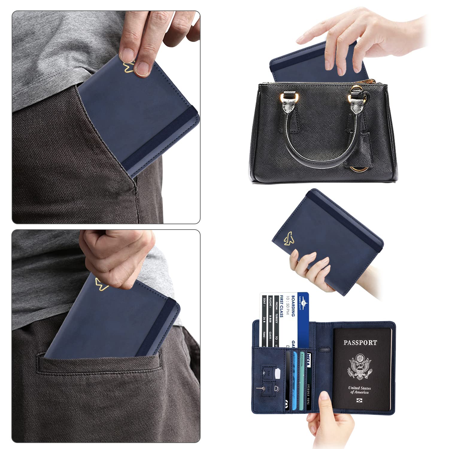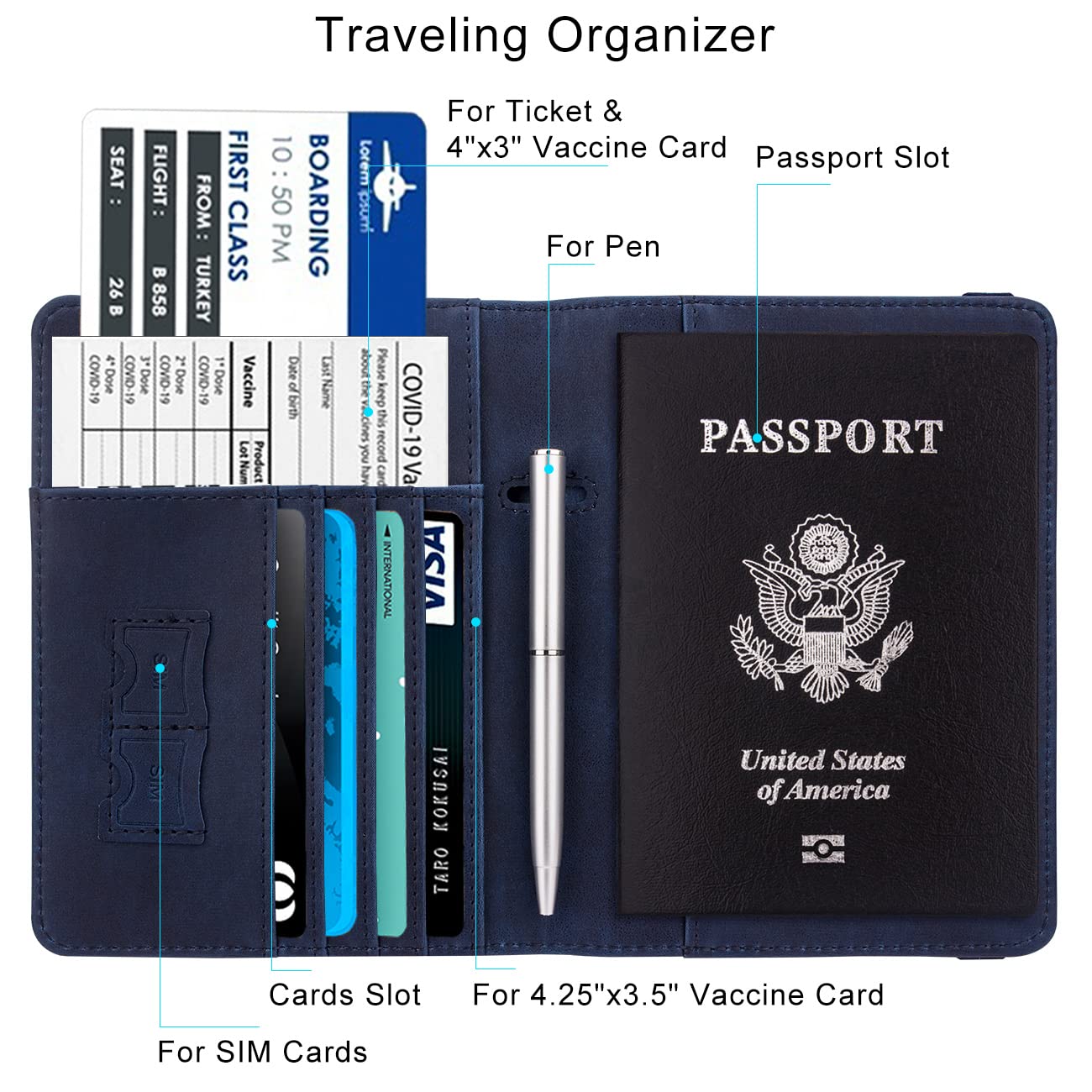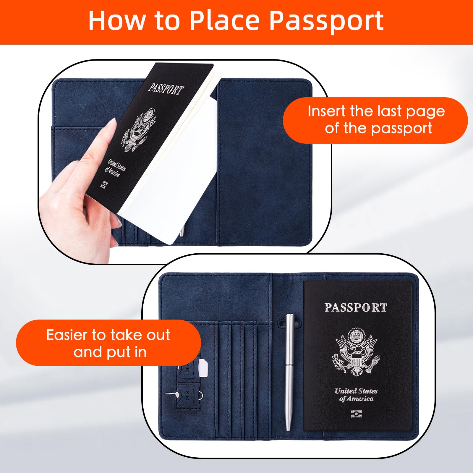 Practical Travel Accessories: This passport cover and card wallet has multiple slots to hold business cards, credit cards, cash, boarding passes sufficiently, two SIM slots for SIM cards, a pen slot for pen. Allows convenient access to information during boarding and transit