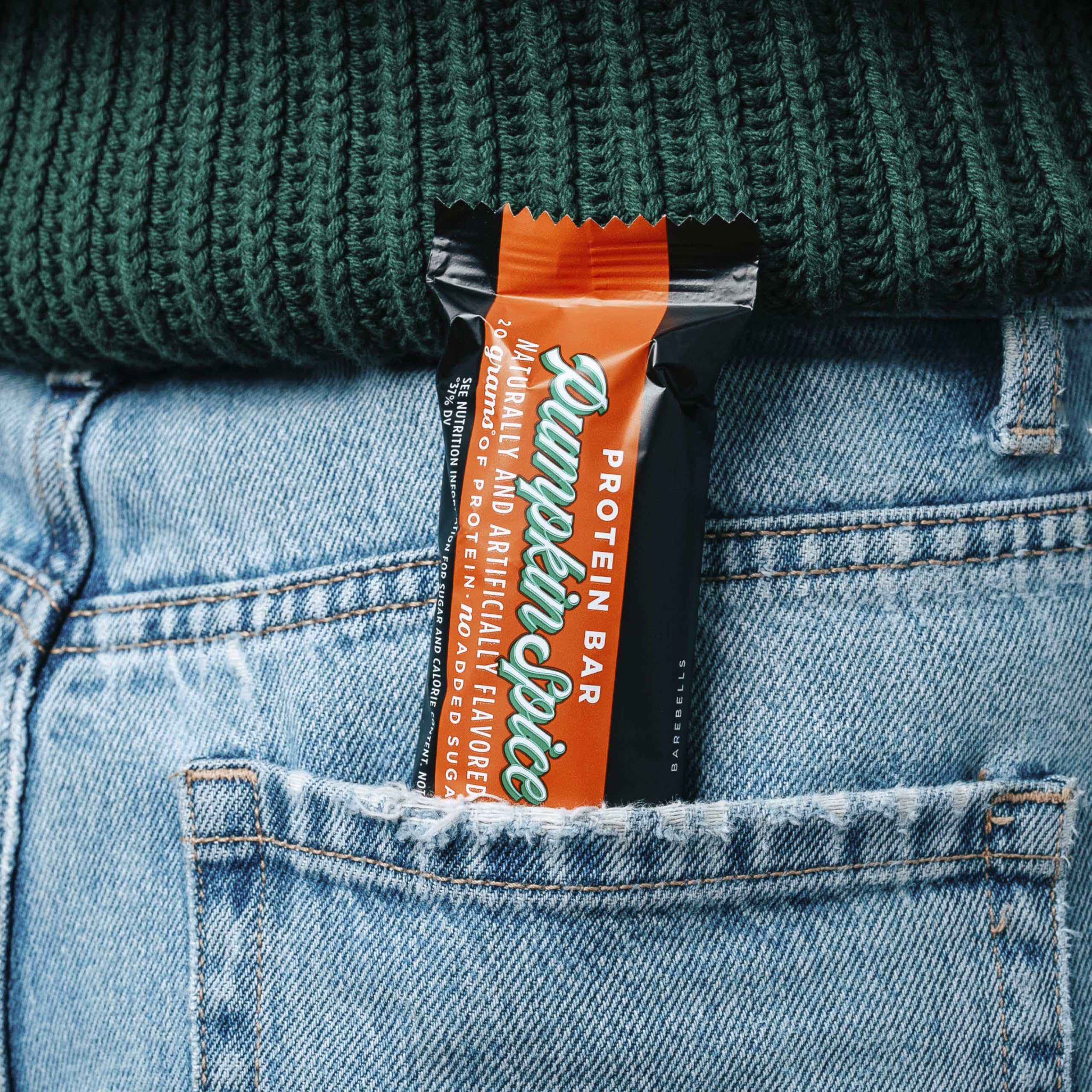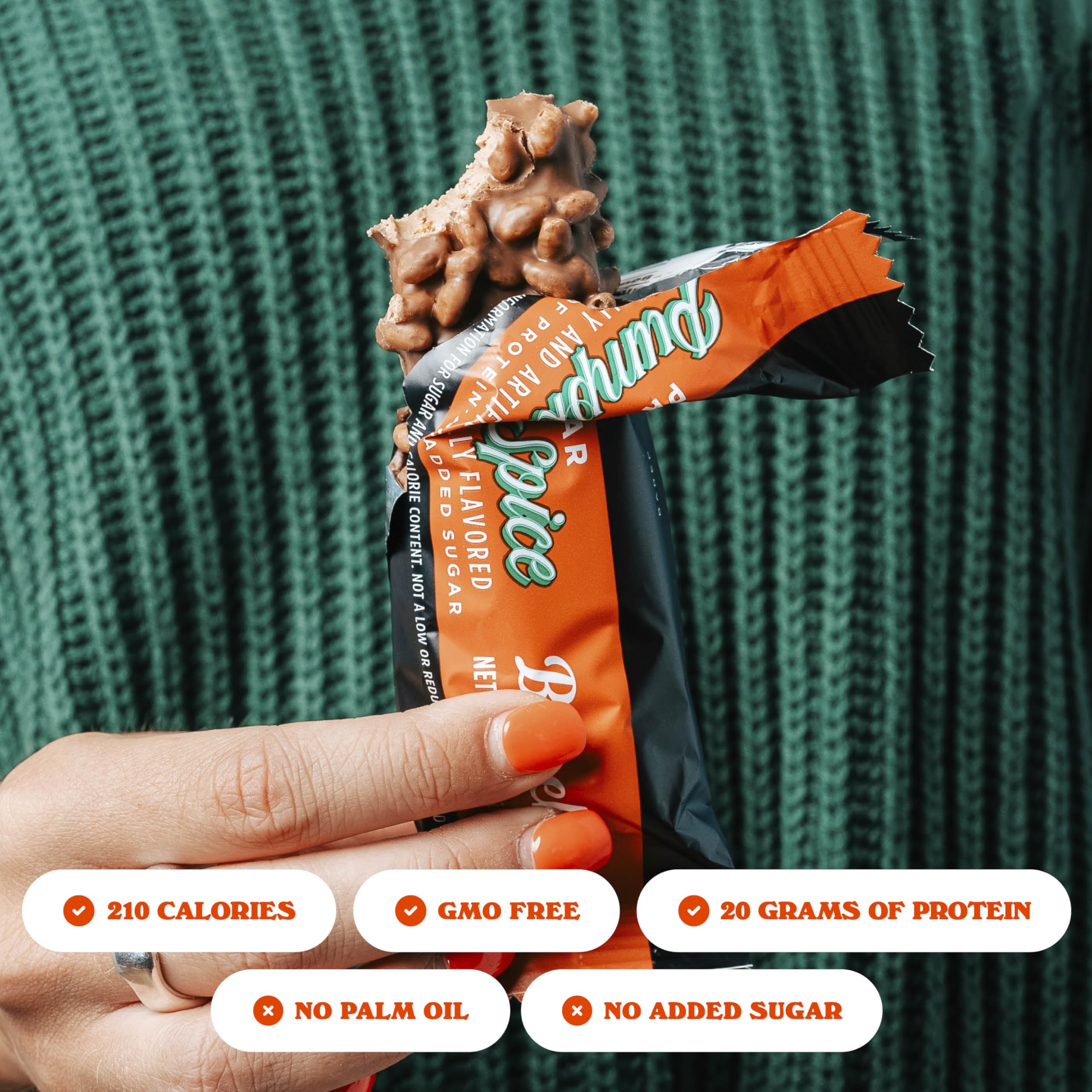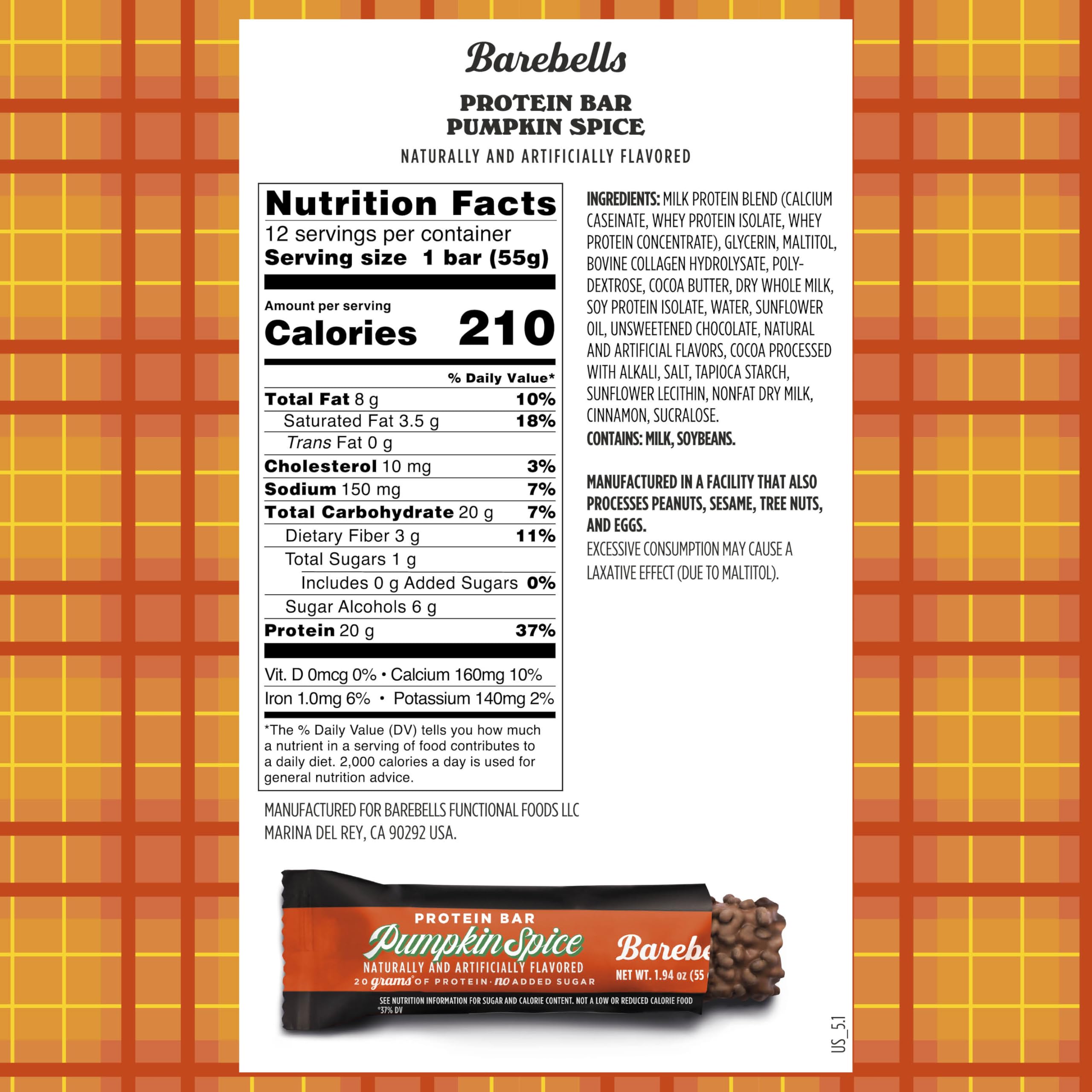 BAREBELLS PUMPKIN SPICE PROTEIN BAR - 12 individual delicious Barebells protein bars! Tired of eating bars that taste like cardboard? Pumpkin Spice is the ultimate fall flavor inspired by your favorite seasonal treat, with warm notes of pumpkin, cinnamon, and spice. This bar is sure to satisfy any autumn cravings. The best part; Pumpkin Spice has 20 grams of protein and *no added sugar. This protein bar is your perfect post-workout snack!