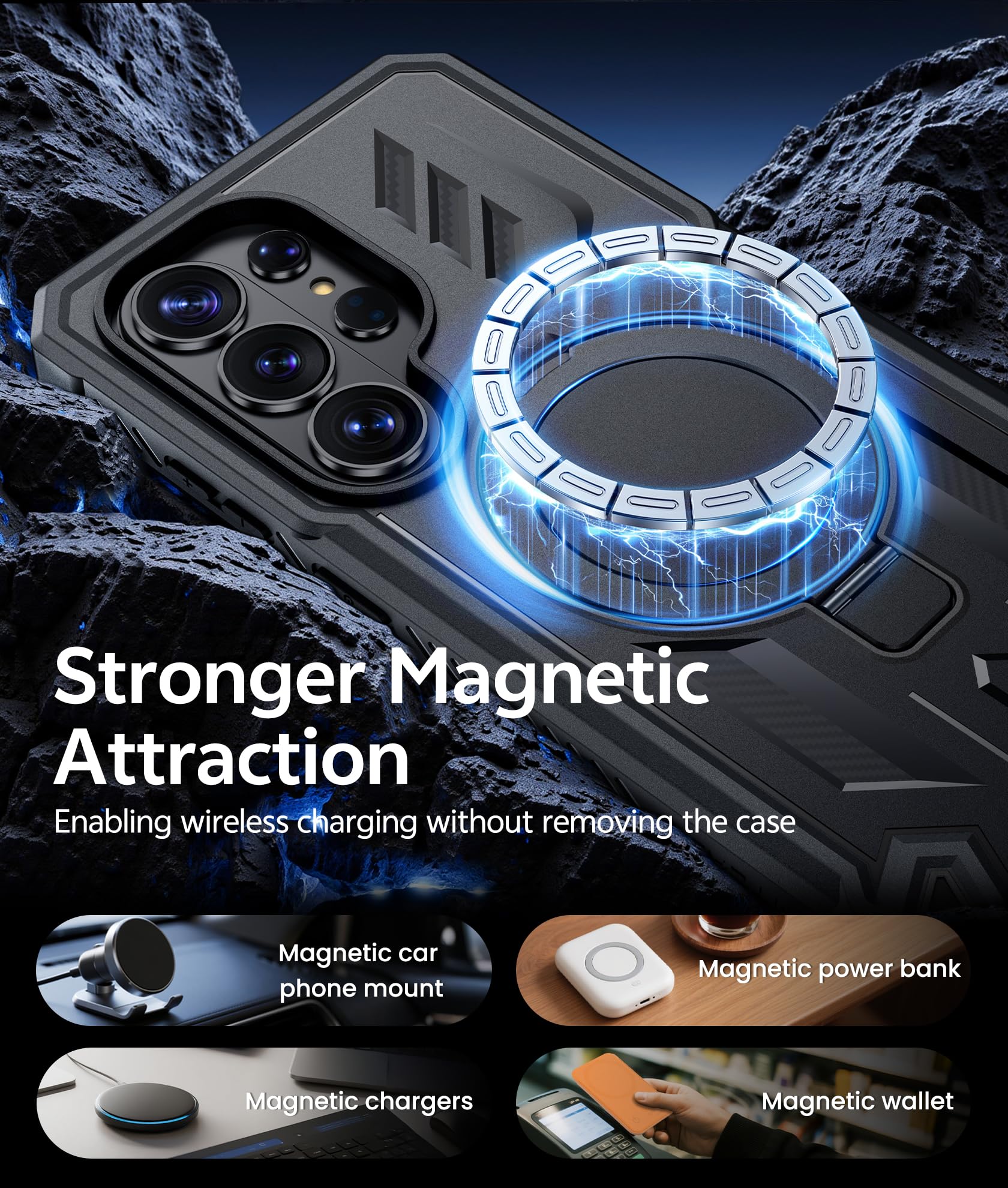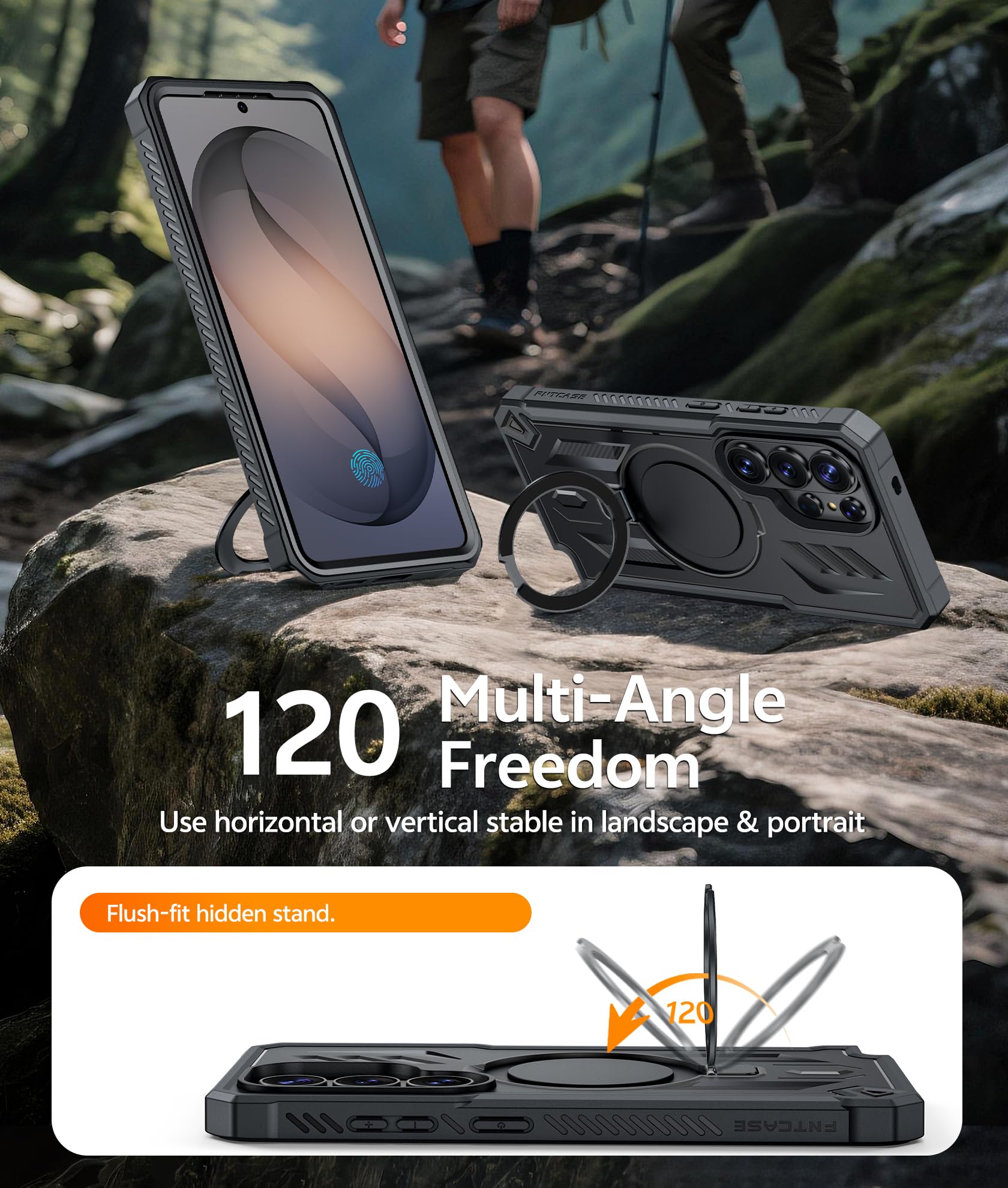 Integrated Magnetic Kickstand: The ring stand for MagSafe transforms your S26 Ultra into a versatile hands-free hub. Easily attach accessories, then adjust the stand to the perfect angle for video watching during your commute, portrait video calls at your desk, following recipes in the kitchen, or outdoor entertainment—all with stable, adjustable support. When closed, it lies perfectly flat for a seamless profile.