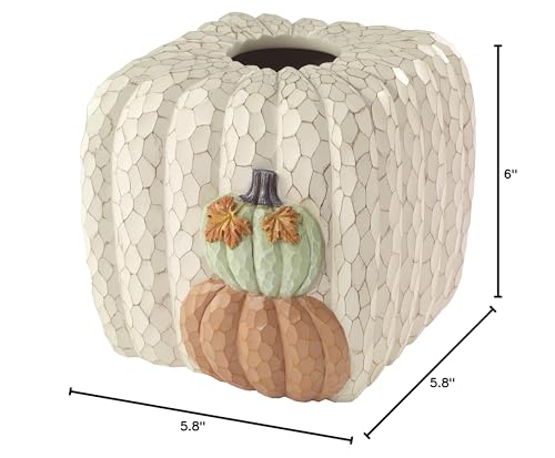The Avanti Grateful Patch Tissue Box Cover features two stacked textured pumpkins in light orange and aqua on the front of the faux carved wood, off-white base. Made of durable, hand-painted resin, 5.8" L x 5.8" W x 6" H. The perfect addition to any décor and any bedroom, bathroom, kitchen, office.