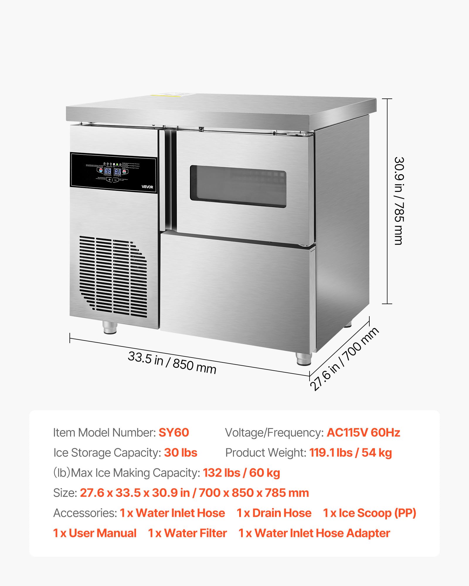 Prep Above, Ice Below: The 27.6 x 33.5 in top provides a large surface for food prep or equipment setup, while the bottom ice machine delivers efficient ice production. The 1.57 in thick stainless steel top doubles as a high-load work surface